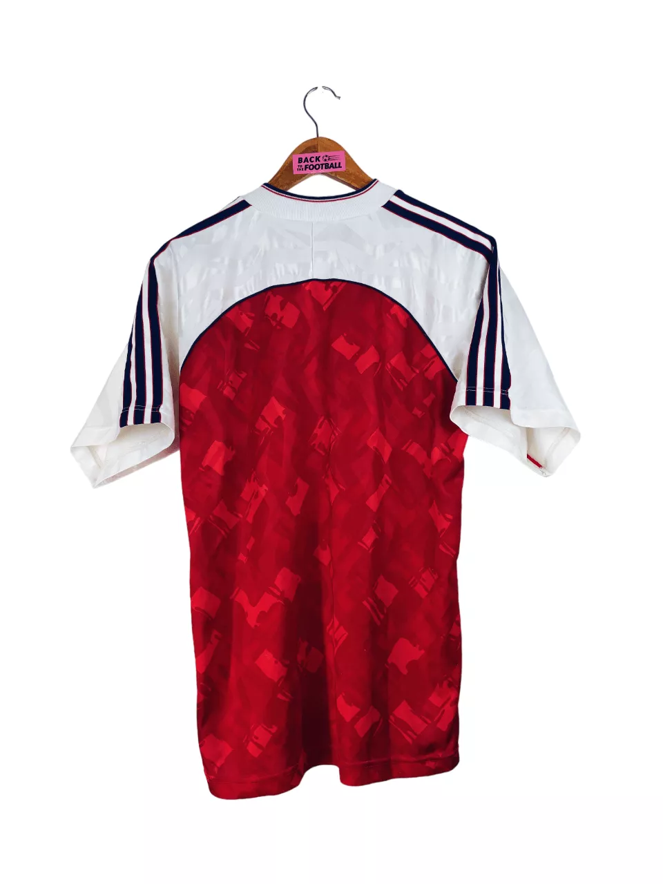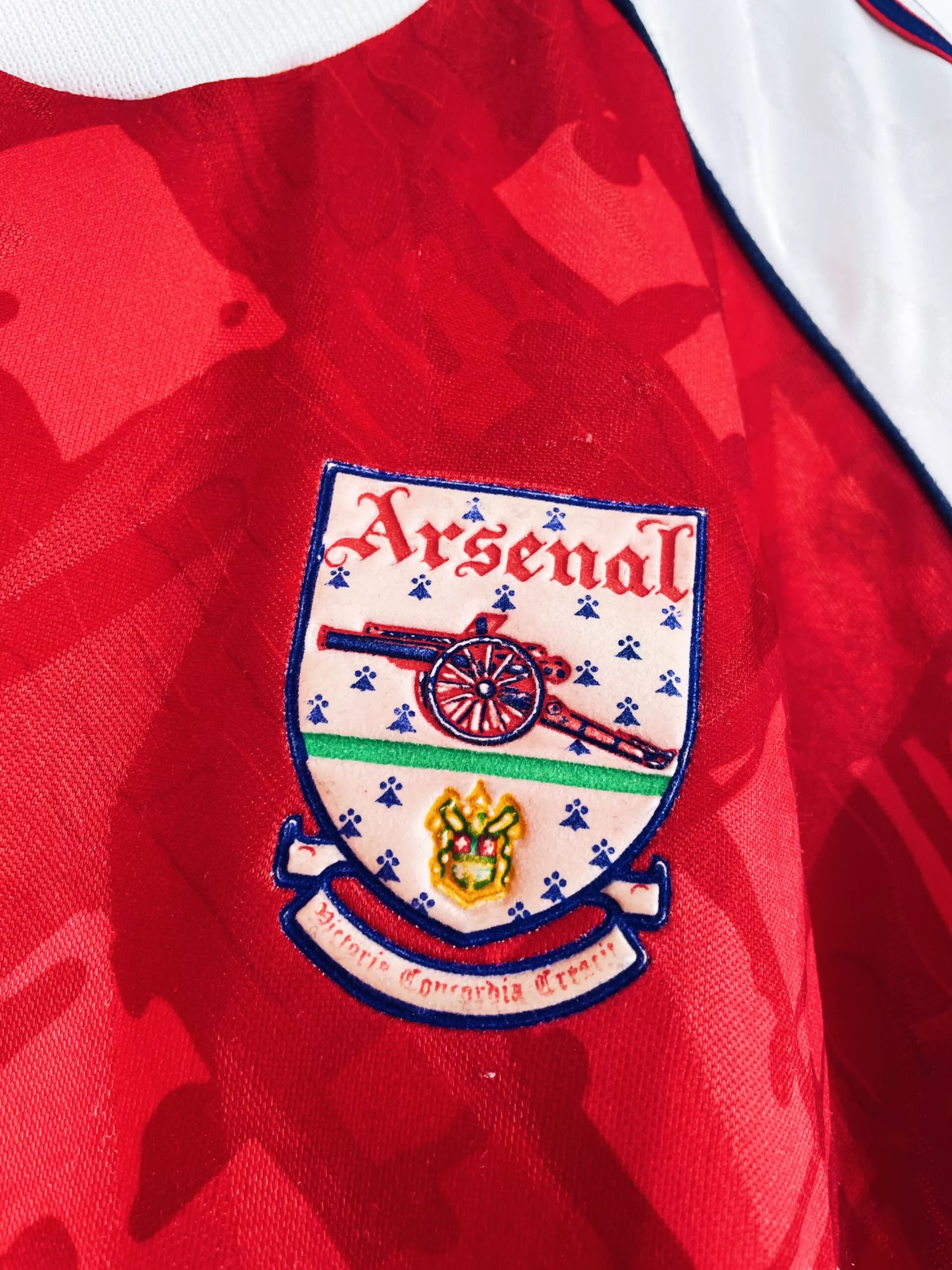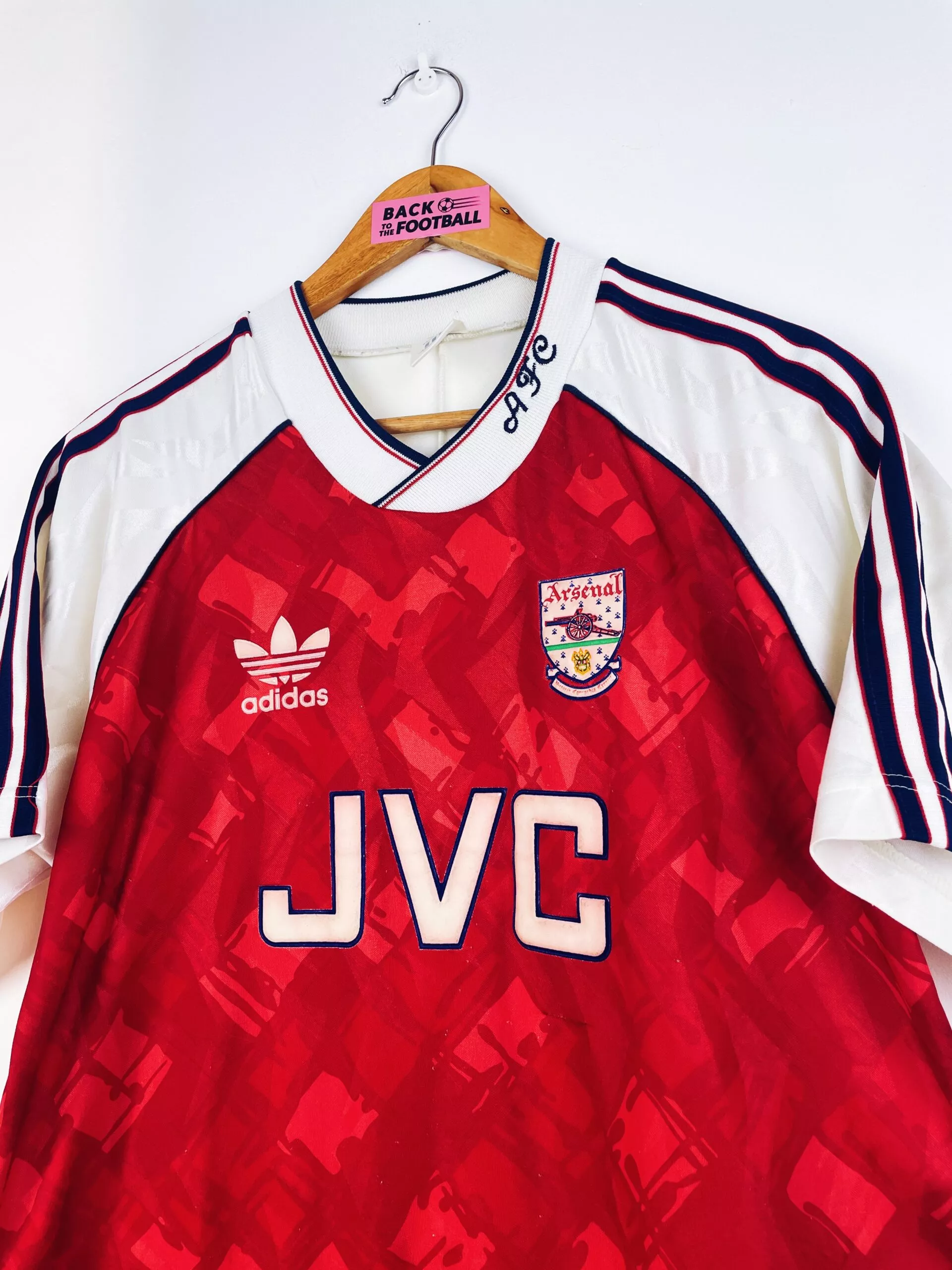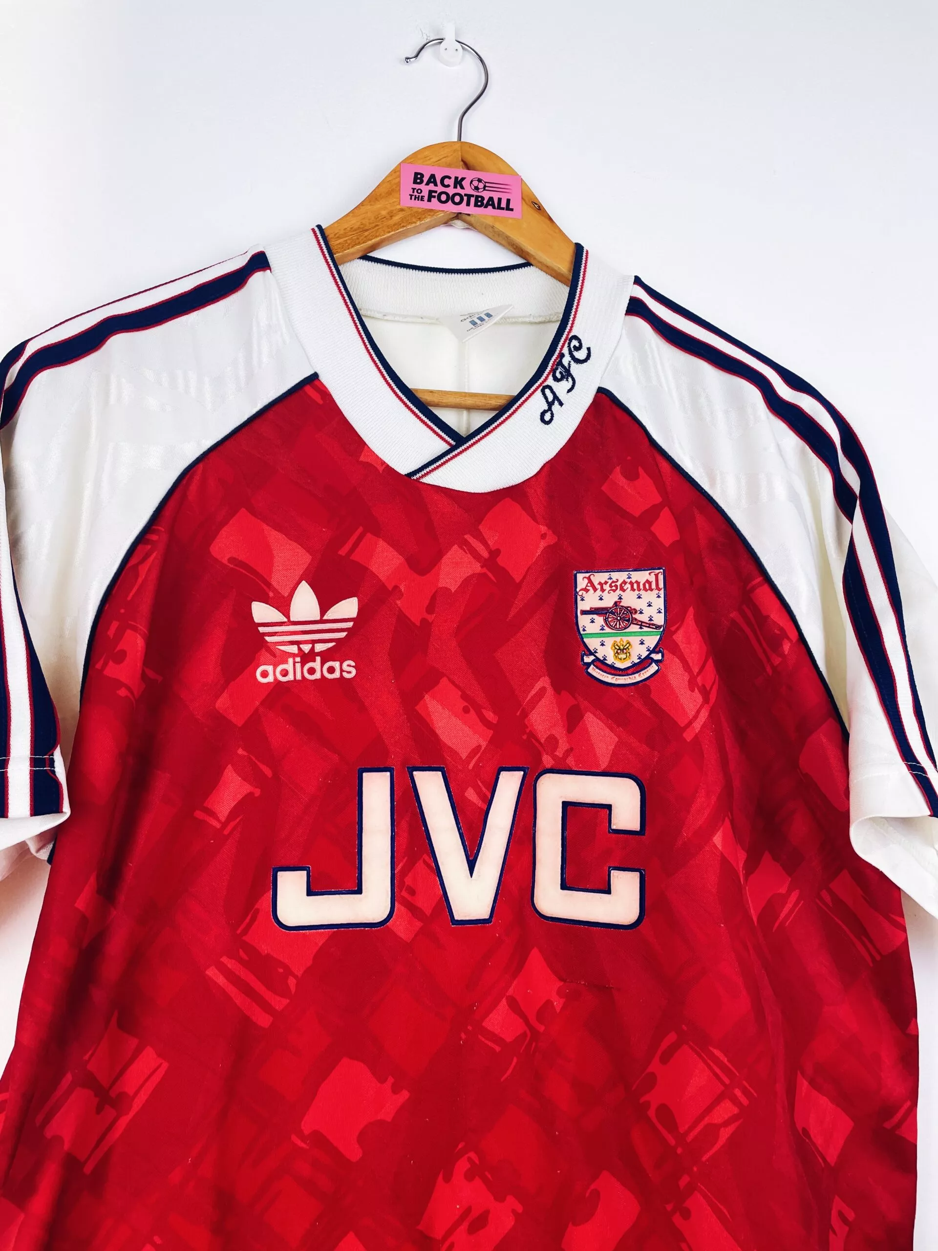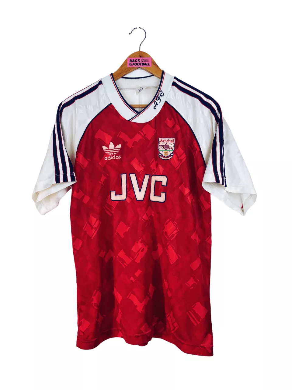 Taille : L Si tu veux plus de détails, tu peux nous contacter par mail ou sur les réseaux 😉 Etat : 7.5/10, très bon état, mais quelques légères bouloches, un accro et le sponsor JVC a perdu de sa blancheur (voir photos) Le maillot : maillot vintage domicile d’Arsenal 1990/1992. L’écusson, le logo Adidas et le sponsor JVC sont en feutrine. Les motifs sont magnifiques. Très beau maillot rétro d’Arsenal ! Histoire : la première saison, les Gunners remportent la Premier League devant Liverpool. Ils iront jusqu’en demi de FA Cup mais seront éliminés par le rival Tottenham… Alan…