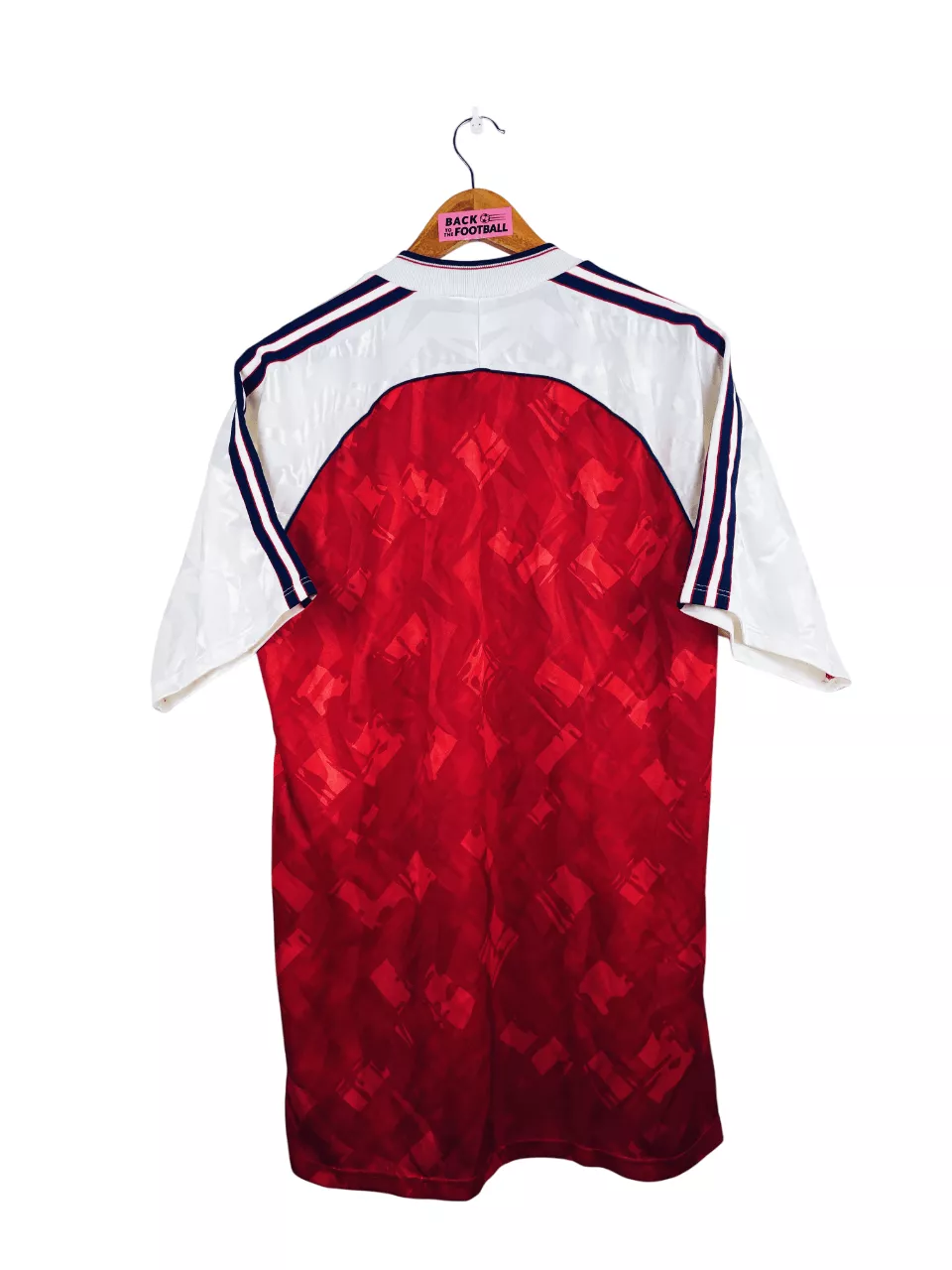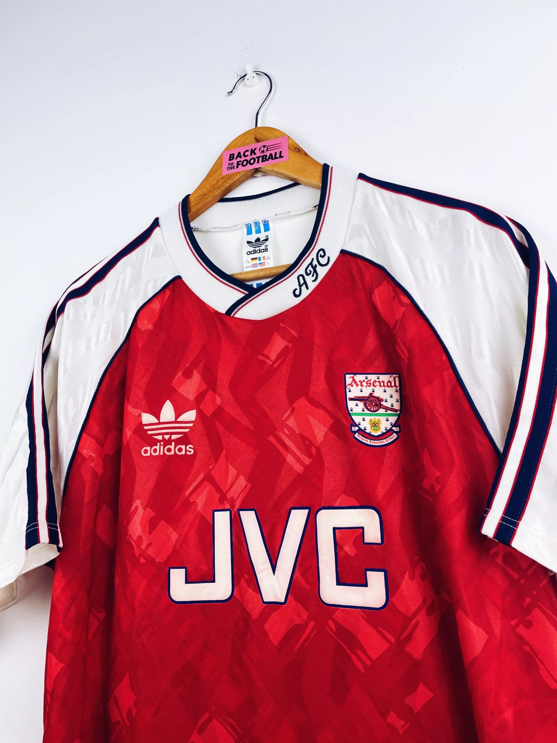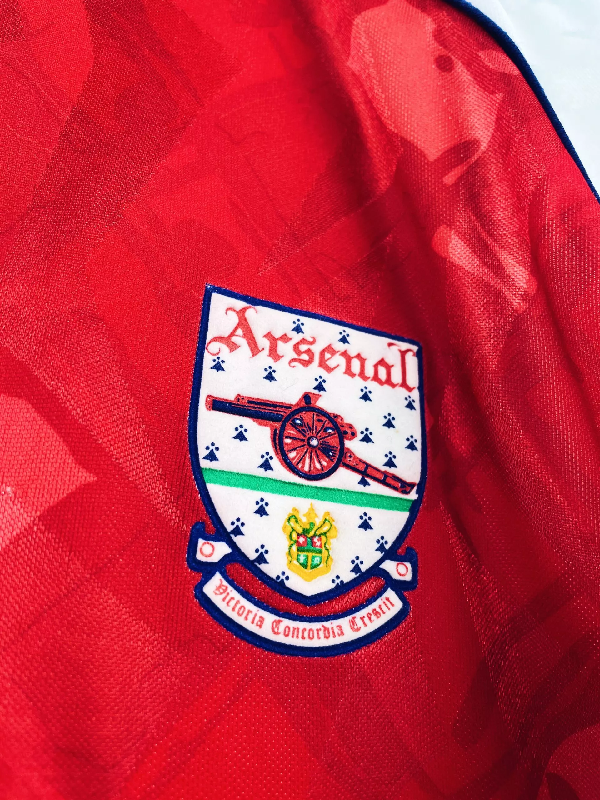 Taille : L Si tu veux plus de détails, tu peux nous contacter par mail ou sur les réseaux 😉 Etat : 8.5/10, excellent état Le maillot : maillot vintage domicile d’Arsenal 1990/1992. L’écusson, le logo Adidas et le sponsor JVC sont en feutrine. Les motifs sont magnifiques. Très beau maillot rétro d’Arsenal ! Histoire : la première saison, les Gunners remportent la Premier League devant Liverpool. Ils iront jusqu’en demi de FA Cup mais seront éliminés par le rival Tottenham… Alan Smith marquera 27 buts. La saison suivante, les Londonniens n’arriveront pas à garder leur titre avec une 4ème…