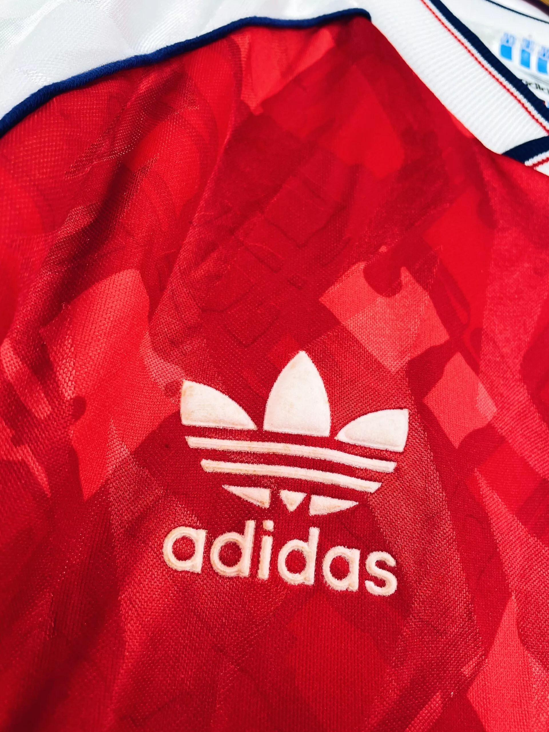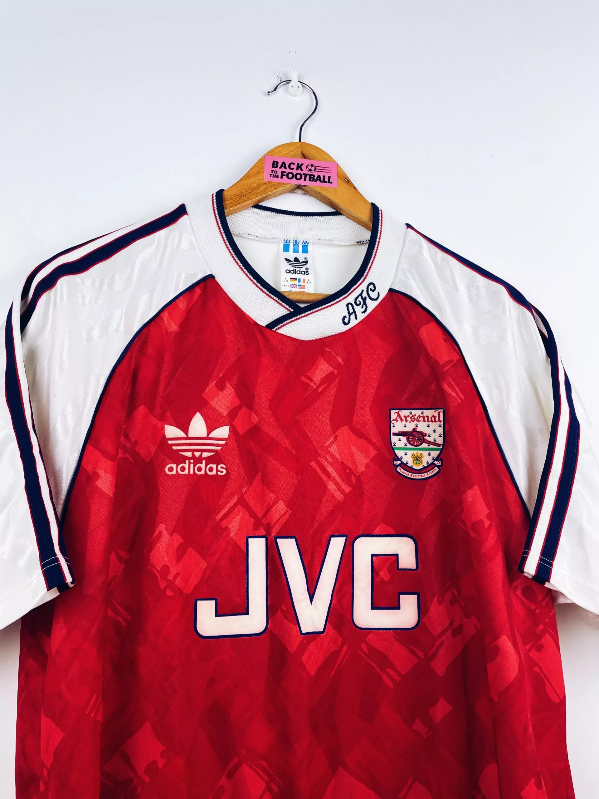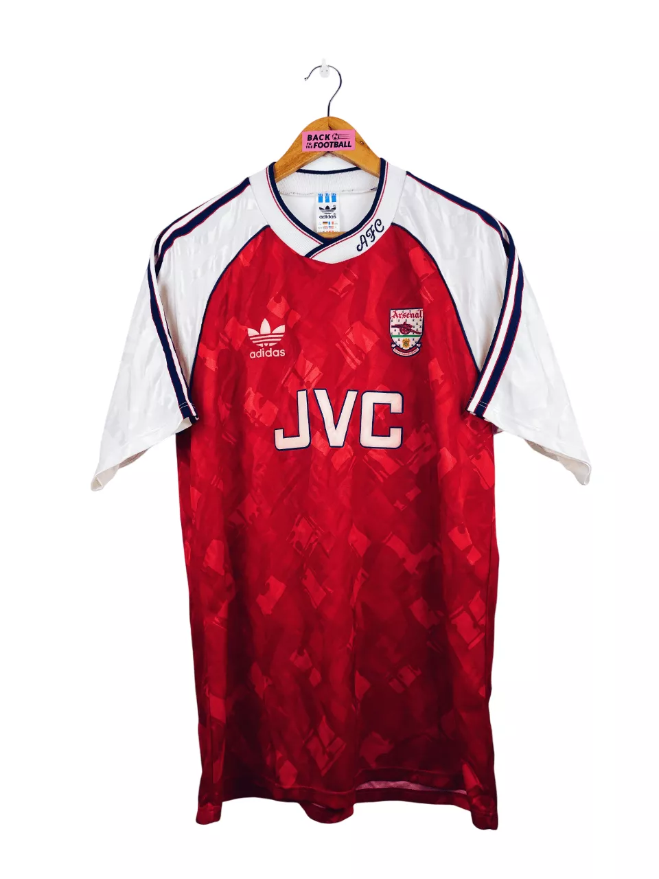Taille : L Si tu veux plus de détails, tu peux nous contacter par mail ou sur les réseaux 😉 Etat : 8.5/10, excellent état Le maillot : maillot vintage domicile d’Arsenal 1990/1992. L’écusson, le logo Adidas et le sponsor JVC sont en feutrine. Les motifs sont magnifiques. Très beau maillot rétro d’Arsenal ! Histoire : la première saison, les Gunners remportent la Premier League devant Liverpool. Ils iront jusqu’en demi de FA Cup mais seront éliminés par le rival Tottenham… Alan Smith marquera 27 buts. La saison suivante, les Londonniens n’arriveront pas à garder leur titre avec une 4ème…