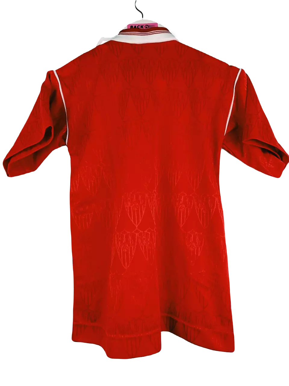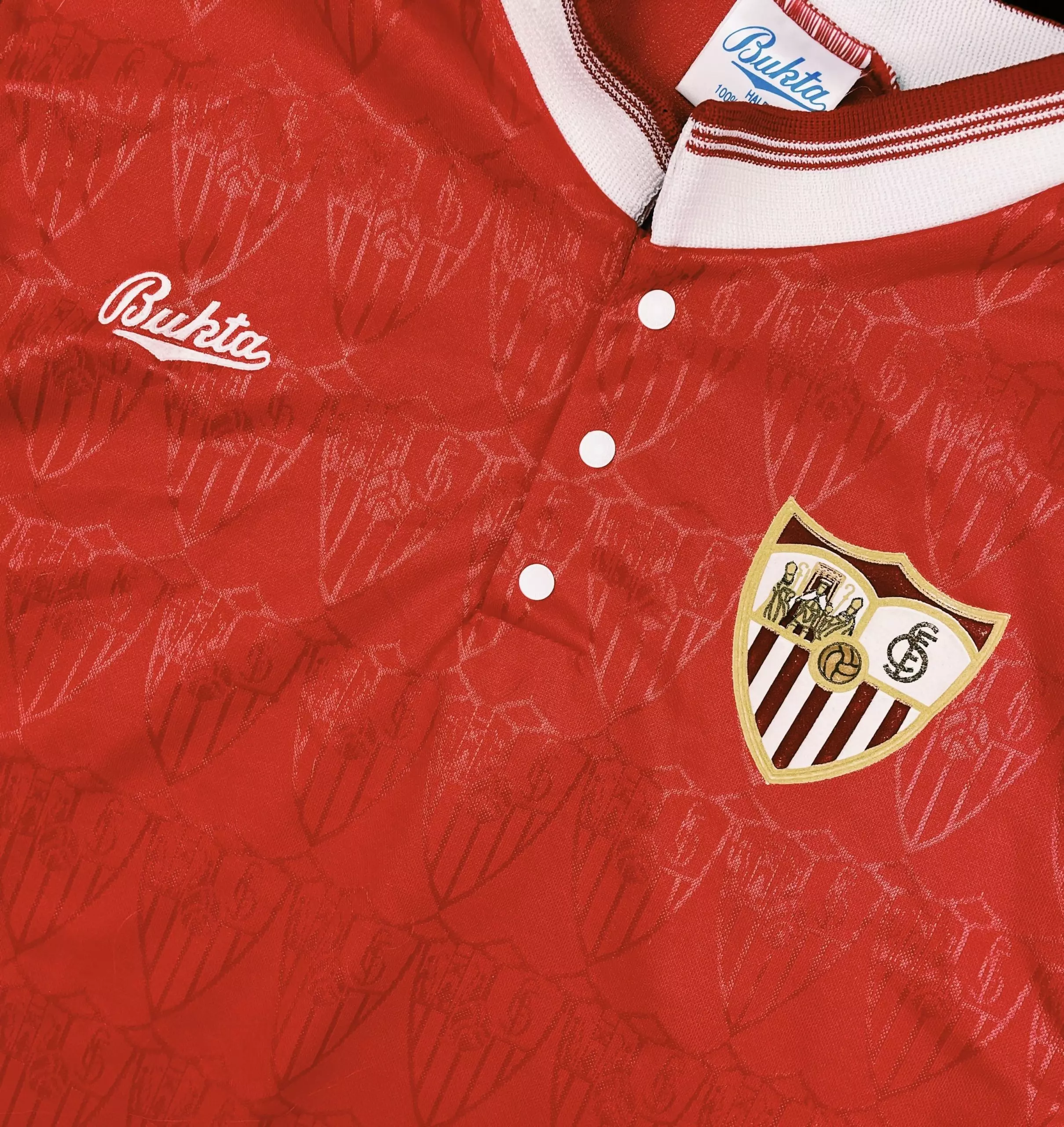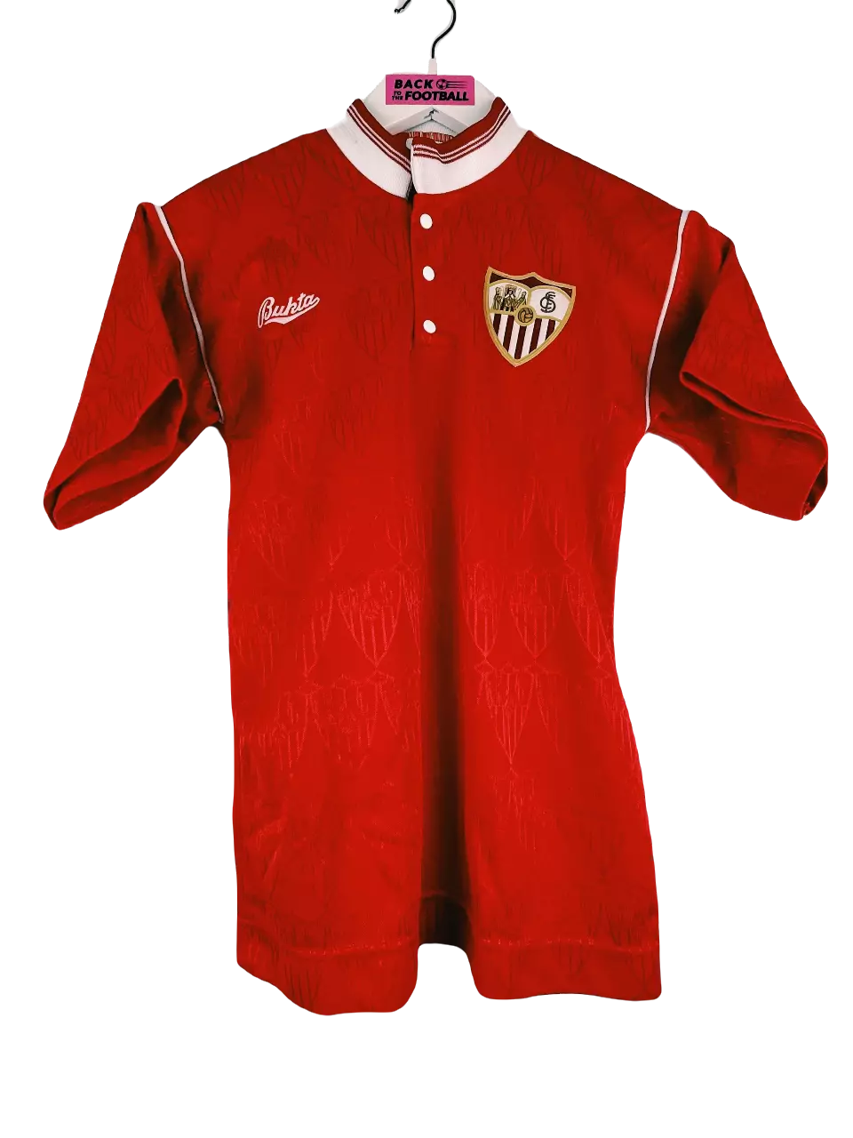 Taille : plutôt du XS. Largeur : 41cm | longueur : 59cm Etat : très bon état pour son âge Le maillot : maillot domicile du FC Séville porté sur deux saisons de 1990 à 1992. Col à boutons pression. Equipementier Bukta. Ecusson en feutrine et en tramé sur tout le maillot. Histoire : pas de titres pendant ces deux saisons pour le club andalou, avec un classement en milieu de tableau en Liga.