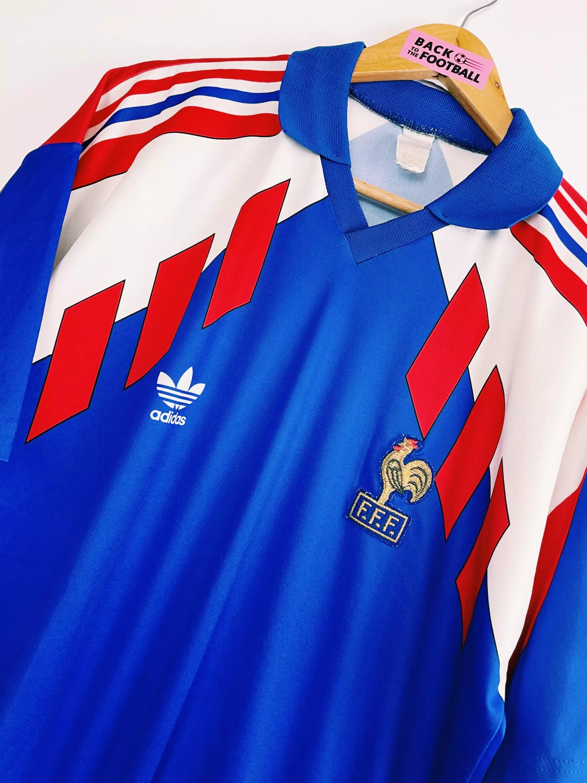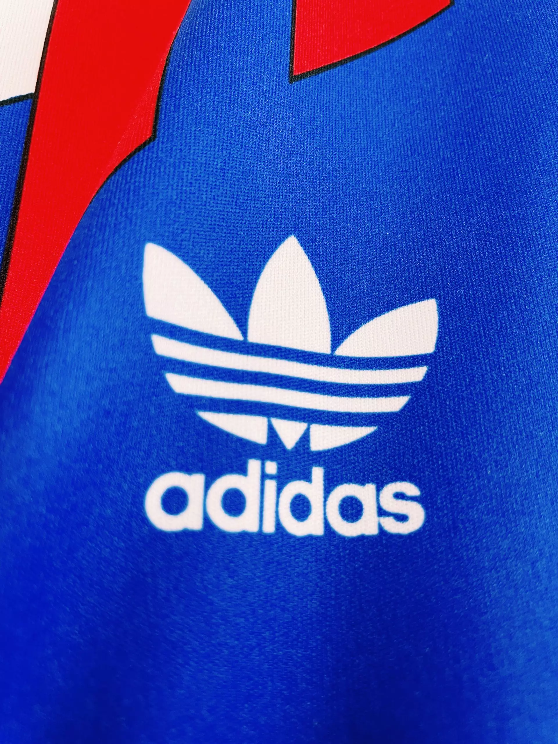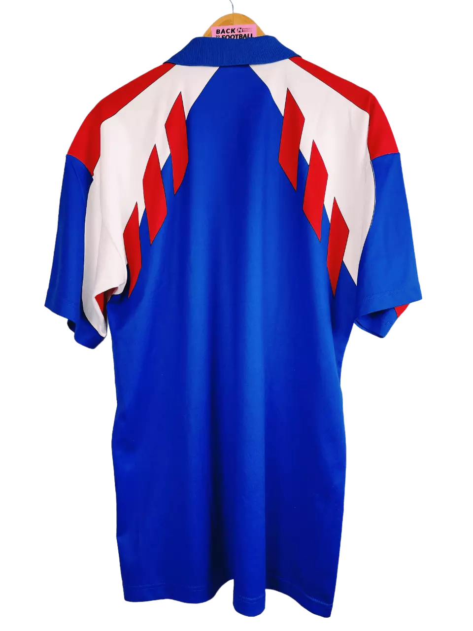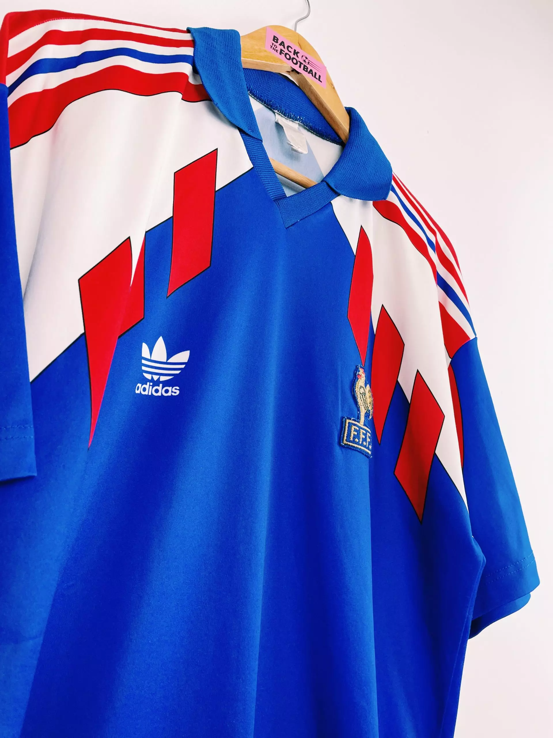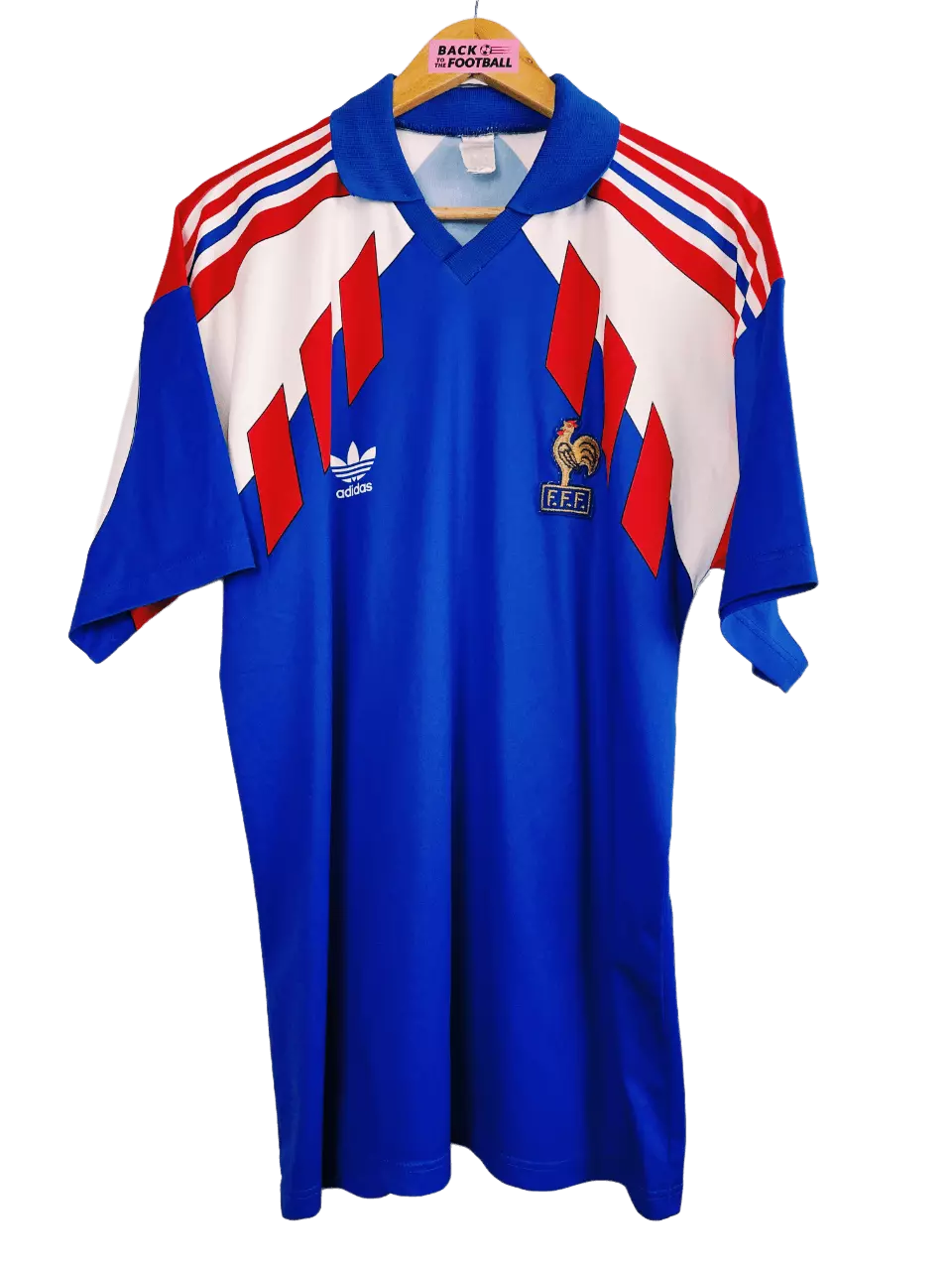 Taille : L Etat : 9/10, très bon état Le maillot : maillot vintage de l’équipe de France 1990/1992. L’écusson est brodé, le logo Adidas est incrusté au maillot. Le design est magnifique ! Un rare maillot rétro de la France. Histoire : la France n’est pas qualifiée pour la Coupe du Monde 1990. Mais les Bleus terminent l’année avec 7 victoires et un nul. Dont notamment une victoire contre la RFA, futur championne du Monde, grâce à deux buts de Papin et Cantona. Les Bleus se qualifient facilement pour l’Euro 1992 et enchainent 19 matchs sans défaite. Quelques joueurs…
