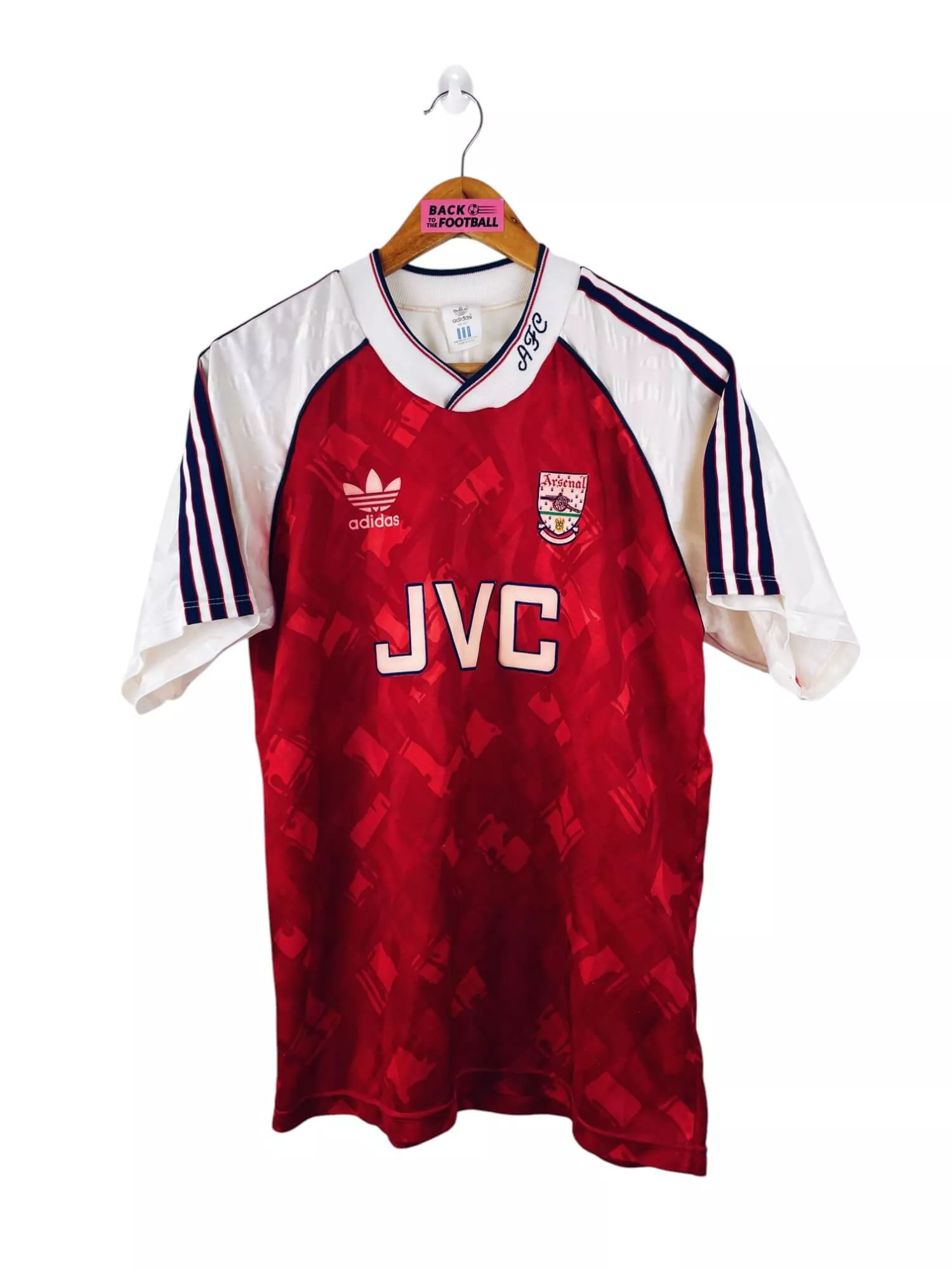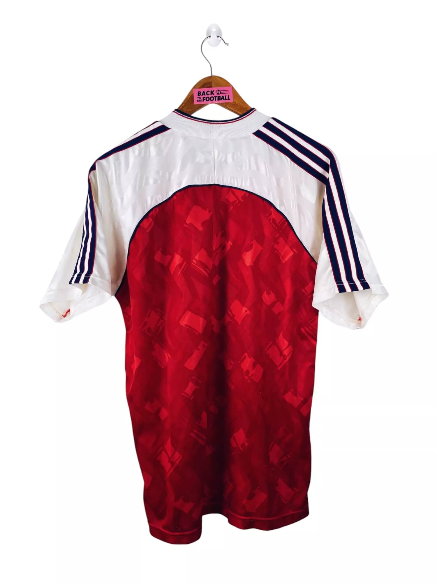 Taille : L – taille un peu petit Largeur : 52cm (aisselle à aisselle) Longueur : 72cm (base du col au bas) Si tu veux plus de détails, tu peux nous contacter par mail ou sur les réseaux 😉 Etat : 7.5/10, très bon état mais le logo Adidas est un peu abimé et il y a des bouloches (voir photos) Le maillot : maillot vintage domicile d’Arsenal 1990/1992. L’écusson, le logo Adidas et le sponsor JVC sont en feutrine. Les motifs sont magnifiques. Très beau maillot rétro d’Arsenal ! Histoire : la première saison, les Gunners remportent la Premier…