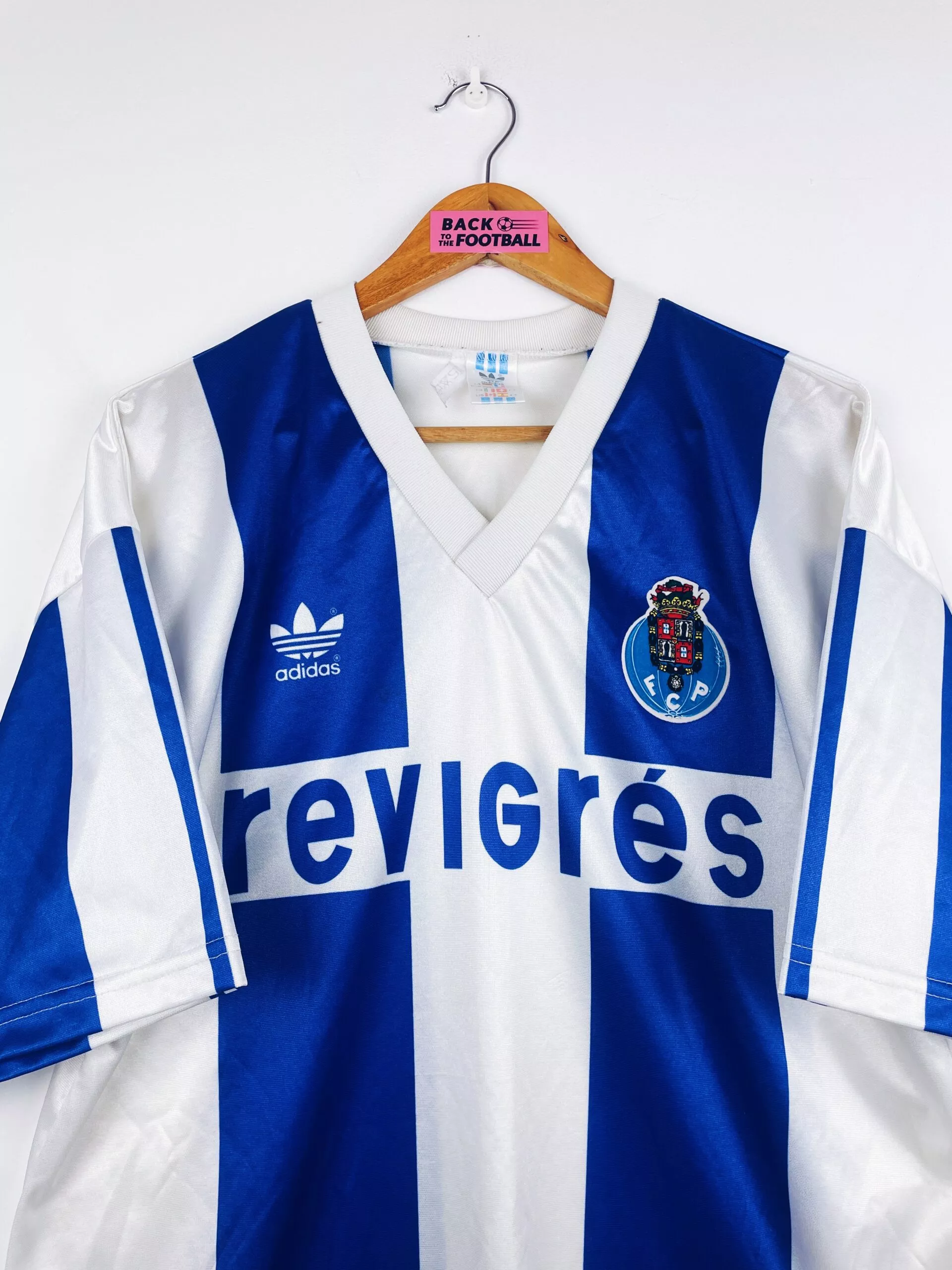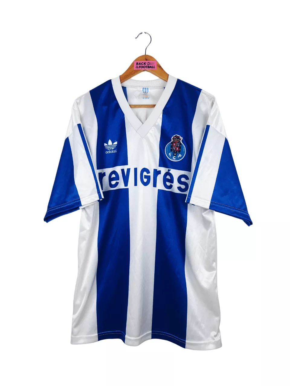 Taille : L Si tu veux plus d’infos, tu peux nous contacter par mail ou sur les réseaux 😉 Etat : 8.5/10, excellent état Le maillot : maillot vintage domicile du FC Porto 1990/1992. L’écusson est en feutrine, le logo Adidas et le sponsor Revigrés sont incrustés. Très beau maillot rétro de Porto ! Histoire : la première saison, les Dragons terminent à la 2ème place du championnat, deux points derrière Benfica… Par contre, ils gagneront la Coupe du Portugal contre le SC Beira-Mar. Ils iront jusqu’en quart de finale de Ligue des Champions (à l’époque Coupe des clubs champions…