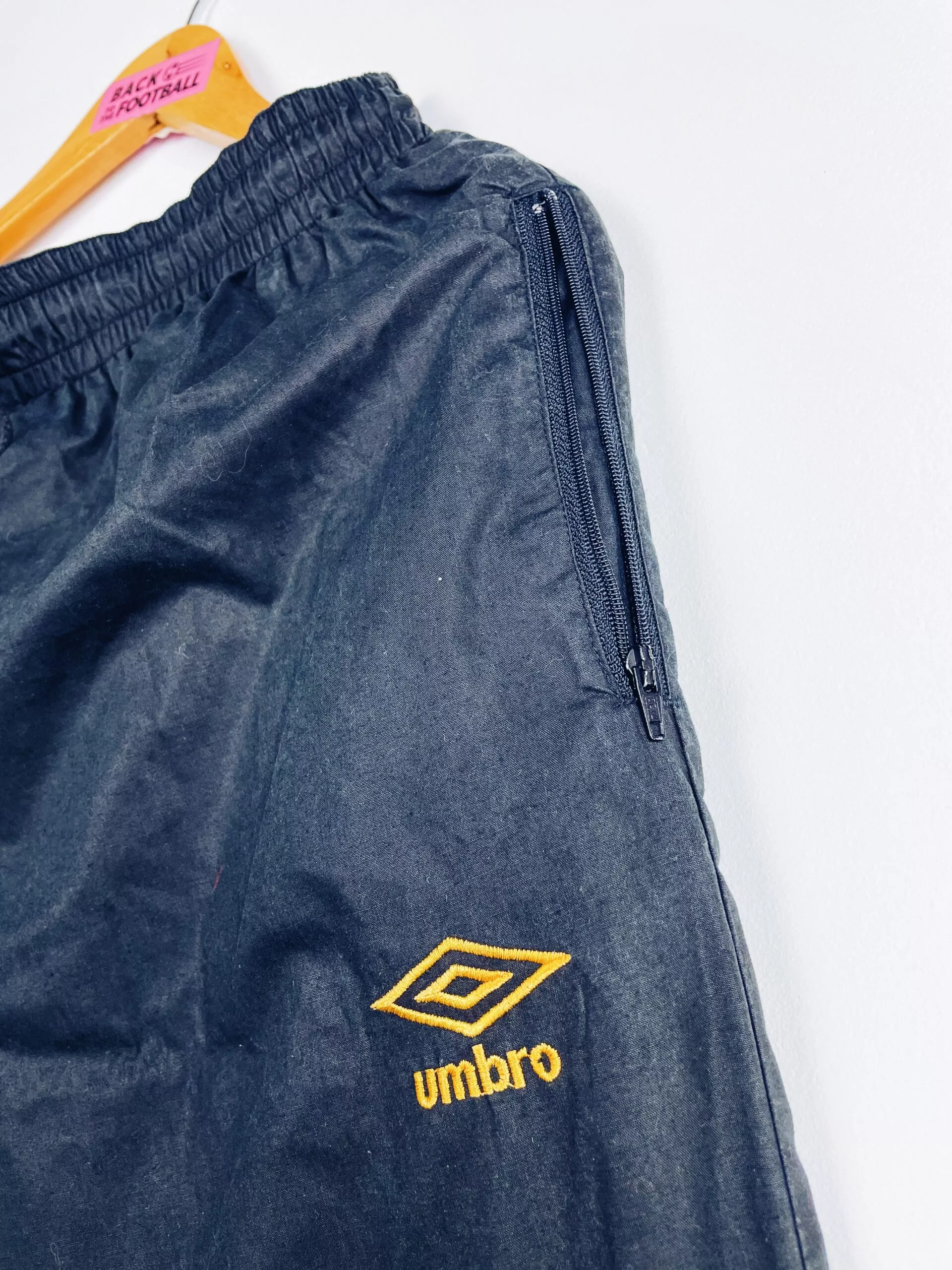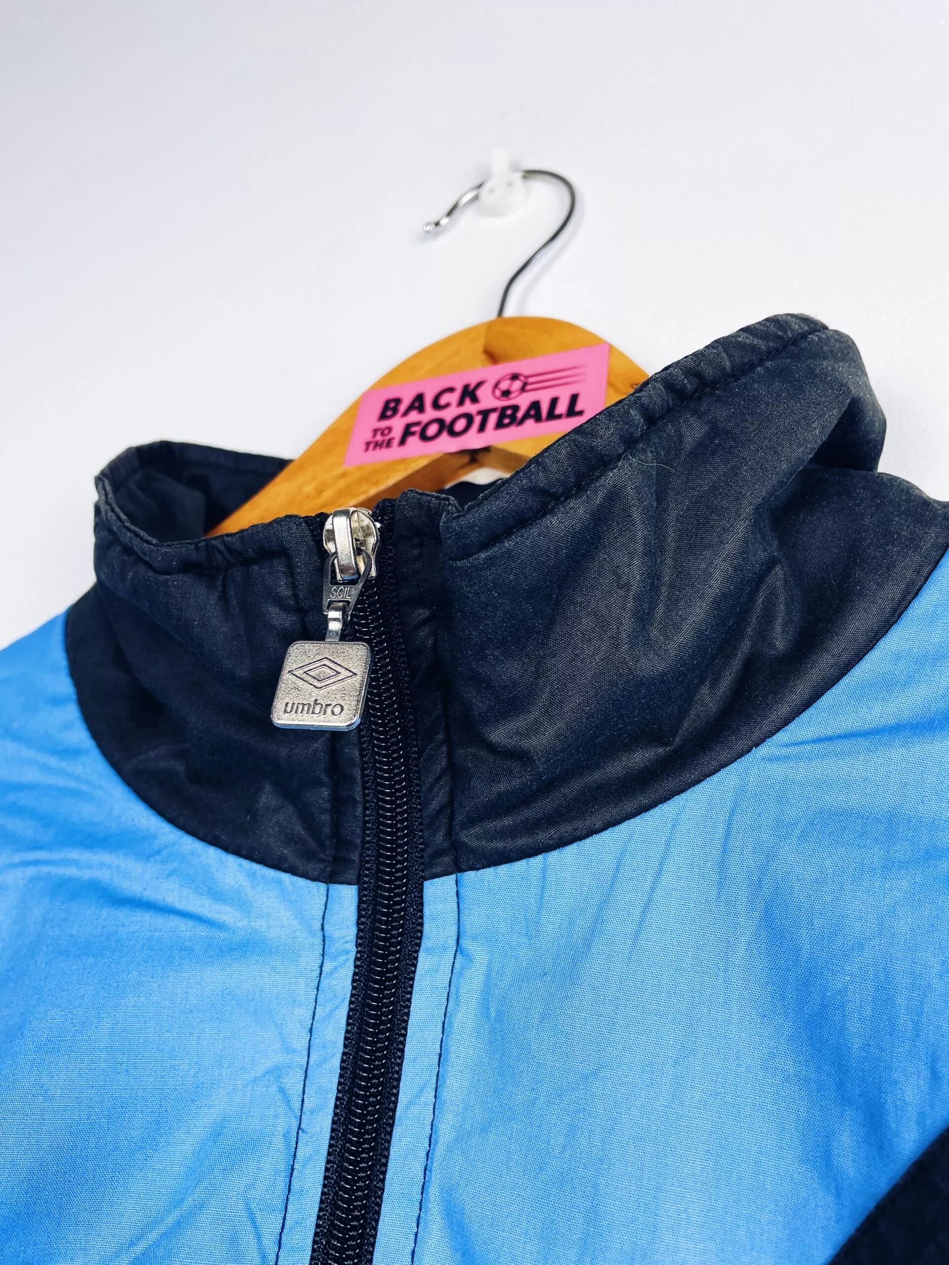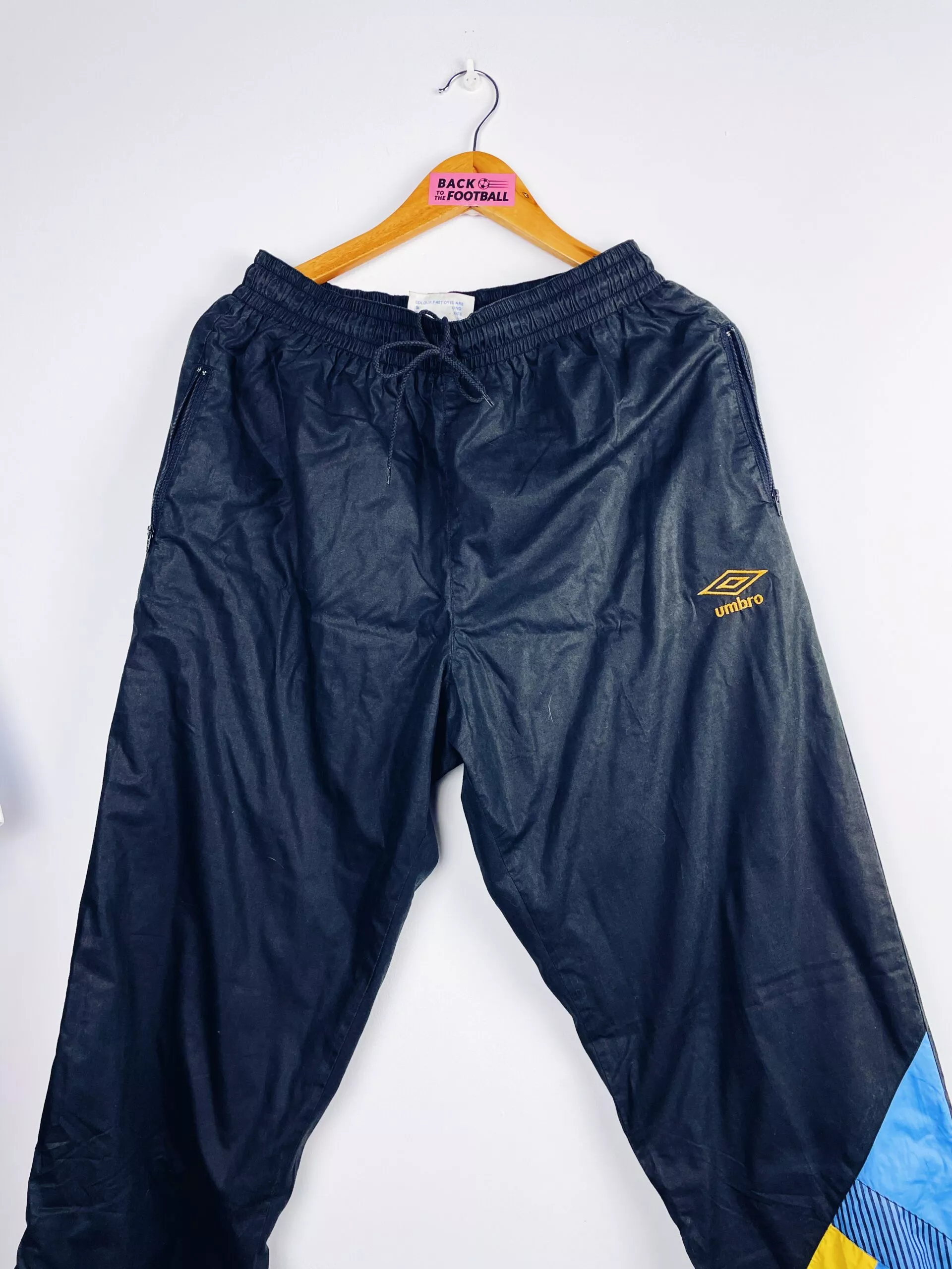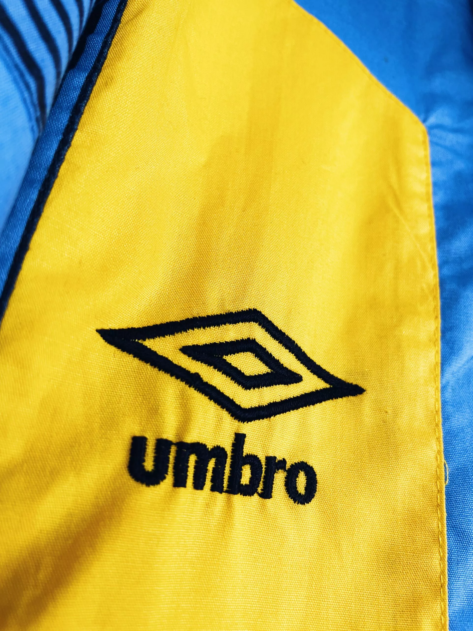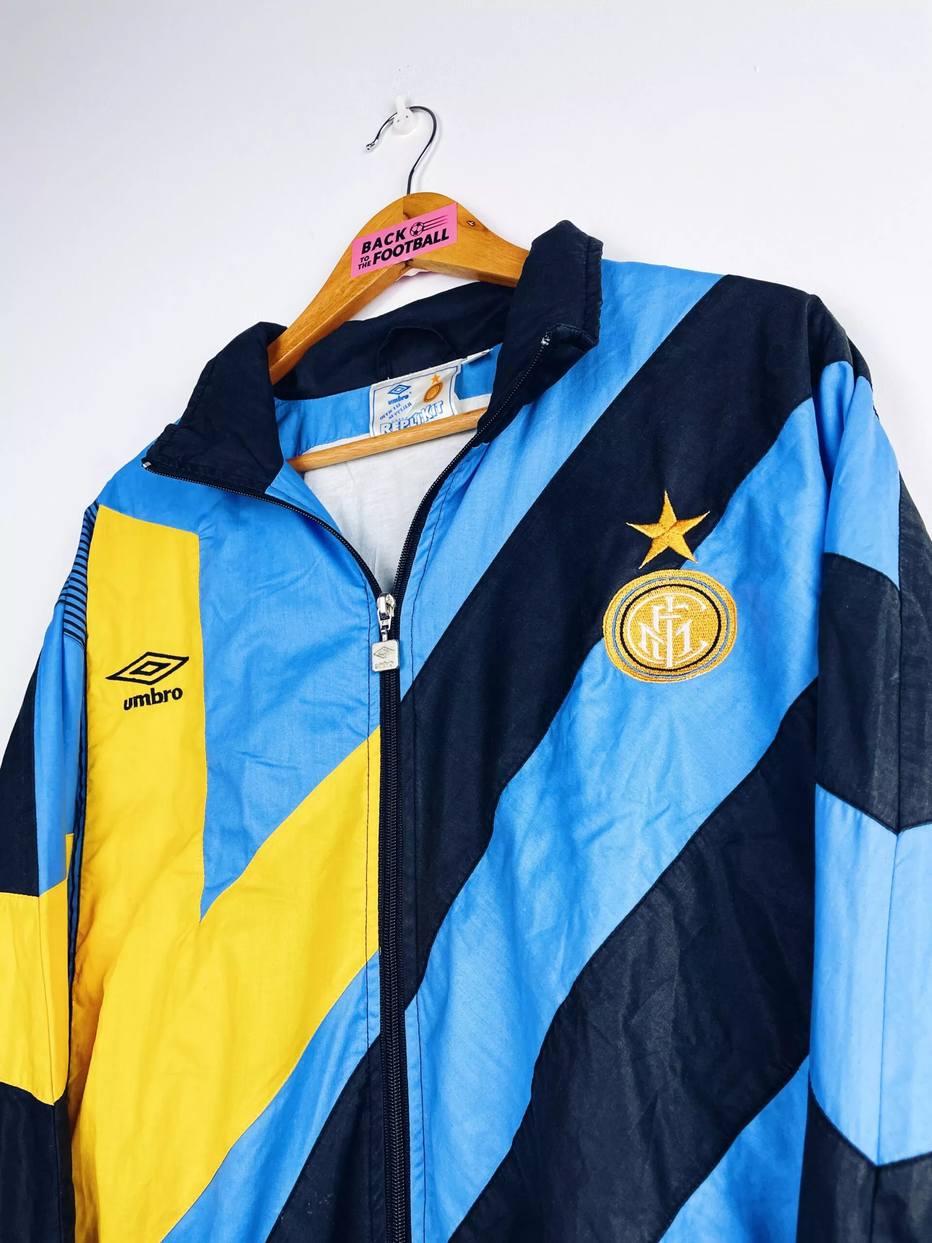 Taille : L Si tu veux plus d’infos, tu peux nous contacter par mail ou sur les réseaux 😉 Etat : 7.5/10, très bon état mais quelques légères traces à signaler (voir photos) Le survêtement : survêtement vintage de l’Inter Milan 1991/1992. L’écusson et le logo Umbro de la veste sont brodés. Il y a 2 poches latérales non zippées. La veste est resserrée au niveau des poignets. Le design est magnifique. Le pantalon assorti a deux poches avec fermeture éclair. Le pantalon est resserré aux chevilles et il y a un zip jusqu’aux mollets. Très beau survêtement rétro de…