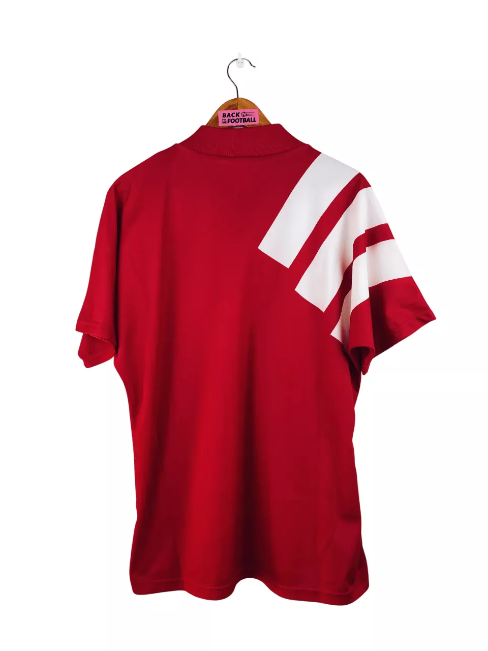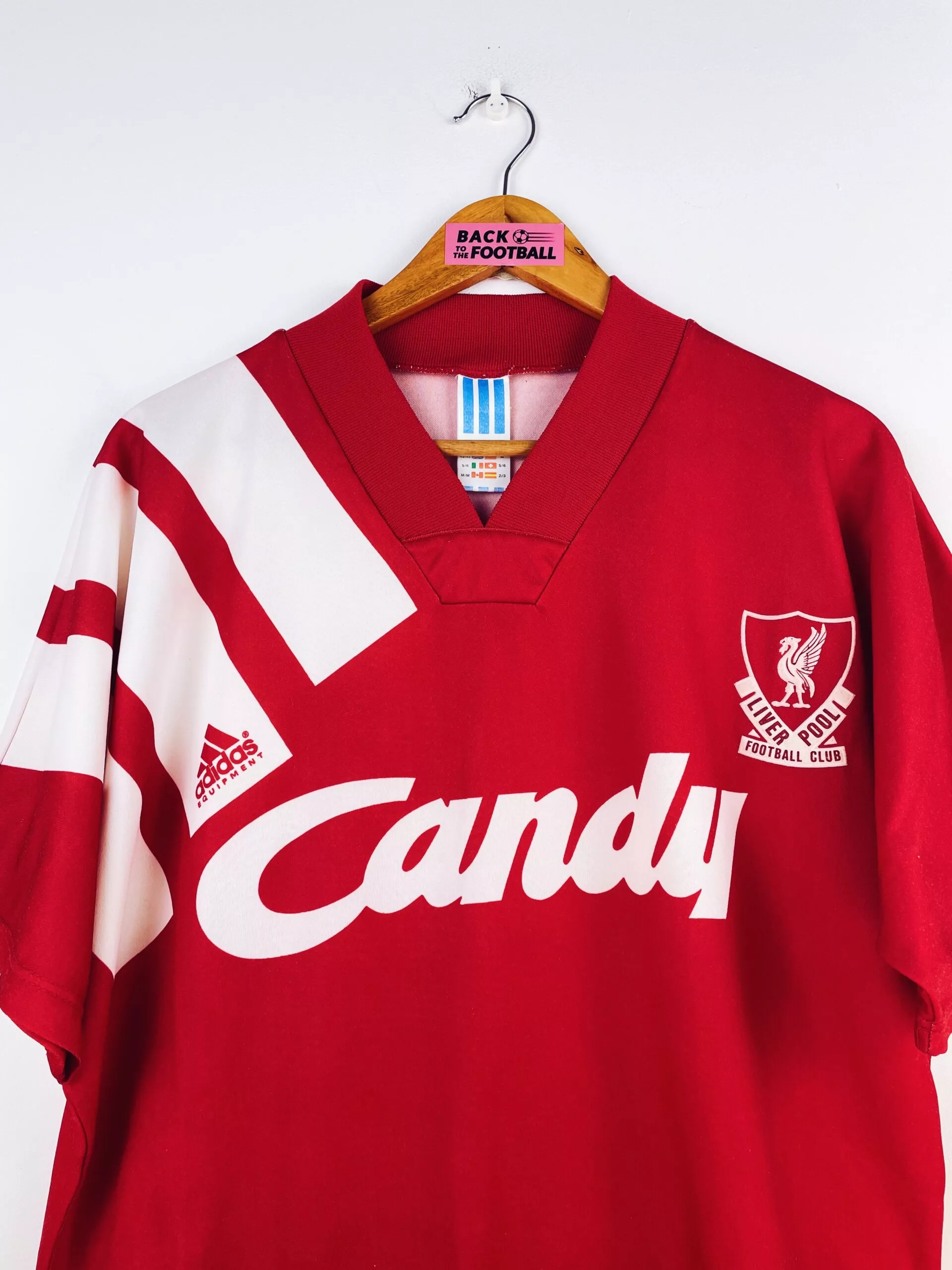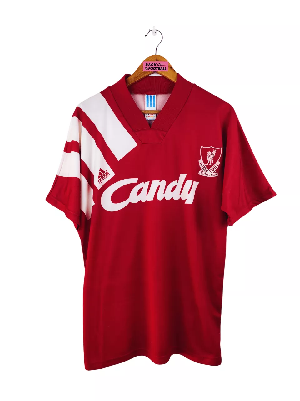 La taille : M Si tu veux plus de détails, tu peux nous contacter par mail ou sur les réseaux 😉 Etat : 8/10, très bon état, quelques bouloches, un accroc dans le dos (voir photos) Le maillot : maillot vintage domicile de Liverpool 1991/1992. L’écusson est en feutrine, le logo Adidas et le sponsor Candy sont incrustés au maillot. Très beau maillot rétro de Liverpool ! Histoire : les Reds terminent à la 6ème place de Premier League. En Coupe UEFA, Liverpool élimine Auxerre, Swarovski Tirol avant de tomber contre le Genoa en quart. Le gros moment de la…