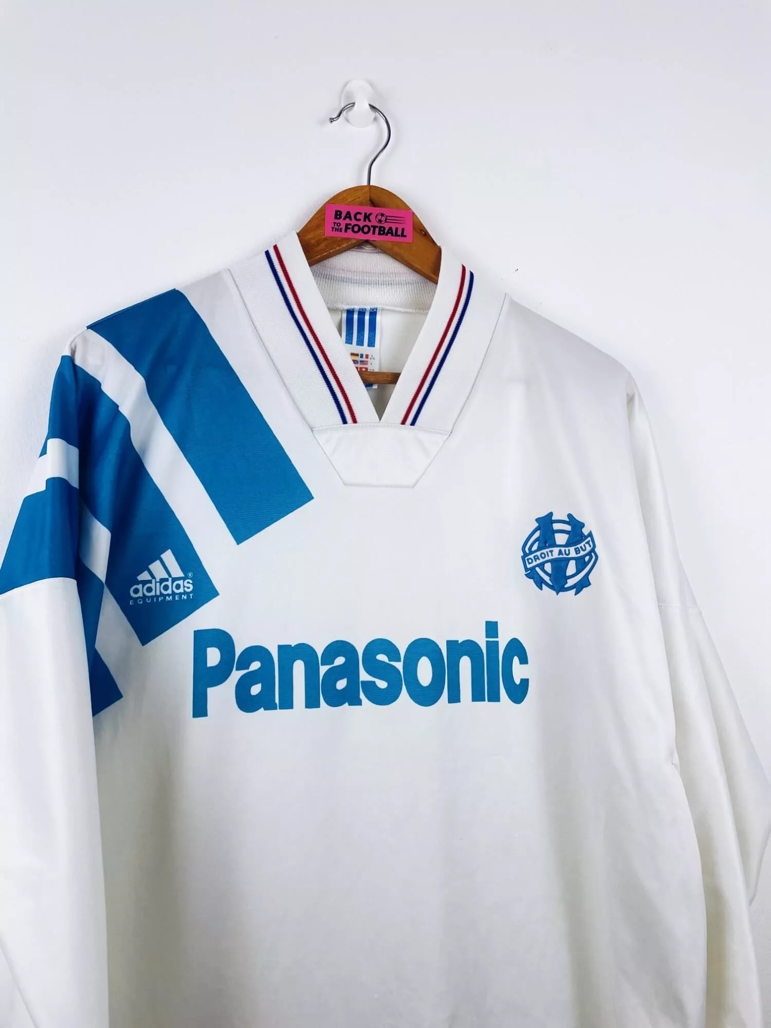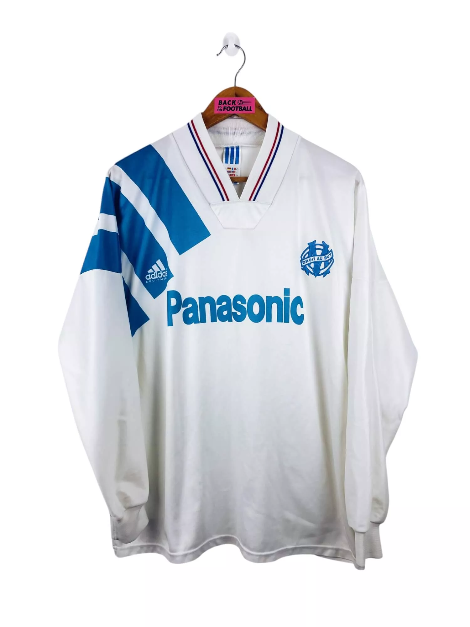 Taille : L Largeur : 55cm (aisselle à aisselle) Longueur : 72cm (base du col au bas) Si tu veux plus de détails, tu peux nous contacter par mail ou sur les réseaux 😉 Etat : 8.5/10, excellent état, 2 petits accrocs (voir photos) Le maillot : maillot vintage domicile de l’OM 1991/1992 manches longues. L’écusson est en feutrine, le logo Adidas et le sponsor Panasonic sont incrustés. Très beau maillot rétro de l’Olympique de Marseille ! Histoire : très grosse saison de l’OM avec un titre de champion de France, quatrième d’affilé de l’ère Bernard Tapie. Le parcours des…