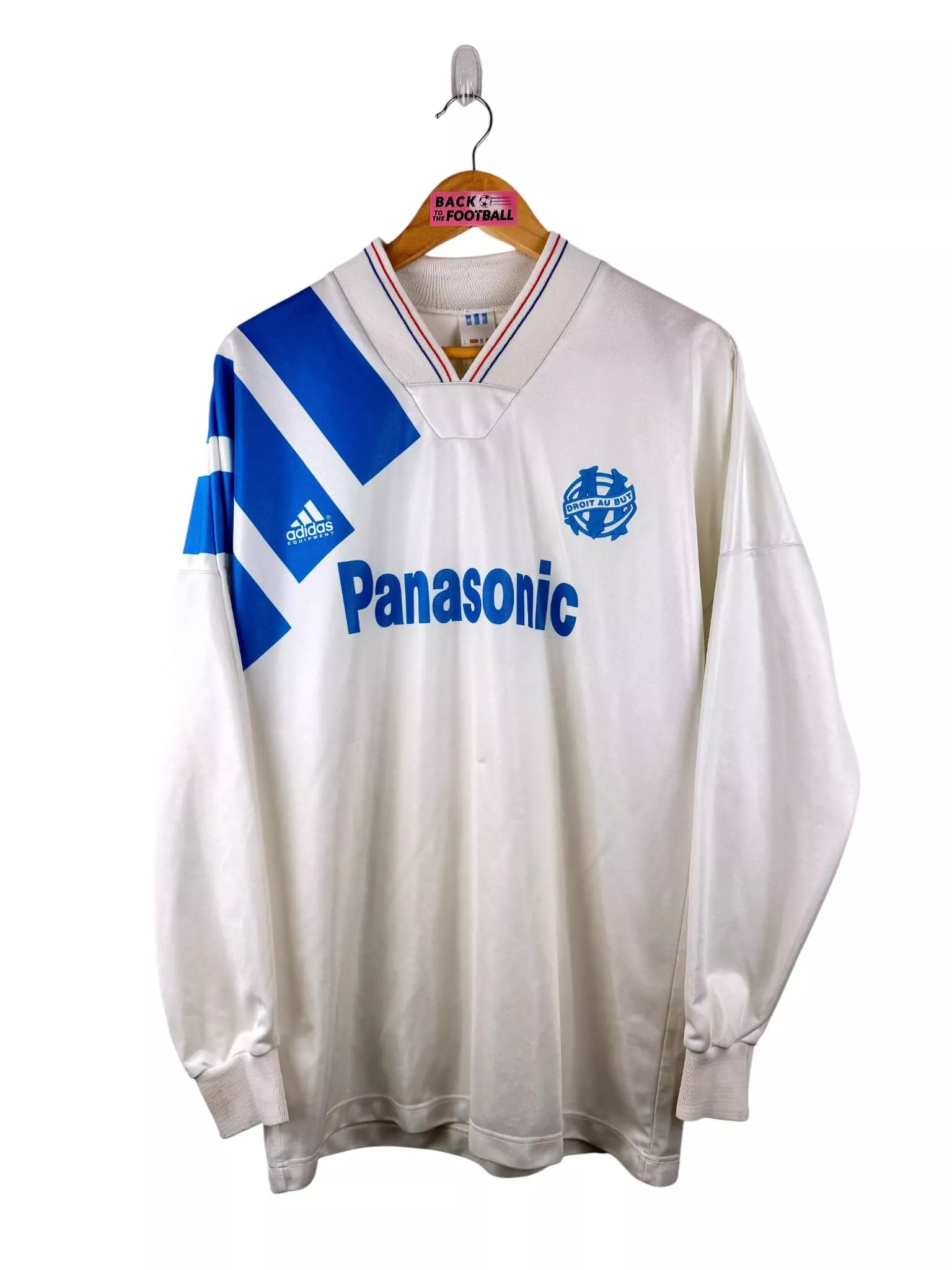 Taille : M – taille oversize Largeur : 53cm (aisselle à aisselle) Longueur : 75cm (base du col au bas) Si tu veux plus de détails, tu peux nous contacter par mail ou sur les réseaux 😉 Etat : 7/10, bon état général mais des accrocs, l’écusson a des minis points noirs et il y a une micro trace sur l’épaule (voir photos) Le maillot : maillot vintage domicile de l’OM 1991/1992 manches longues. L’écusson est en feutrine, le logo Adidas et le sponsor Panasonic sont incrustés. Très beau maillot rétro de l’Olympique de Marseille ! Histoire : très grosse…