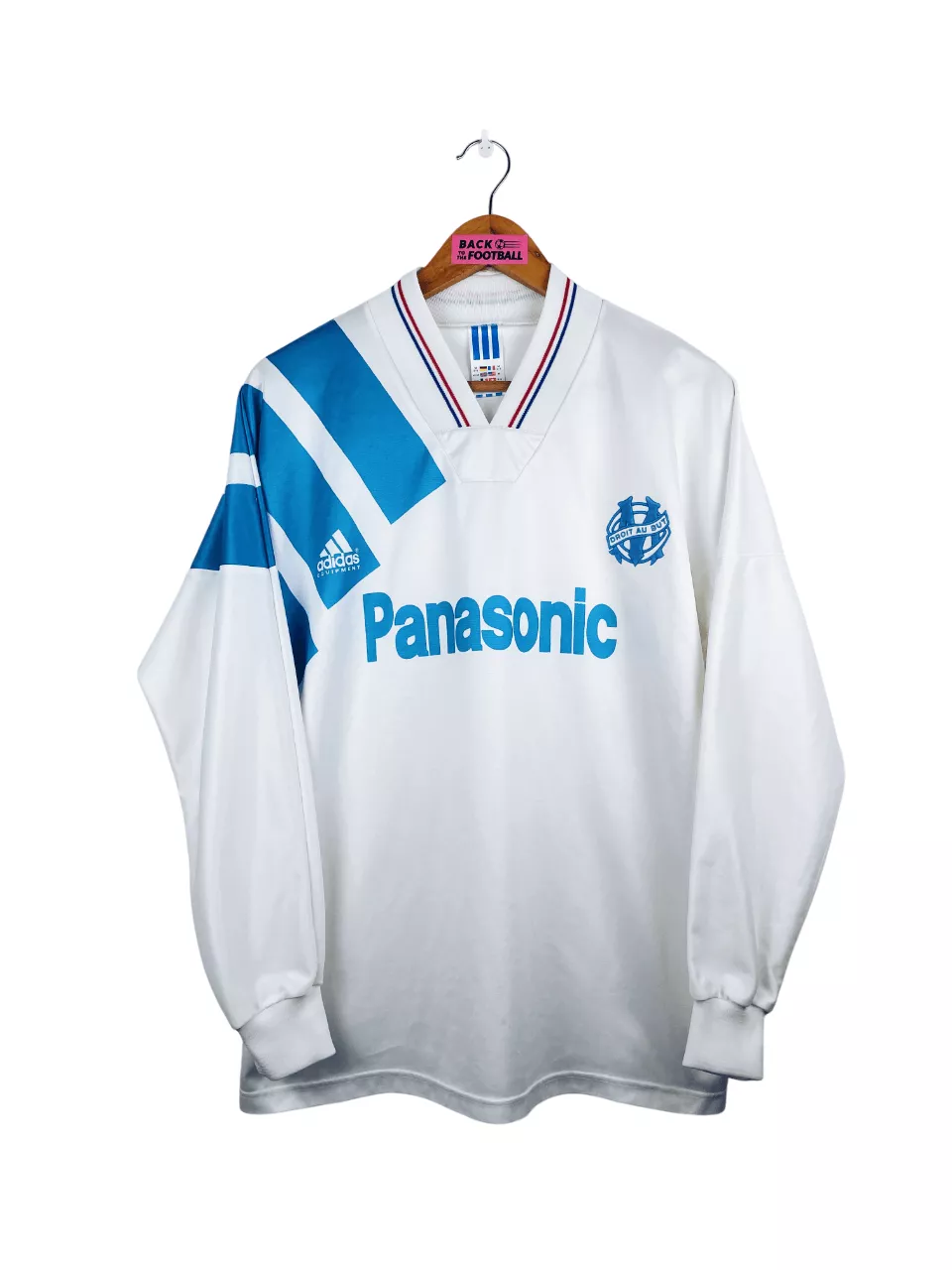 Taille : M Si tu veux plus de détails, tu peux nous contacter par mail ou sur les réseaux 😉 Etat : 8/10, excellent état. Mini trace en bas et mini bouloche dans le dos (voir photos) Le maillot : maillot vintage de l’OM 1991/1992 manches longues. L’écusson est en feutrine, le logo Adidas et le sponsor Panasonic sont incrustés. Très beau maillot rétro de l’Olympique de Marseille ! Histoire : très grosse saison de l’OM avec un titre de champions de France, quatrième d’affilé de l’ère Bernard Tapie. Le parcours des Phocéens en Coupe de France s’arrête en demi-finale…