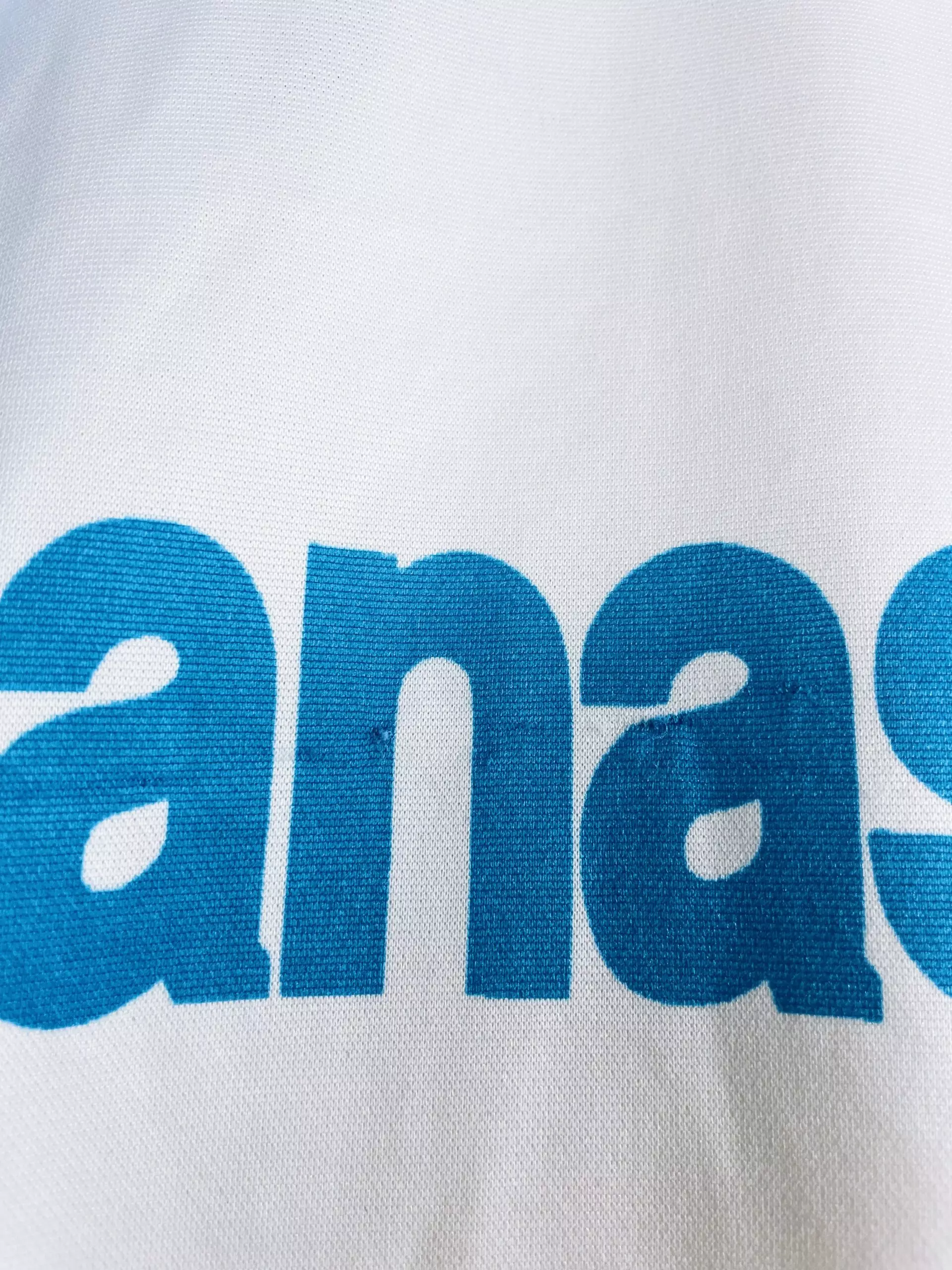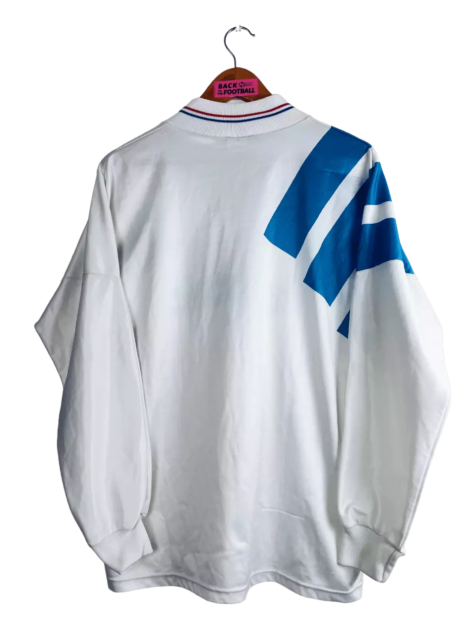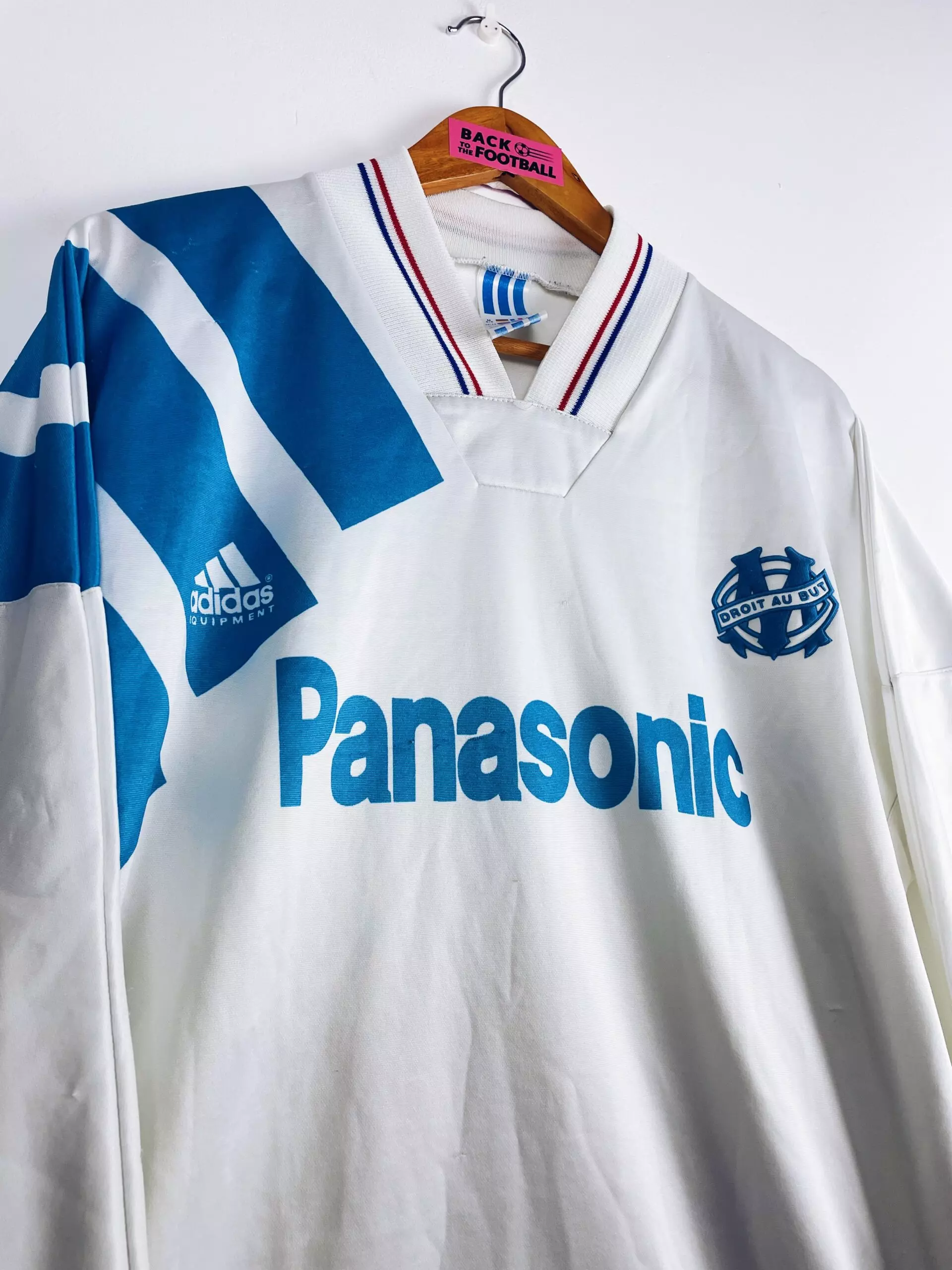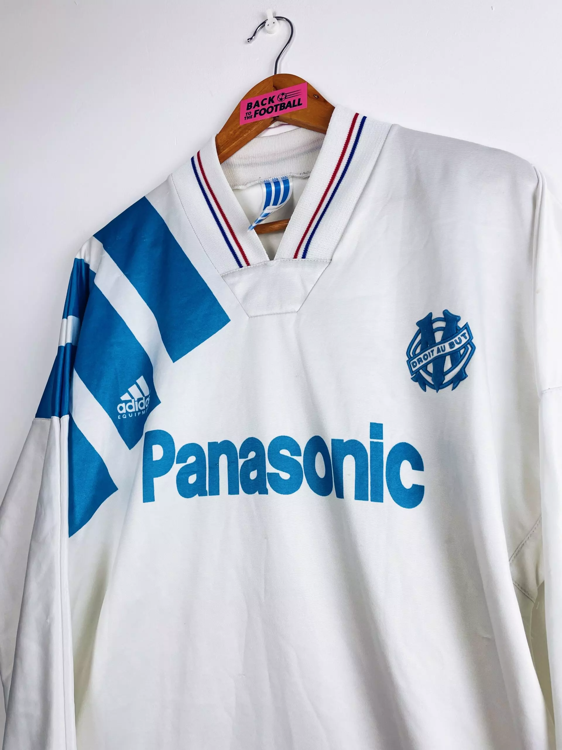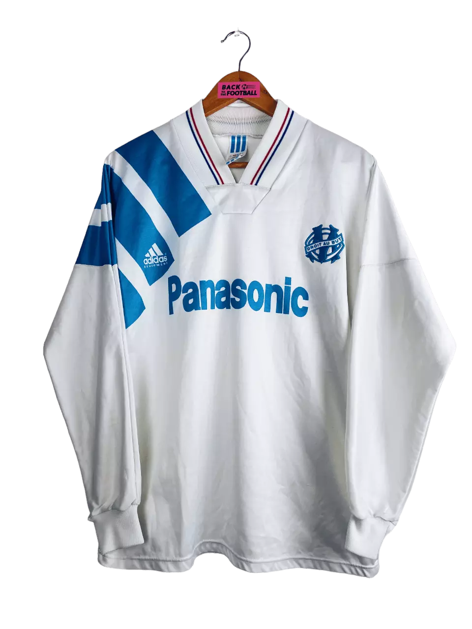 Taille : M Etat : 7/10, très bon état général mais plusieurs accros (voir photos) Le maillot : maillot vintage de l’OM 1991/1992 version manches longues. L’écusson de l’Olympique de Marseille est en feutrine, le logo Adidas et le sponsor Panasonic sont incrustés au maillot. Très beau maillot rétro de l’OM ! Histoire : très grosse saison de l’OM avec un titre de champions de France, quatrième d’affilé de l’ère Bernard Tapie. Le parcours des Phocéens en Coupe de France s’arrête en demi-finale suite au drame de Furiani à Bastia. Dernière saison exceptionnelle de Papin avec 38 buts. Quelques joueurs…