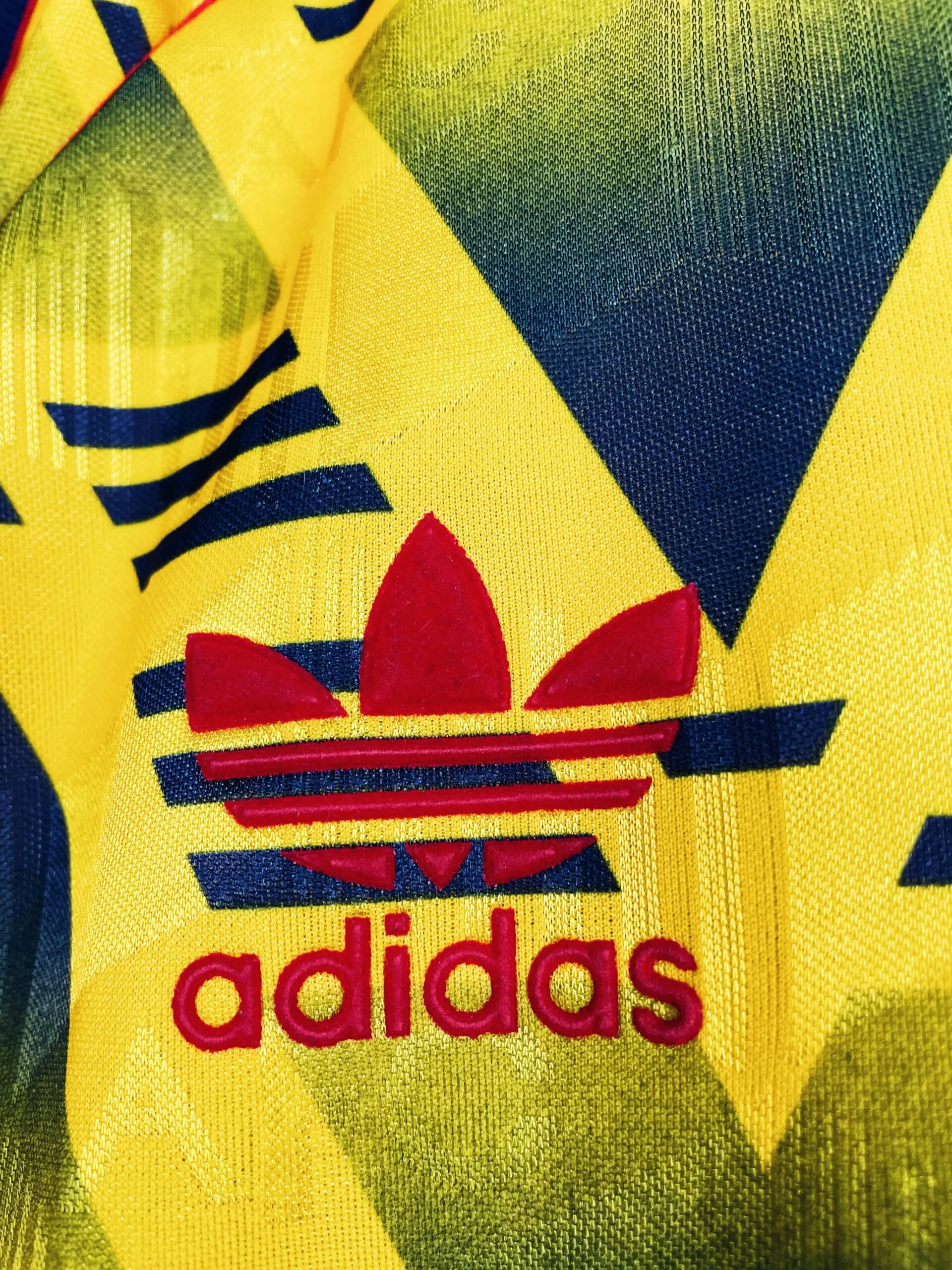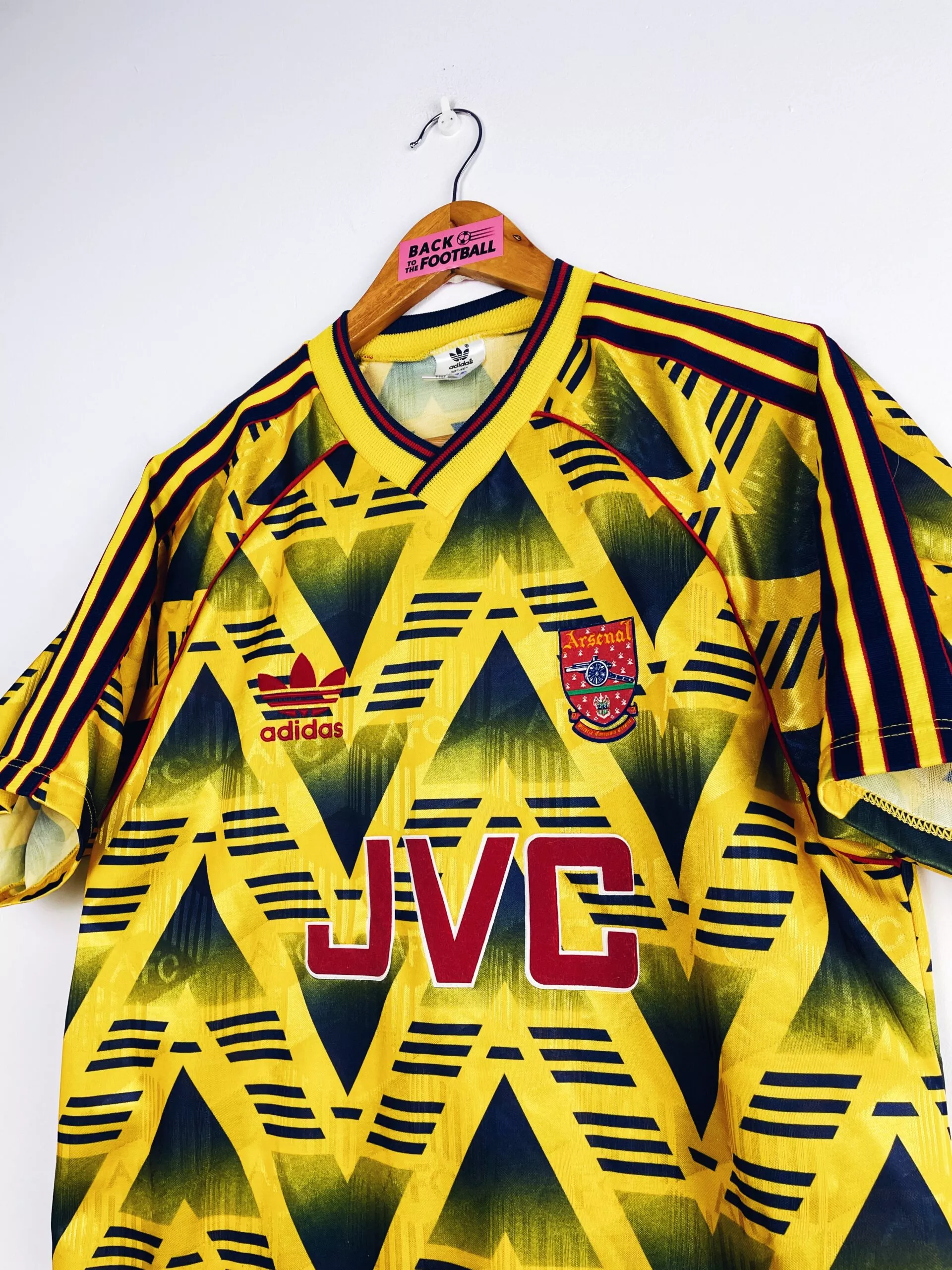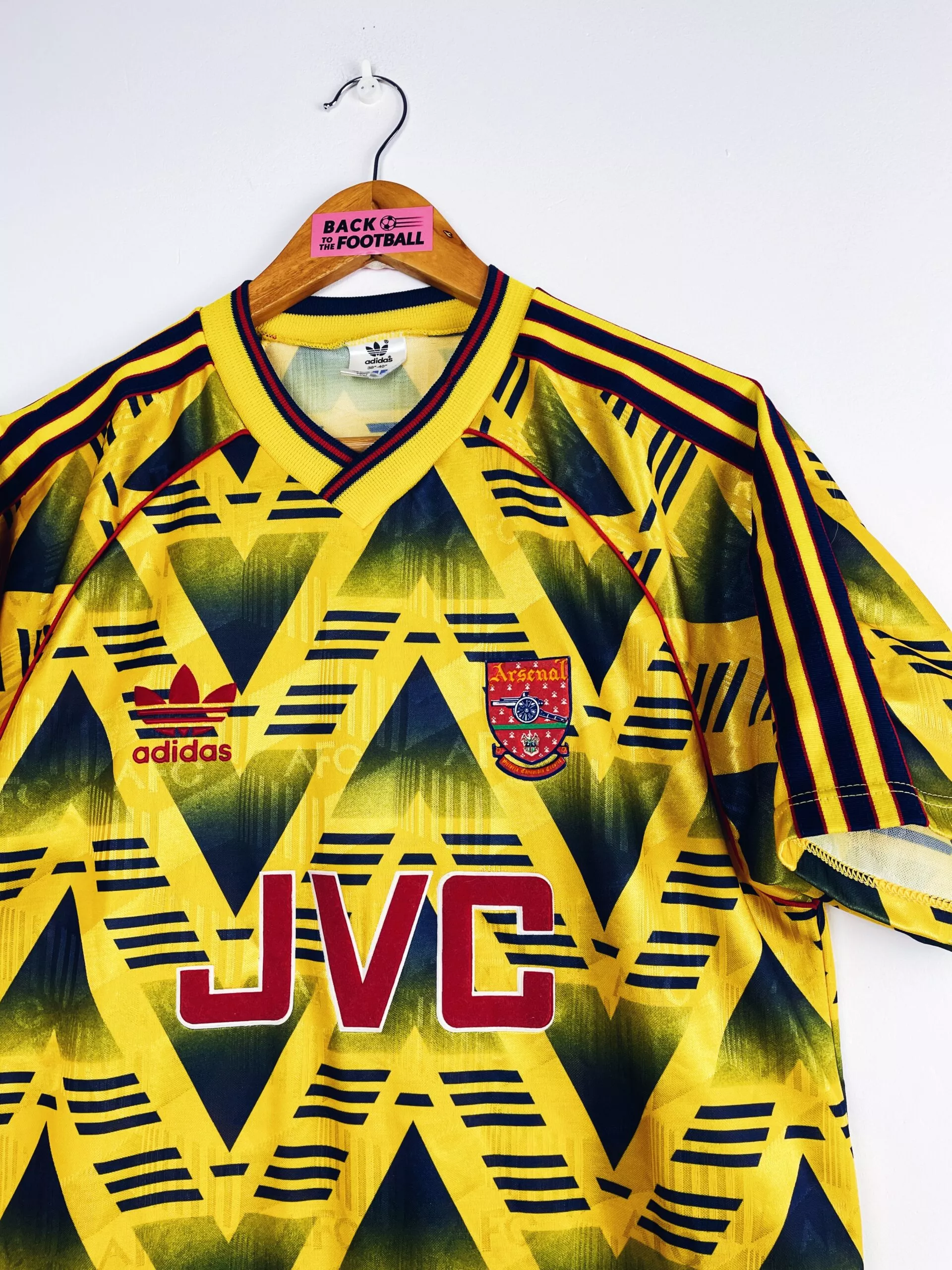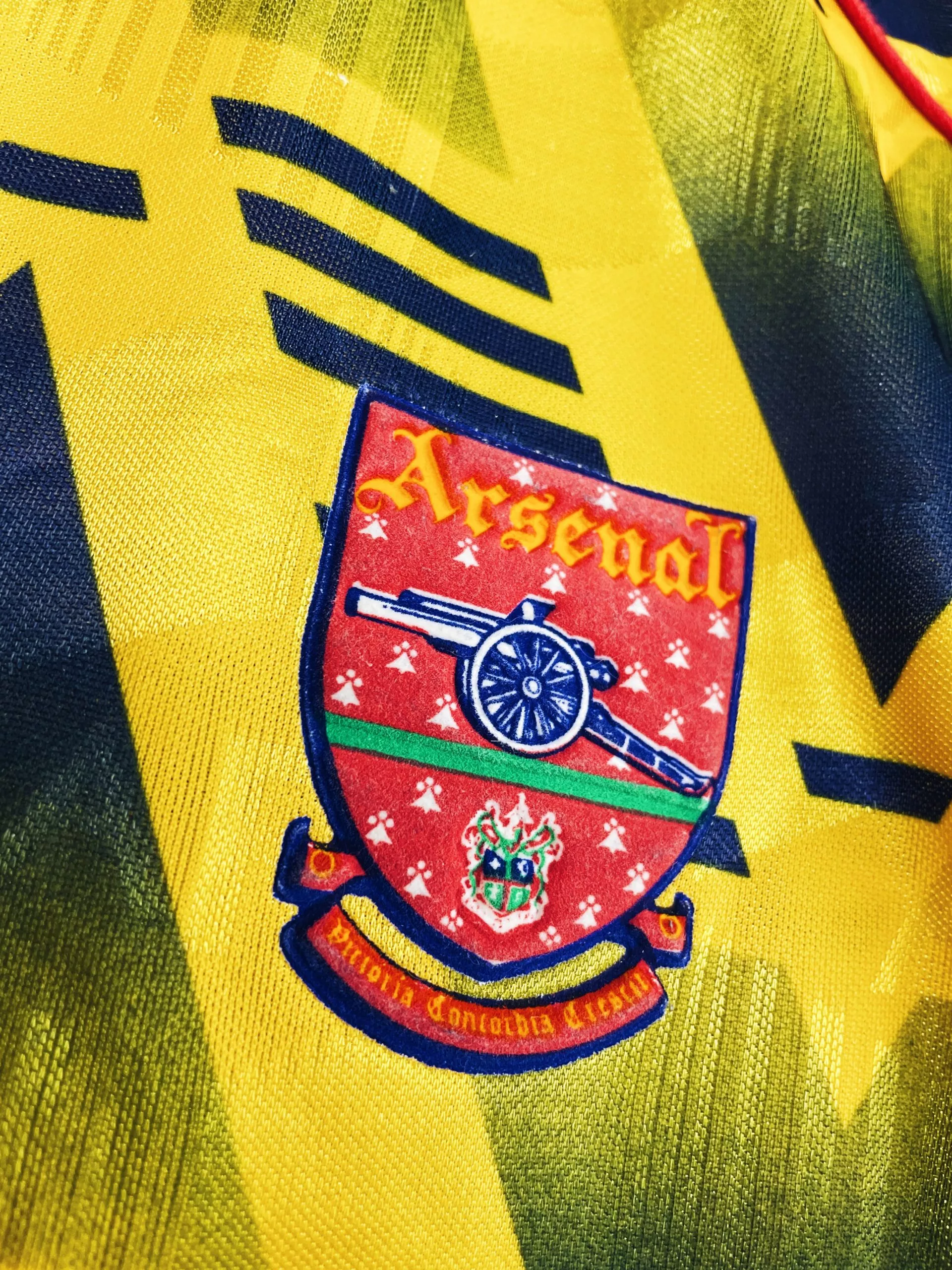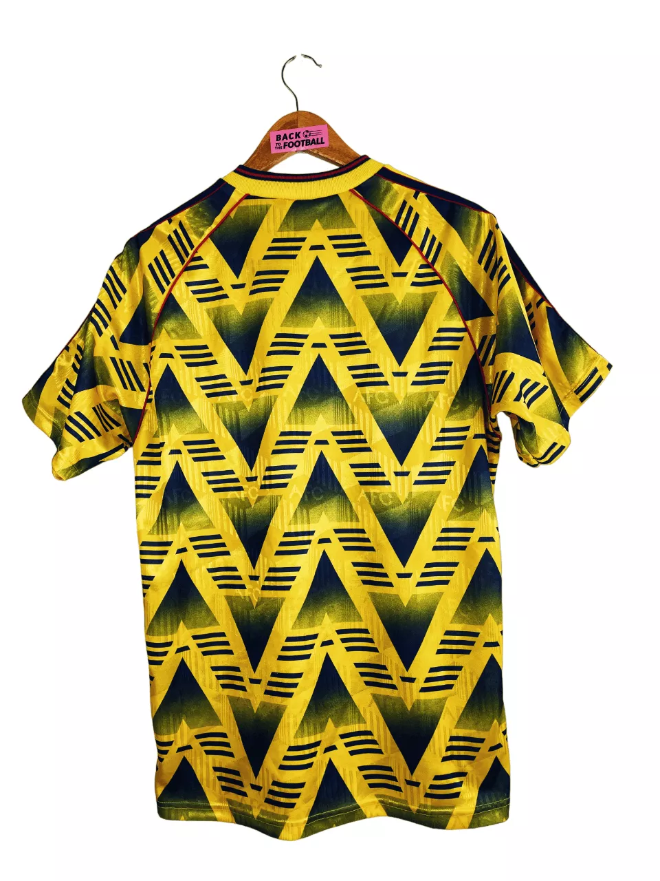 Taille : M Si tu veux plus de détails, tu peux nous contacter par mail ou sur les réseaux 😉 Etat : 8.5/10, excellent état Le maillot : maillot vintage d’Arsenal 1991/1993 extérieur. L’écusson, le logo Adidas à fleur et le sponsor JVC sont en feutrine. Le design « Banana » est incroyable ! Très beau maillot rétro d’Arsenal ! Histoire : La première saison, les Gunners terminent 4èmes de Premier League. La seconde saison, les londoniens terminent 10èmes de PL mais par contre remportent la FA Cup et la League Cup ! Ian Wright marque 56 buts sur les 2 saisons…