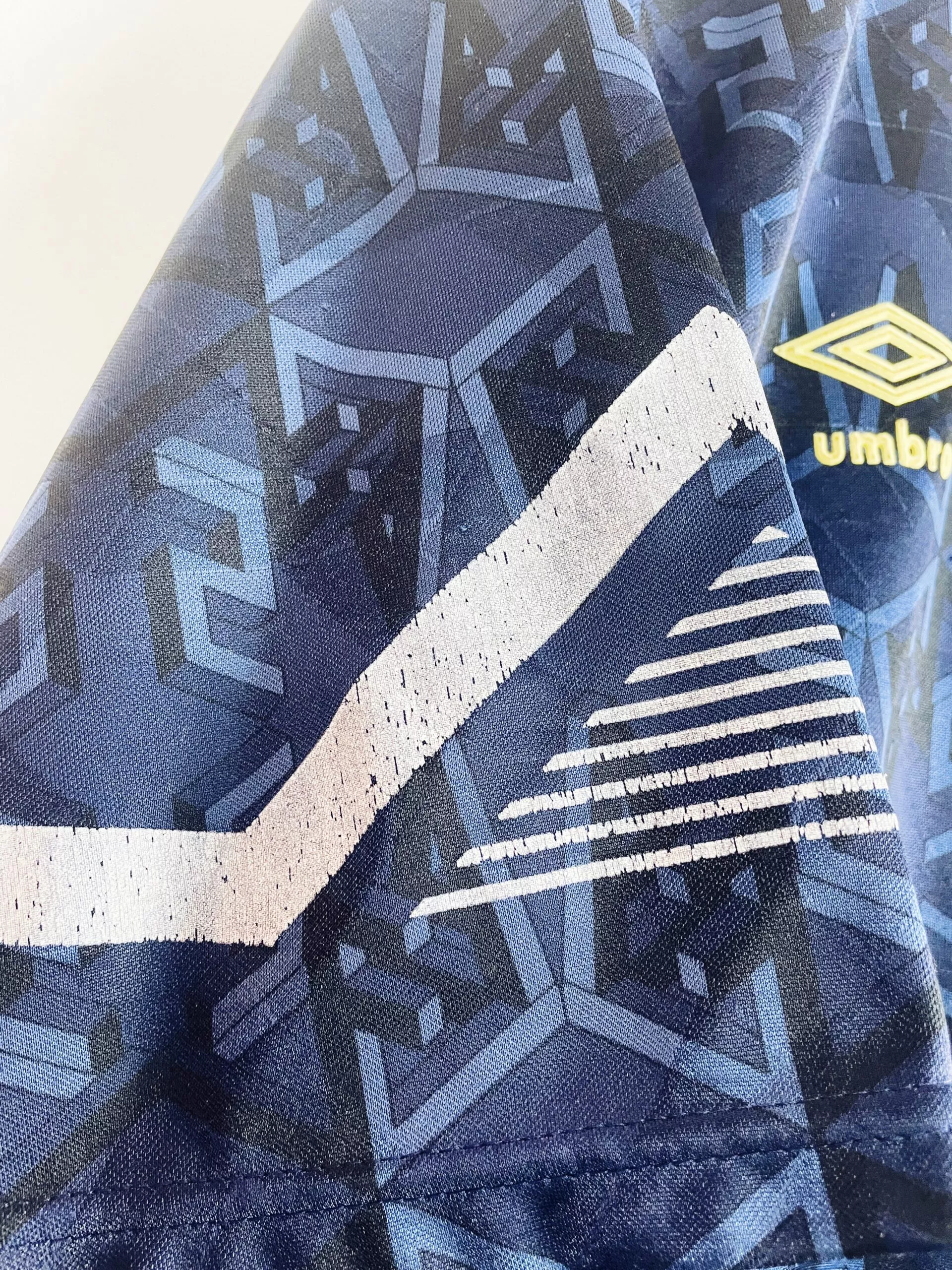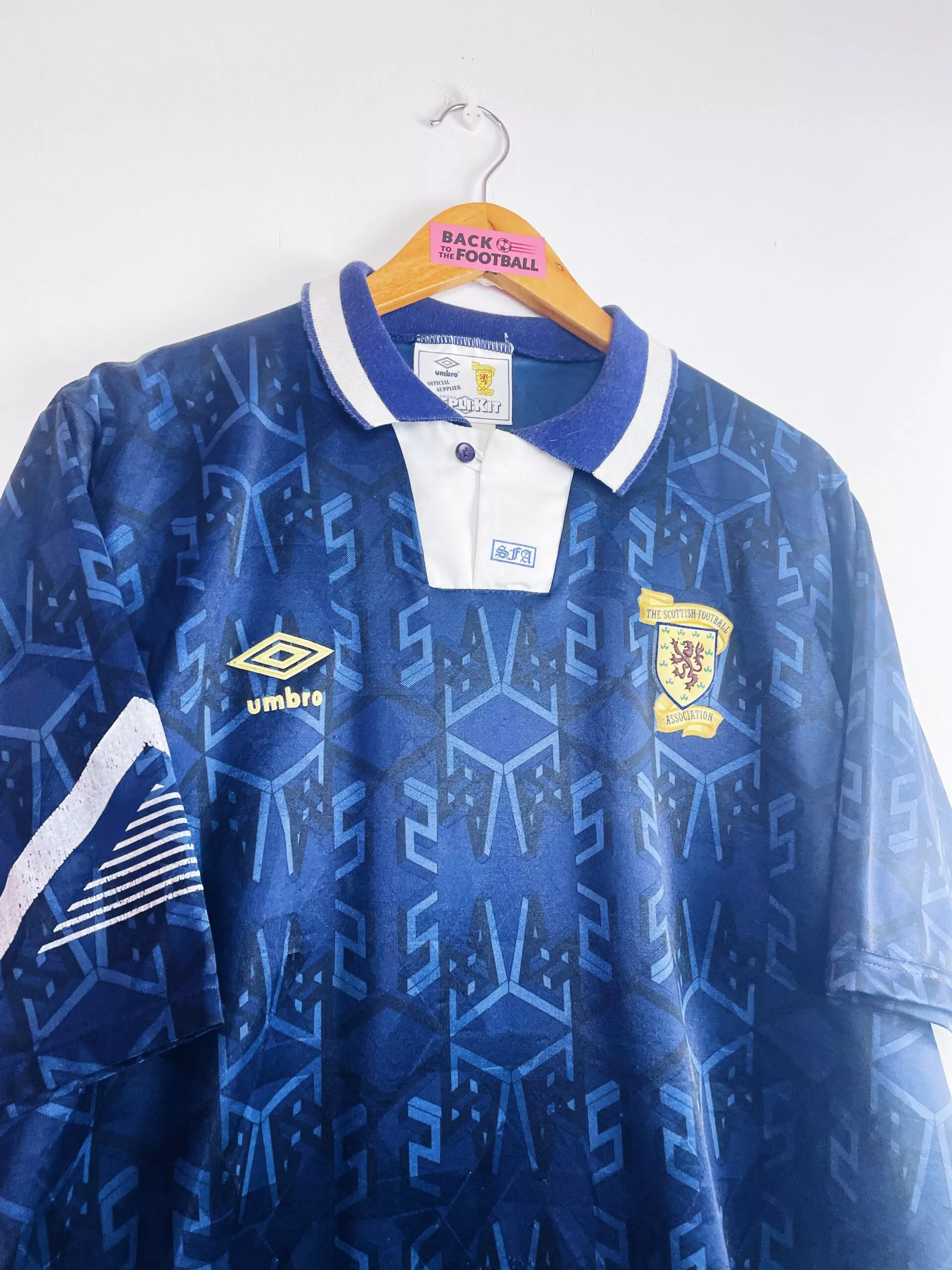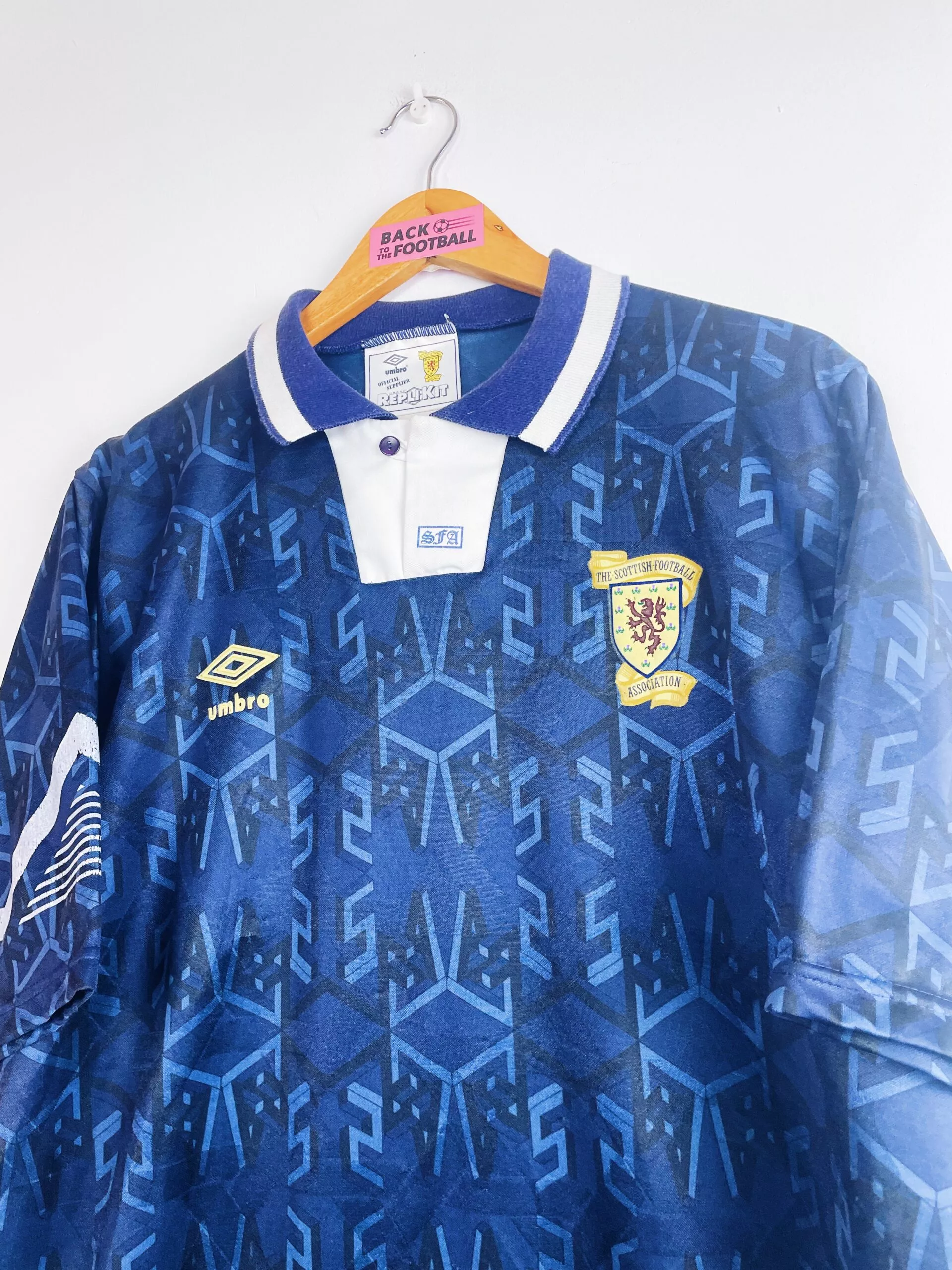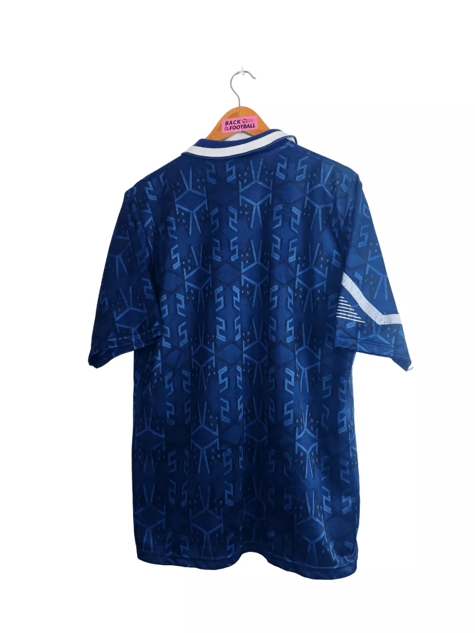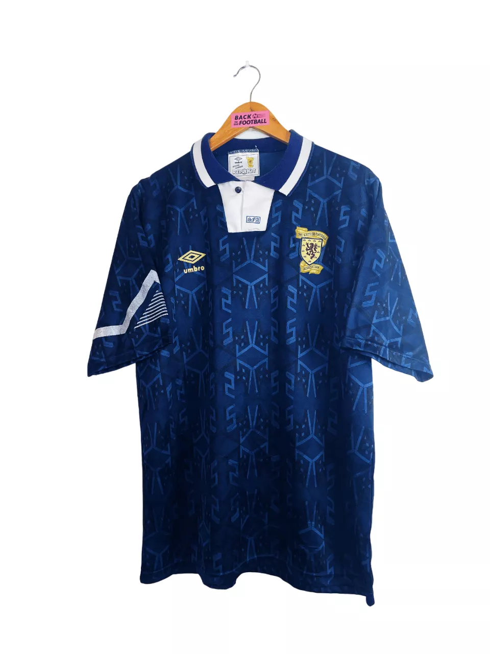 Taille : L Etat : 7.5/10 très bon état général, quelques bouloches et le flocage sur la manche est abimé (voir photo) Le maillot : maillot vintage domicile de l’Ecosse 1991/1994. L’écusson et le logo Umbro sont en feutrine. Le col est à bouton. On peut voir en motif sur tout le maillot les lettres S, F et A (Scottish Football Association). Très beau maillot rétro de l’Ecosse ! Histoire : l’Ecosse sera éliminée en phase de poules de l’Euro 1992 après leur troisième place dans un groupe très relevé avec notamment les Pays-Bas et l’Allemagne.
