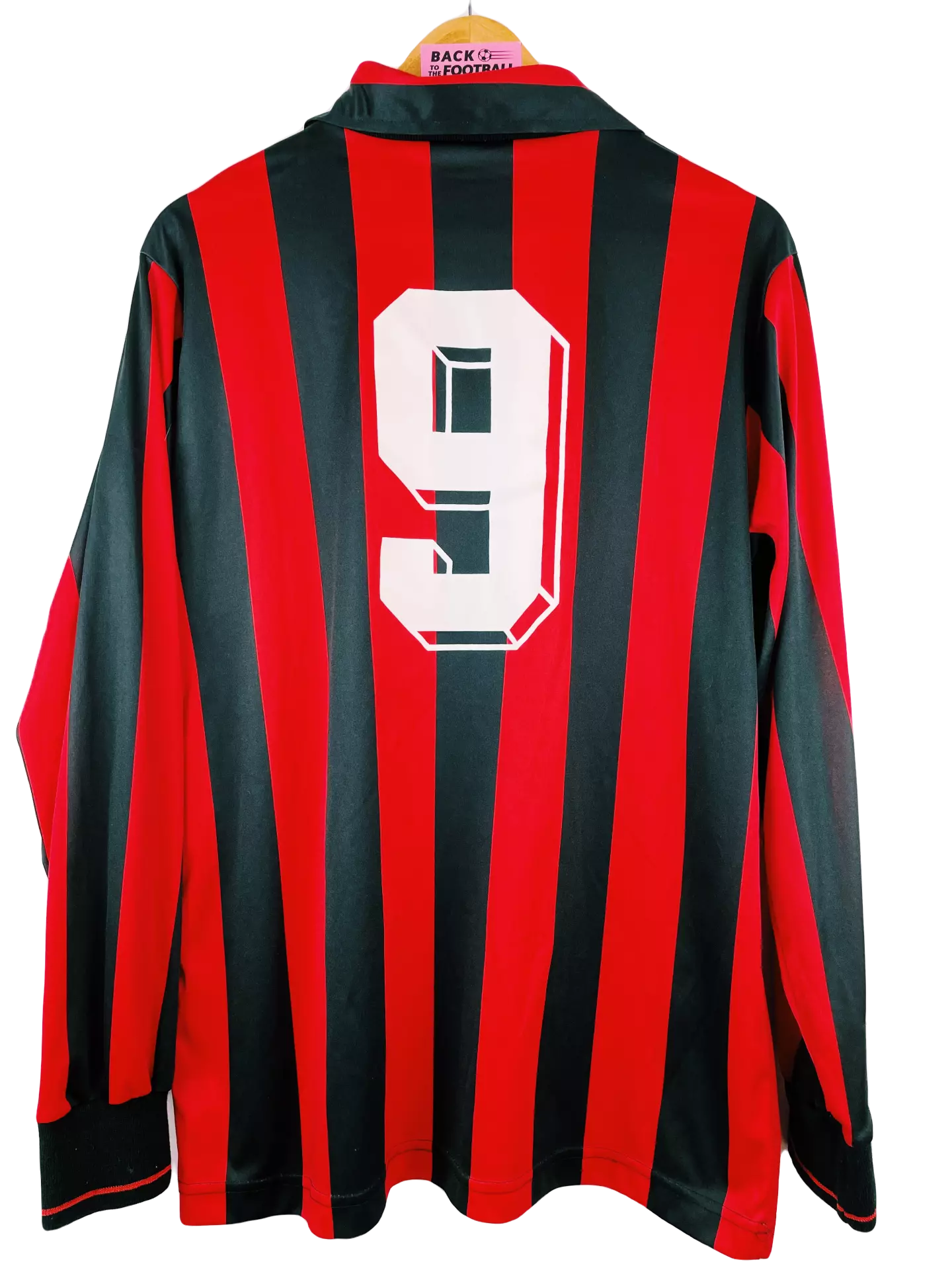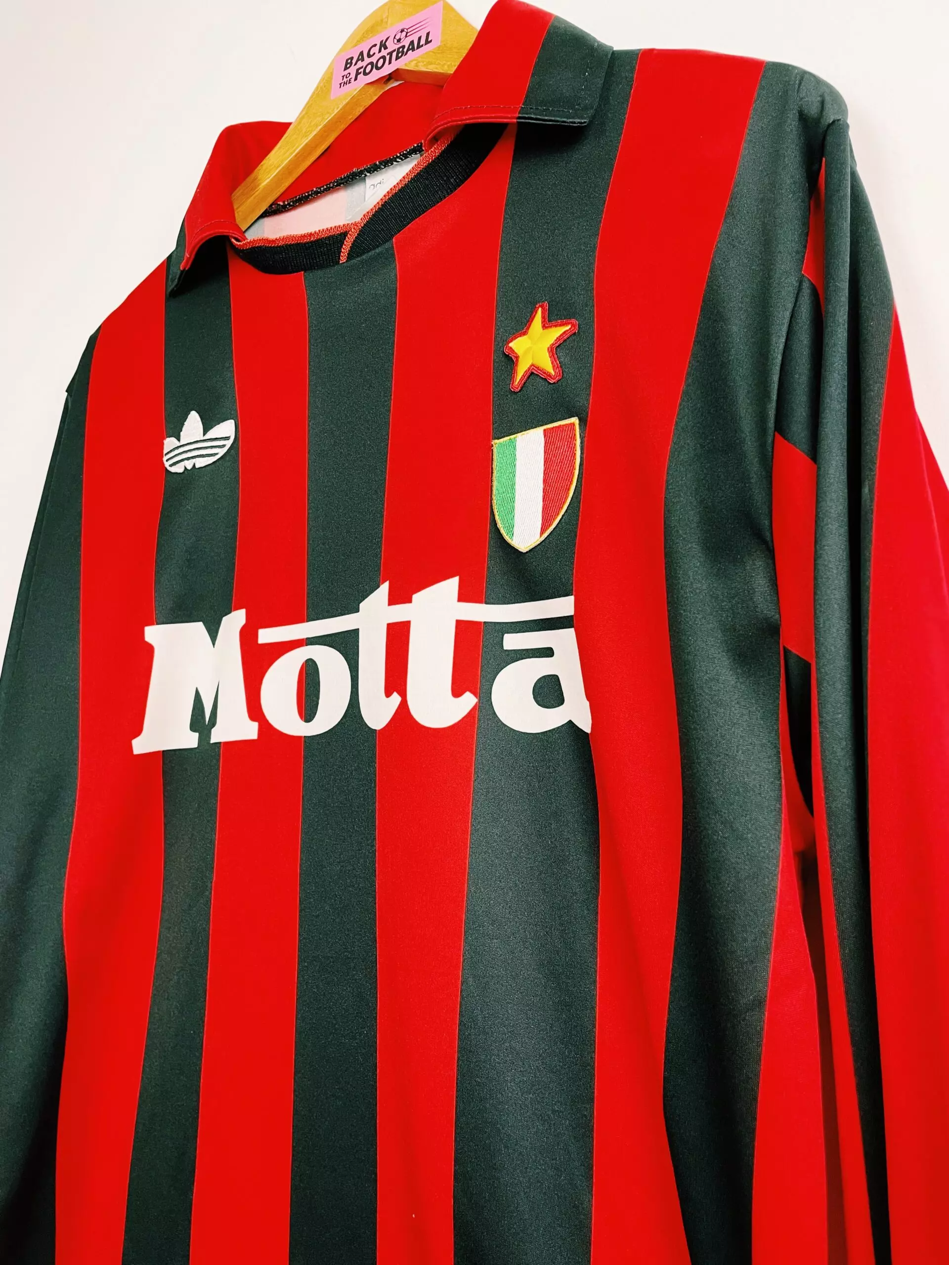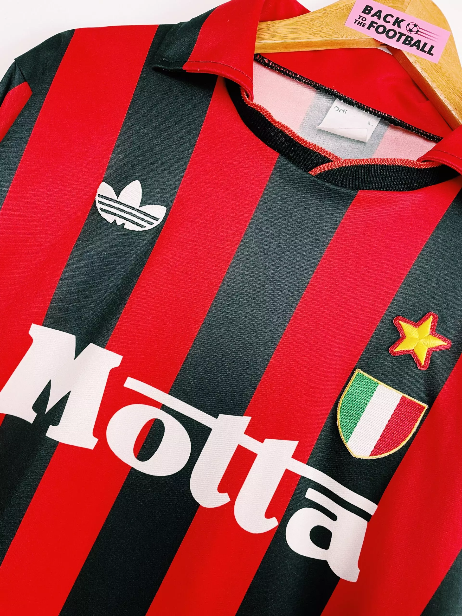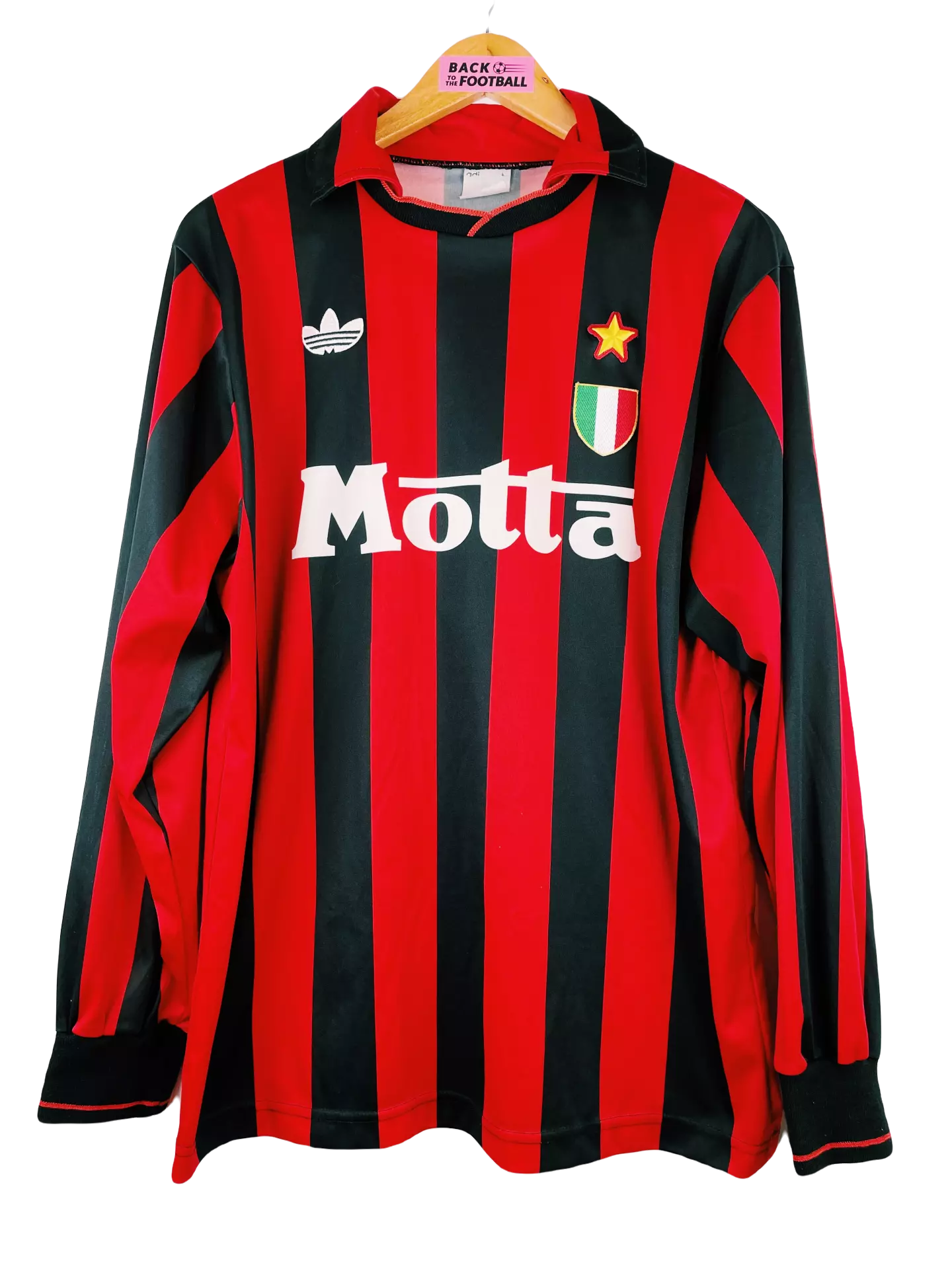 Taille : L Etat : très bon état pour son âge Le maillot : magnifique maillot vintage domicile de l’AC Milan saison 1992/1993 avec les manches longues. L’écusson italien et l’étoile sont brodés tout comme le logo Adidas à fleur. Le sponsor Motta est incrusté au maillot. Histoire : emmenés par le coach Fabio Capello, les Rossoneri gagneront le titre de champions de Serie a devant le rival l’Inter Milan. Ils gagneront également la super coupe d’Italie contre Parme. Grosse attaque avec Jean Pierre Papin et Marco Van Basten, 20 buts chacun sur la saison.