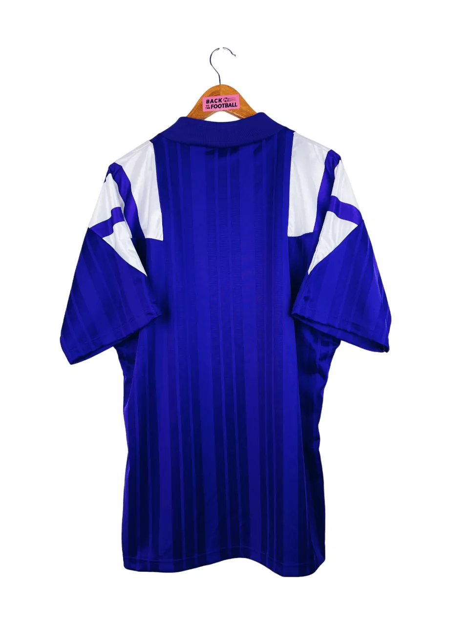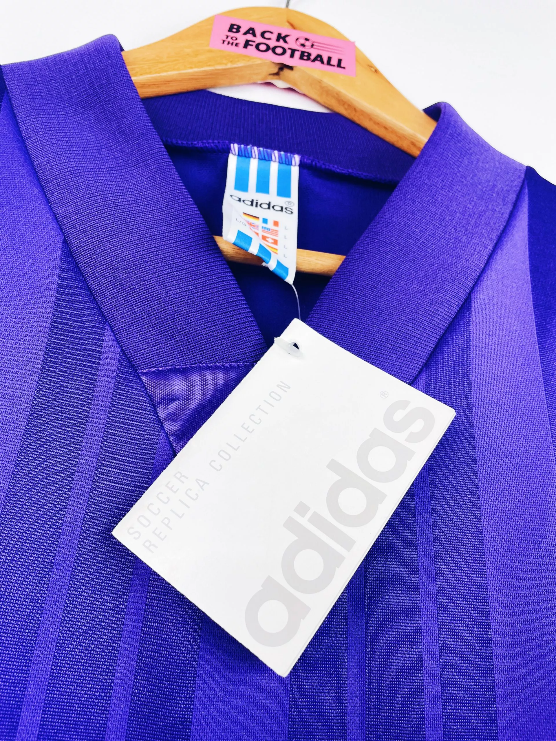 Taille : L Si tu veux plus de détails, tu peux nous contacter par mail ou sur les réseaux 😉 Etat : neuf avec étiquettes (BNWT) Le maillot : maillot vintage domicile d’Anderlecht 1992/1993. L’écusson, le logo Adidas et le sponsor sont en feutrine. Très beau maillot rétro du RSCA ! Histoire : très belle saison du RSC Anderlecht qui remporte le championnat belge. En Coupe UEFA, les belges sortiront en huitièmes face au PSG, à cause des buts à l’extérieur.