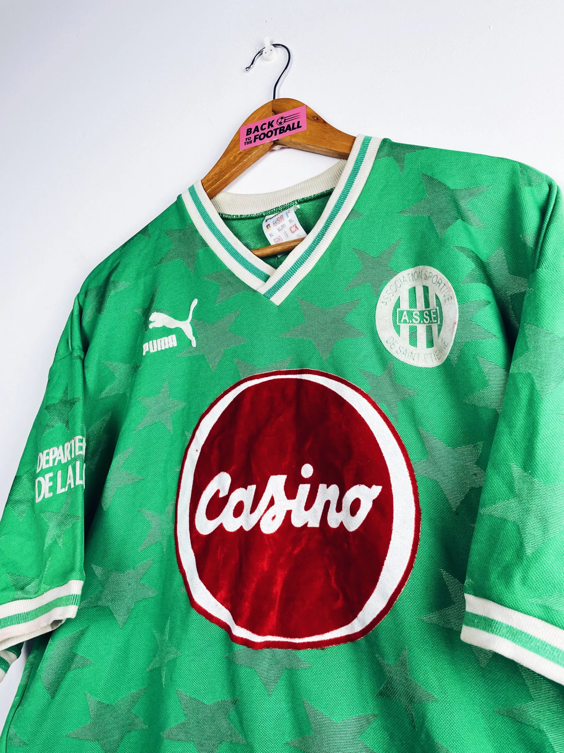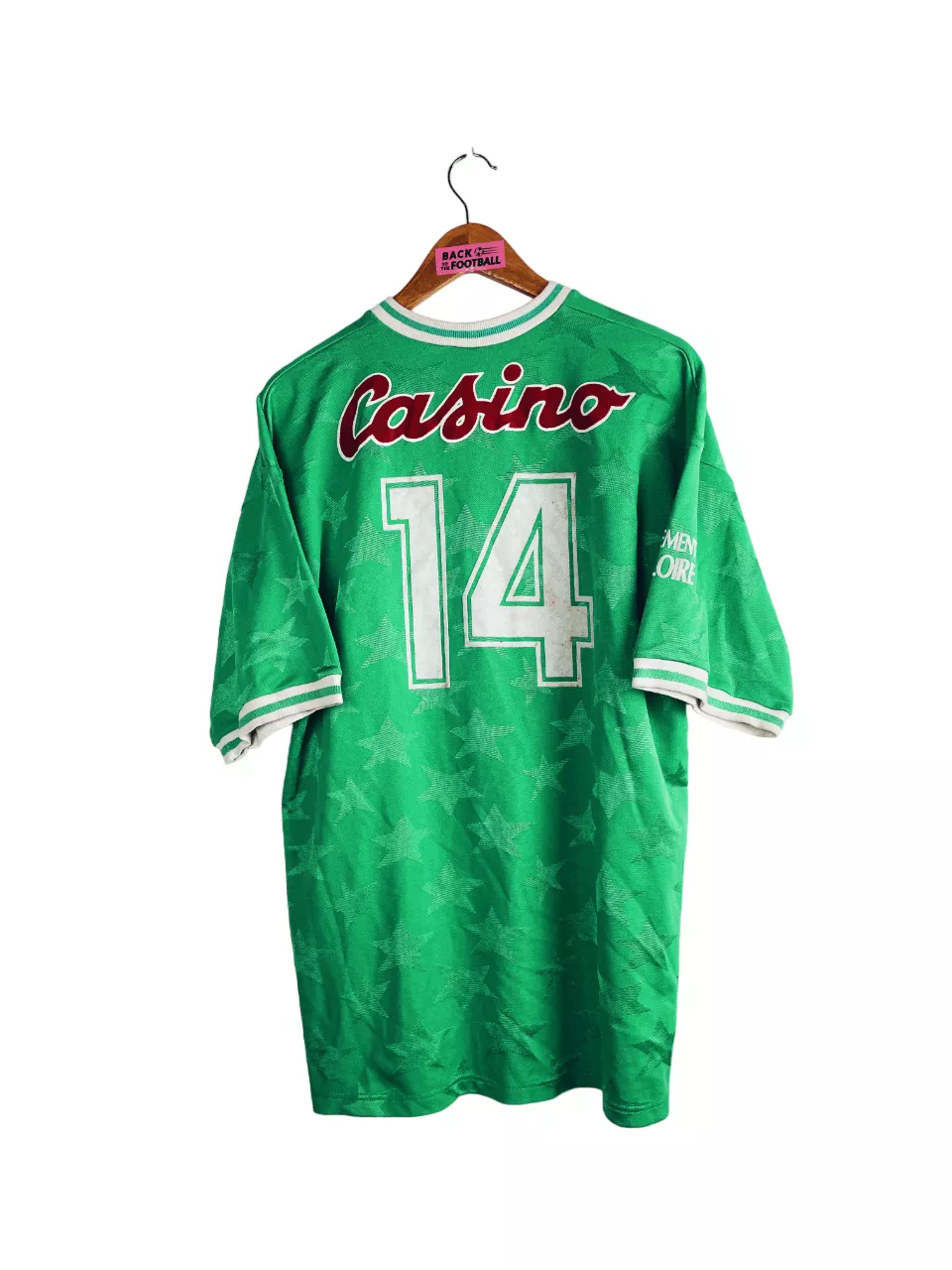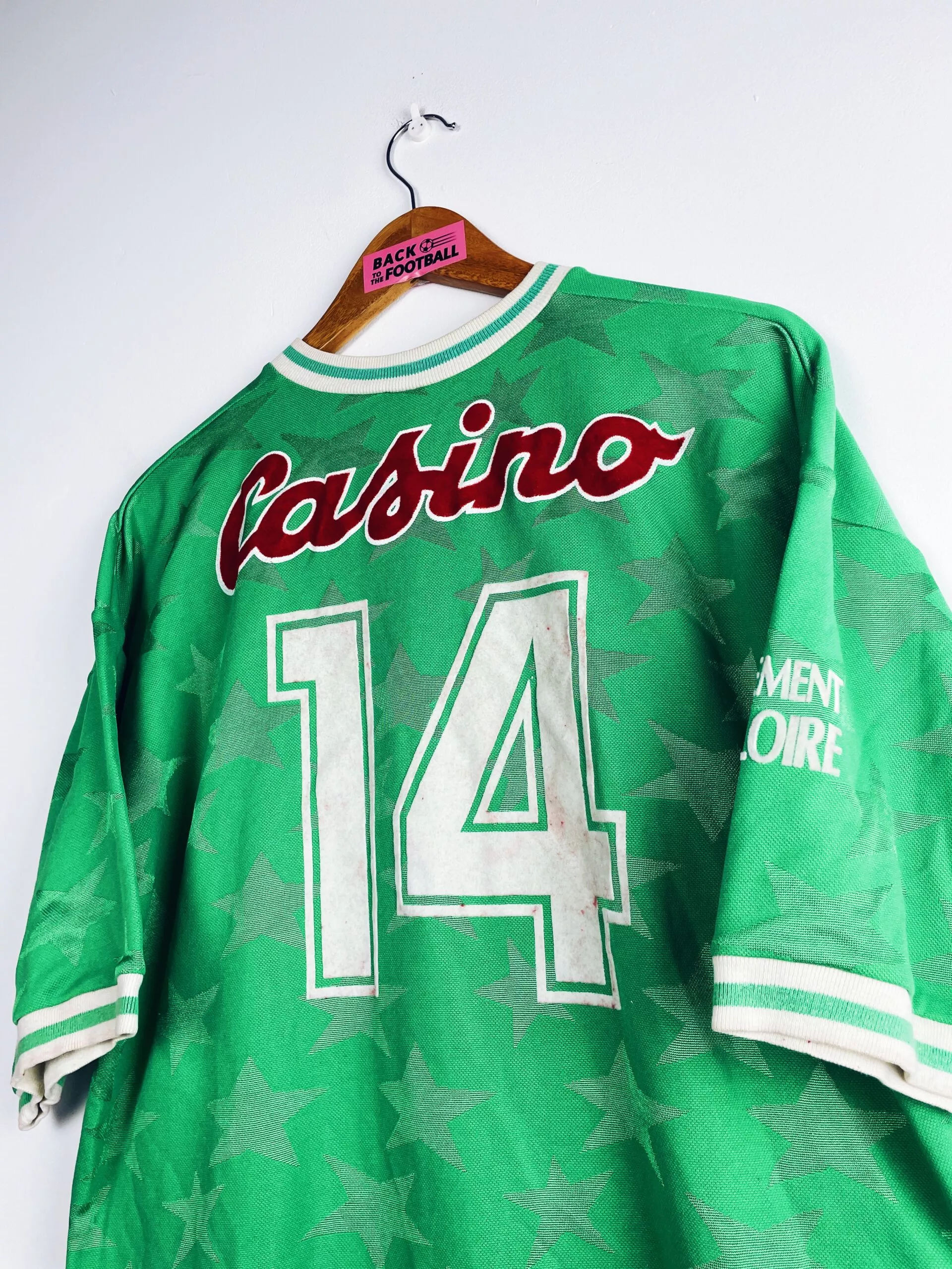 Taille : XL Si tu veux plus de détails, tu peux nous contacter par mail ou sur les réseaux 😉 Etat : 8/10, excellent état, la feutrine du numéro 14 est un peu rougie par endroit (voir photo) Le maillot : maillot vintage domicile de l’AS Saint-Etienne 1992/1993 porté (match worn) par Maurice Bouquet. Le maillot a été récupéré par un petit club du 42. L’écusson, le logo Puma et le sponsor Casino sont en feutrine. Le numéro 14 et le sponsor Département de la Loire sur la manche également. Les étoiles en tramé sur tout le maillot sont splendides.…