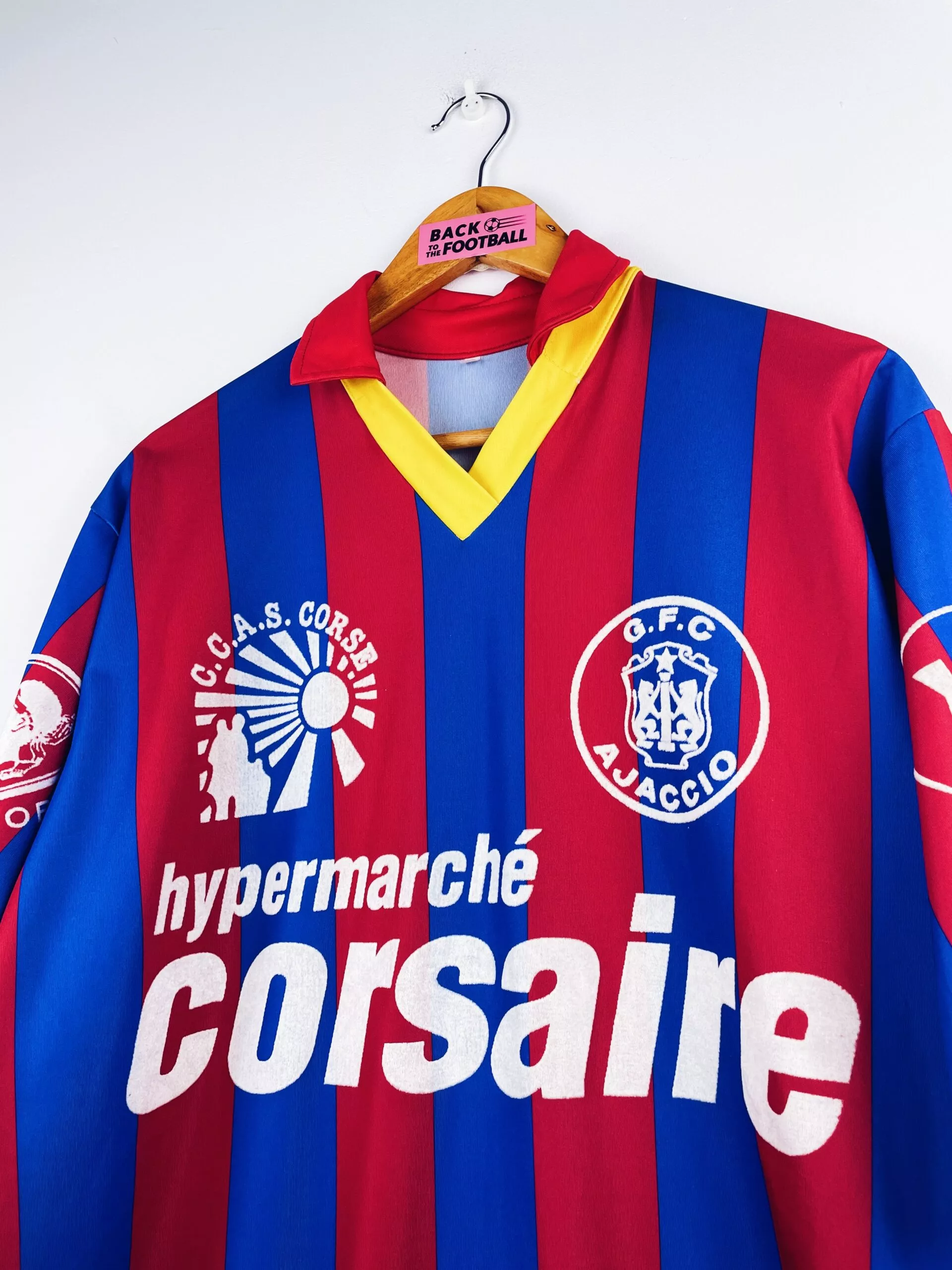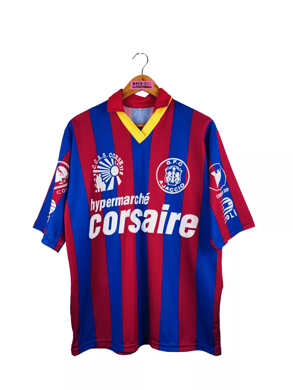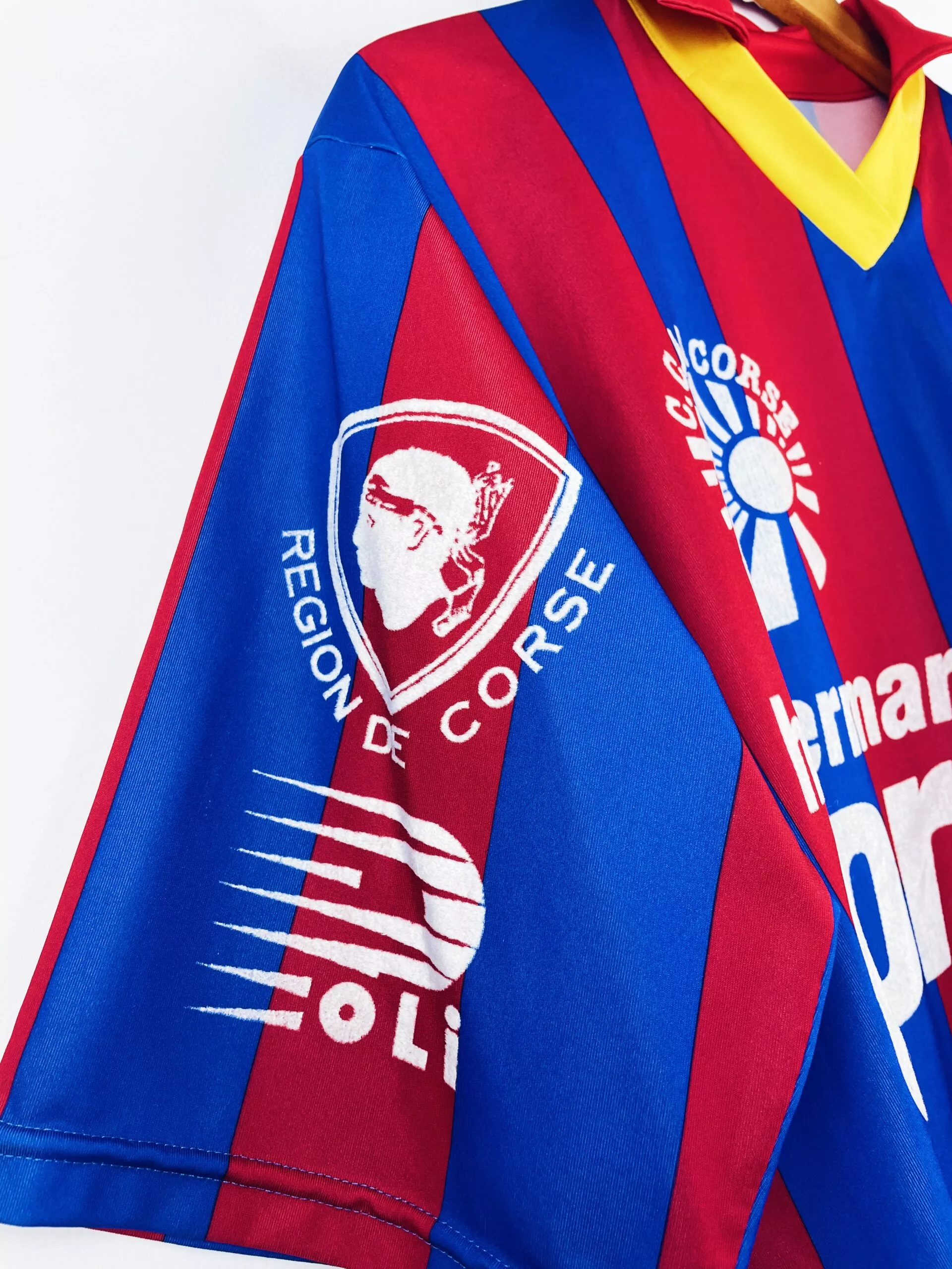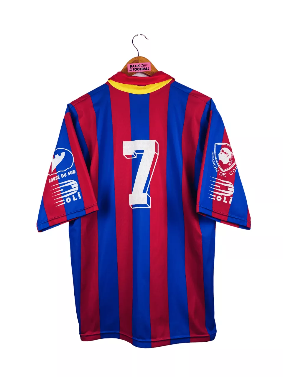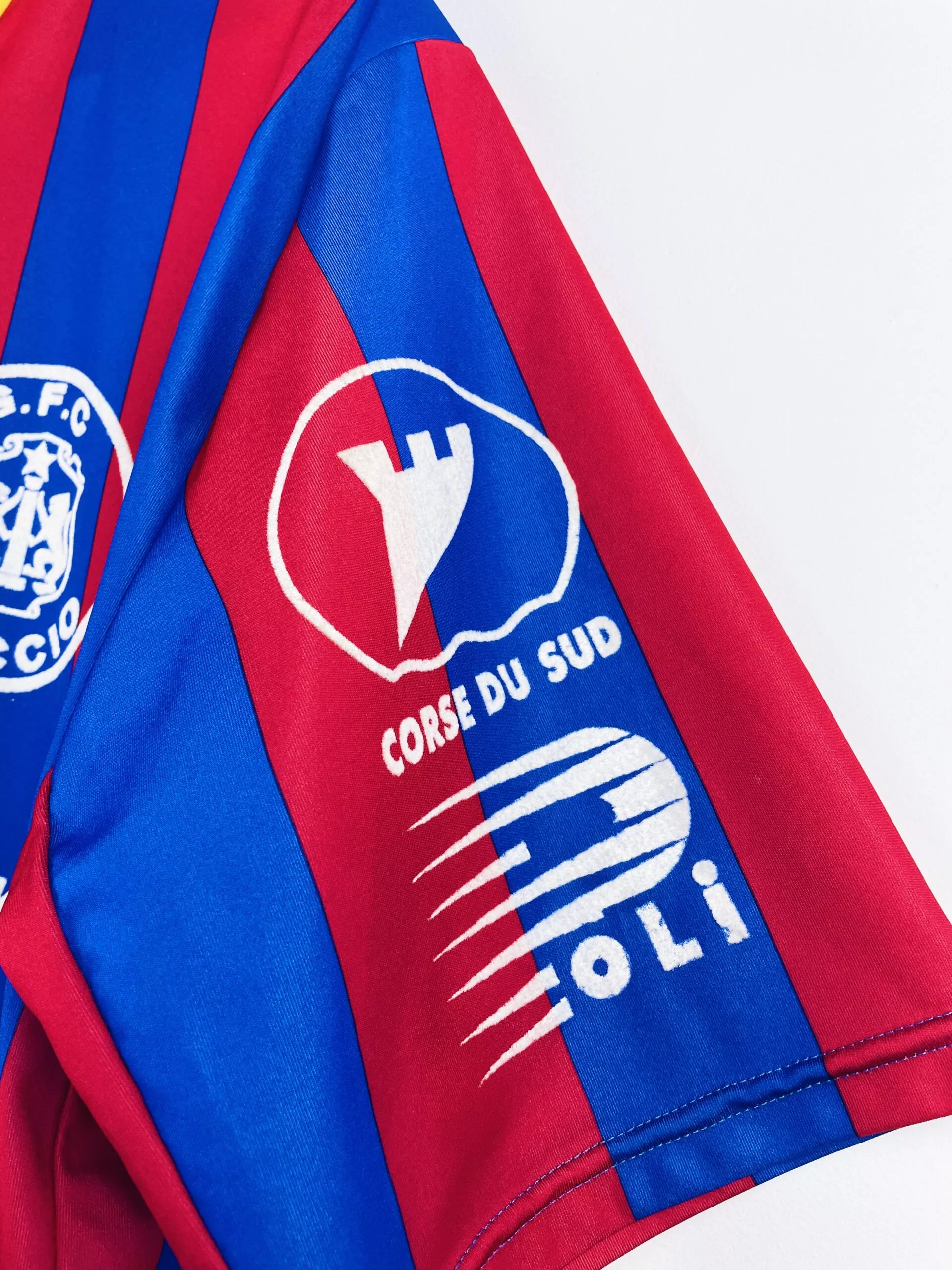 Taille : M Si tu veux plus de détails, tu peux nous contacter par mail ou sur les réseaux 😉 Etat : 8.5/10, excellent état Le maillot : maillot vintage domicile du Gazelec Ajaccio 1992/1993 floqué du numéro 7. Il a peut-être été préparé (match issue) ou porté (match worn). Potentiellement Eric Geraldes. L’écusson, les différents sponsors et le numéro 7 sont en feutrine. Très beau maillot rétro du GFCA ! Histoire : les corses terminent à la 13ème place de Division 2. Ils iront jusqu’en 8èmes de Coupe de France mais seront éliminés par Nantes. Son et Pelletier seront…