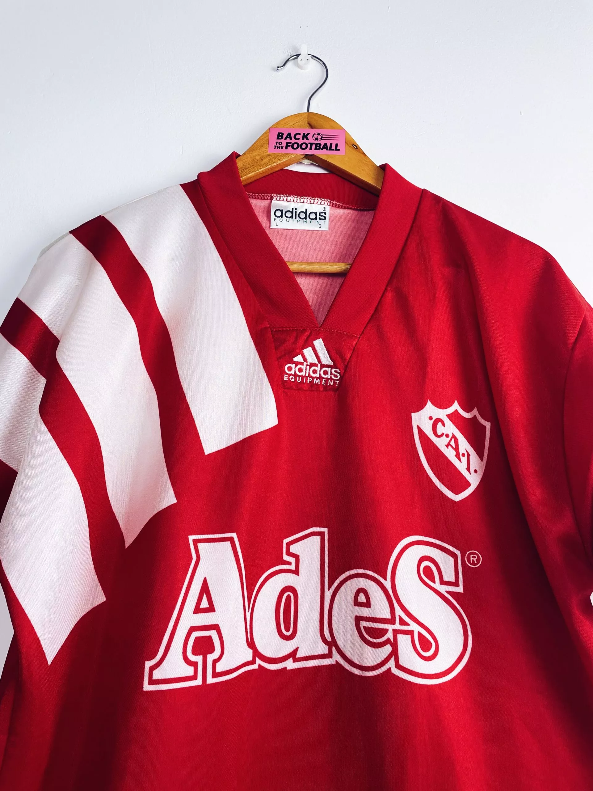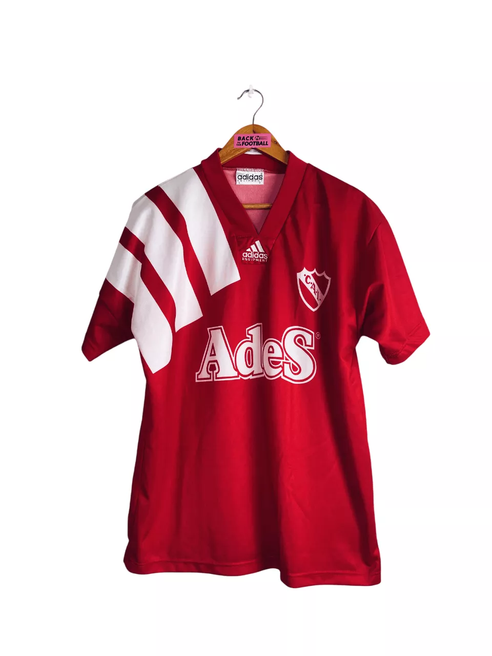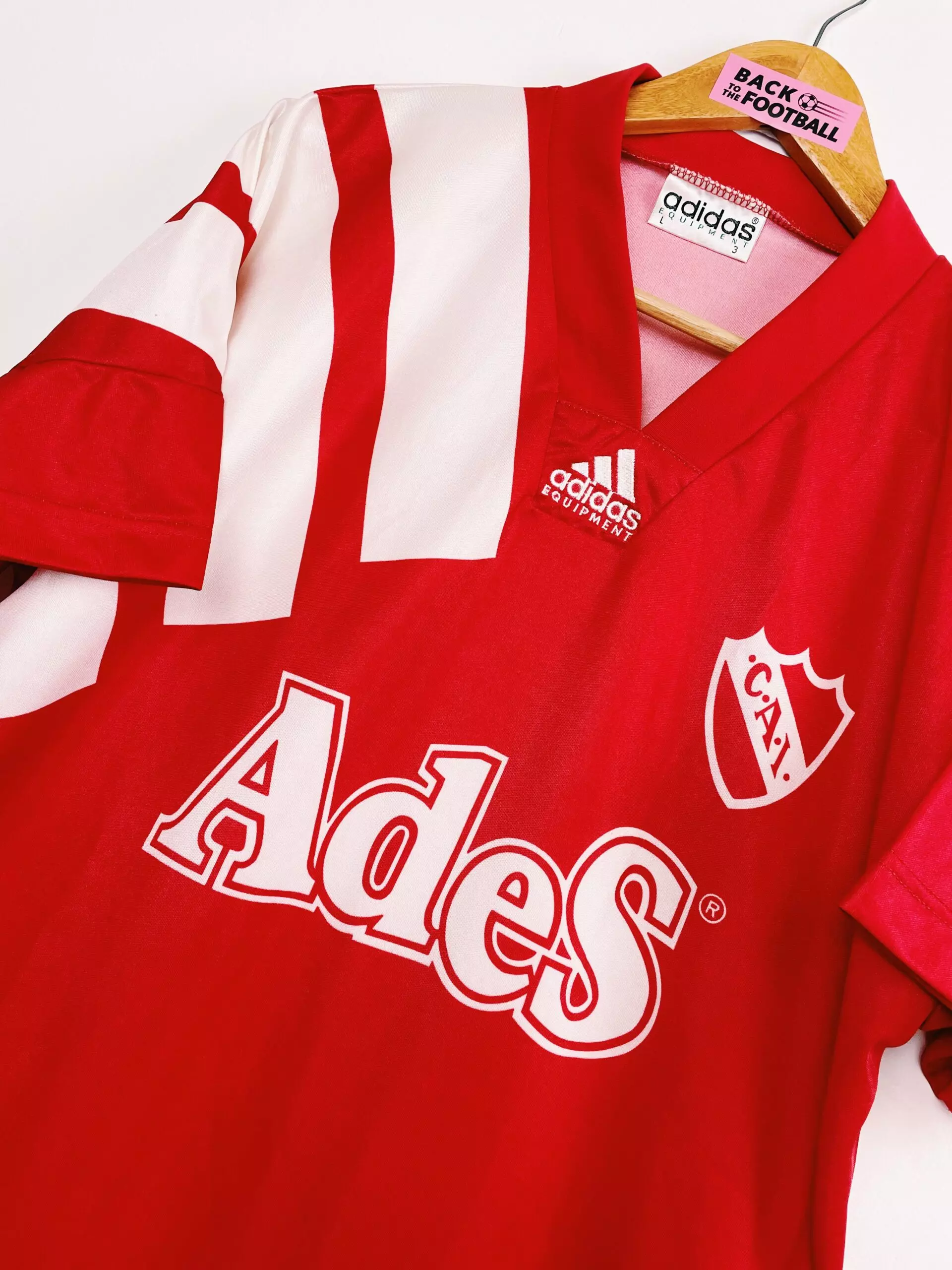Taille : L Etat : 8/10, très bon état Le maillot : maillot vintage domicile de l’Independiente 1992/1993. L’écusson est incrusté comme le sponsor Ades, le logo Adidas est brodé. Très beau maillot rétro de l’Independiente, pour les fans du championnat Argentin. Histoire : lors du tournoi d’ouverture de Primera División, le club de Buenos Aires termine à la 15ème place. Les joueurs feront beaucoup mieux lors du tournoi de fermeture avec une 2ème place, trois points derrière le Vélez Sarsfield.