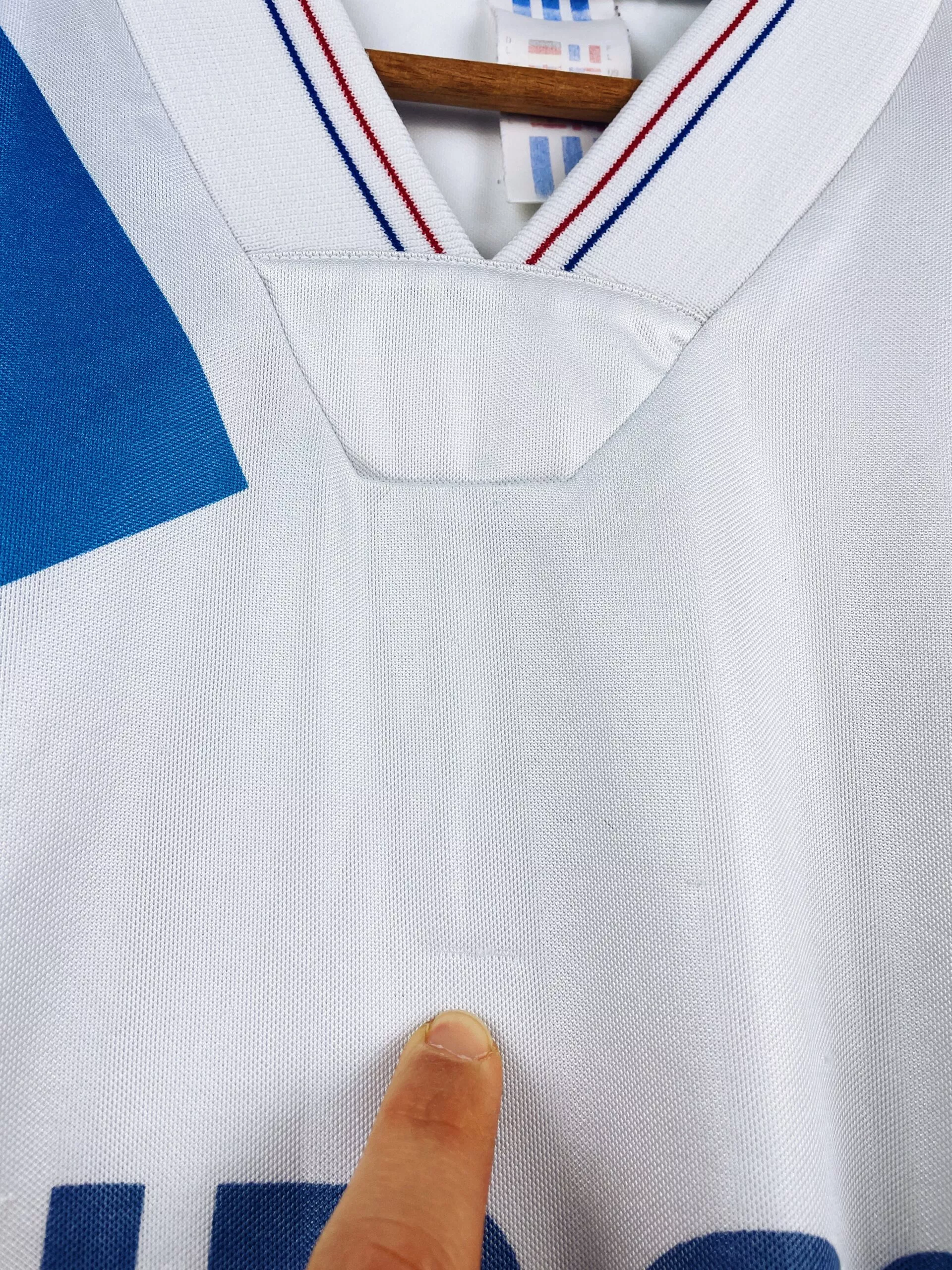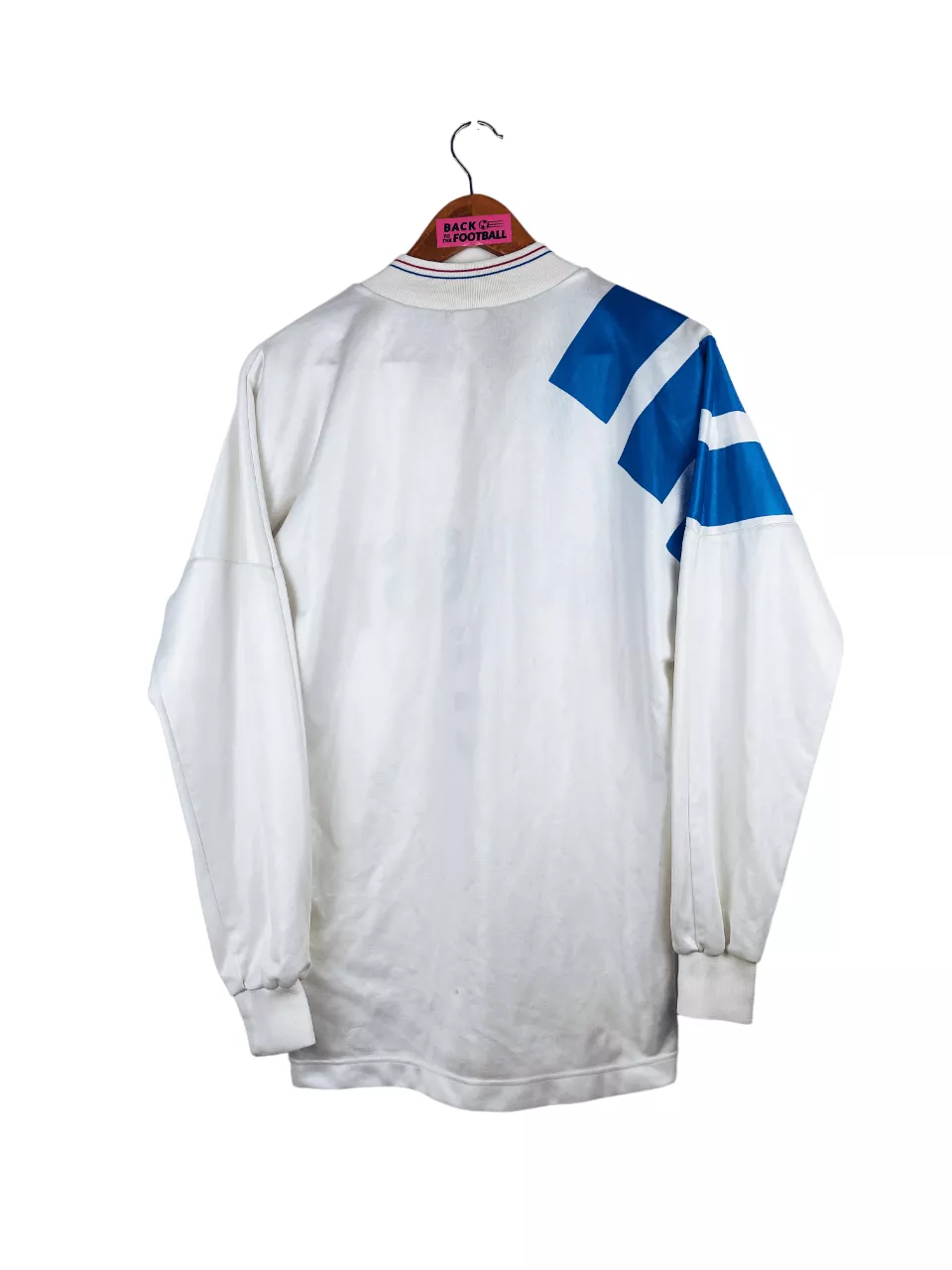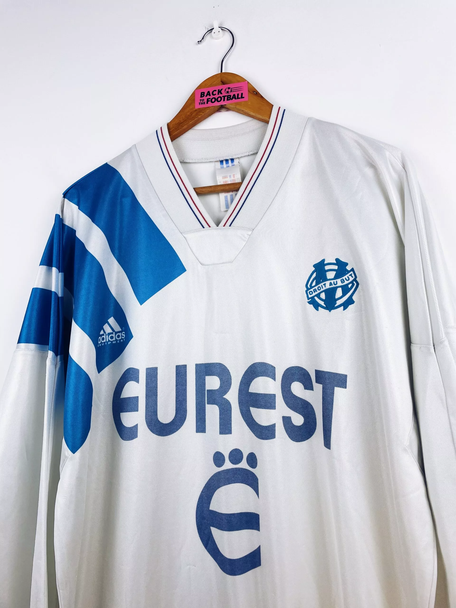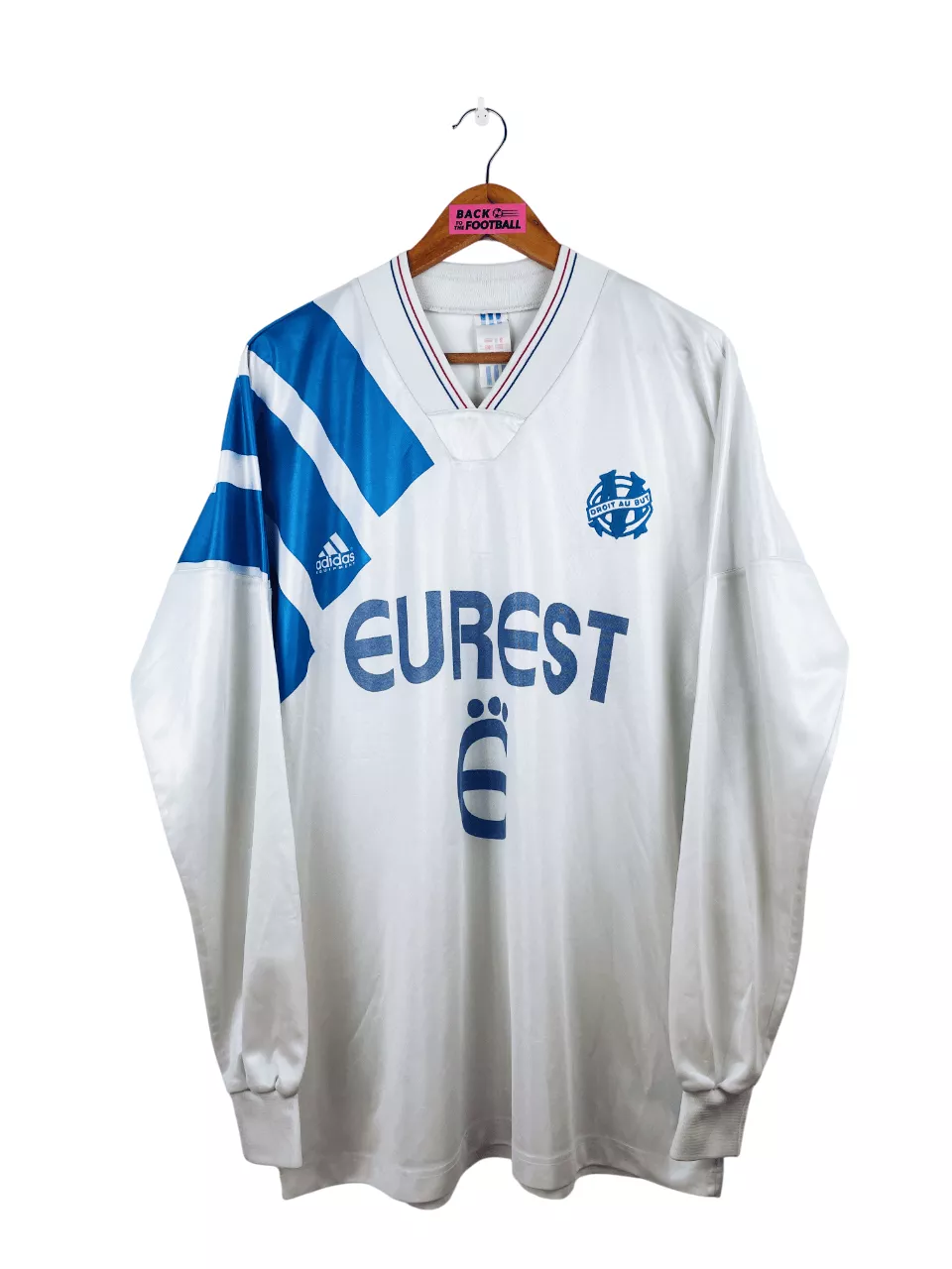 Taille : L, taille large Largeur : 56cm (aisselle à aisselle) Longueur : 76cm (base du col au bas) Si tu veux plus de détails, tu peux nous contacter par mail ou sur les réseaux 😉 Etat : 7/10. bon état général, le sponsor a perdu de sa brillance, plusieurs petits accros et bouloches (voir photos). Le maillot : maillot vintage domicile de l’OM 1992/1993 manches longues. L’écusson est en feutrine, le logo Adidas et le sponsor Eurest sont incrustés au maillot. Très beau maillot rétro de l’Olympique de Marseille ! Histoire : saison énorme de l’OM avec une victoire…