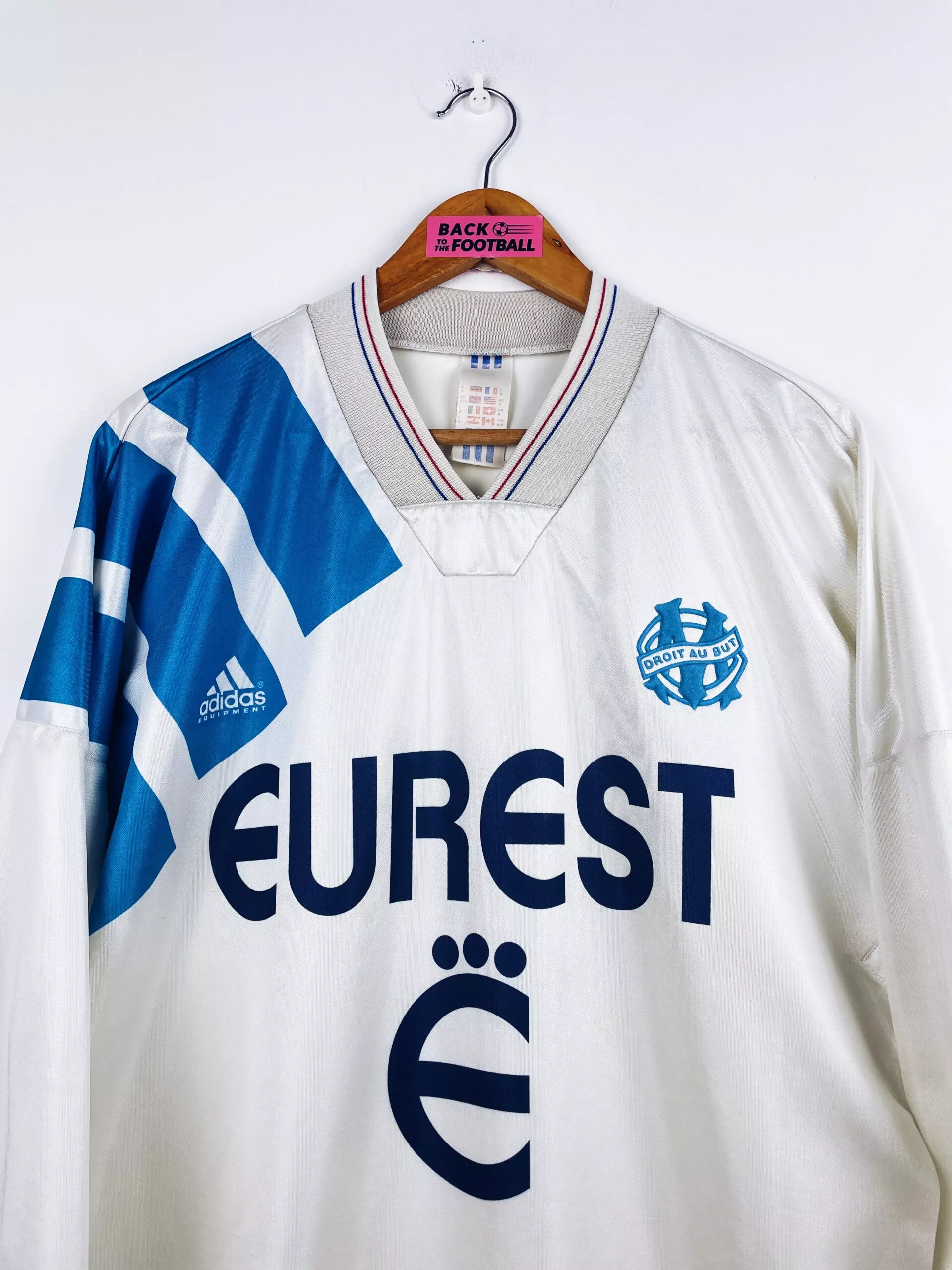 Taille : M Largeur : 53cm (aisselle à aisselle) Longueur : 72cm (base du col au bas) Si tu veux plus de détails, tu peux nous contacter par mail ou sur les réseaux 😉 Etat : 8.5/10, excellent état, col moins blanc qu’à l’origine, 2-3 minis accrocs Le maillot : maillot vintage domicile de l’OM 1992/1993 manches longues. L’écusson est en feutrine, le logo Adidas et le sponsor Eurest sont incrustés au maillot. Très beau maillot rétro de l’Olympique de Marseille ! Histoire : saison énorme de l’OM avec une victoire en Ligue des Champions contre l’AC Milan grâce au…