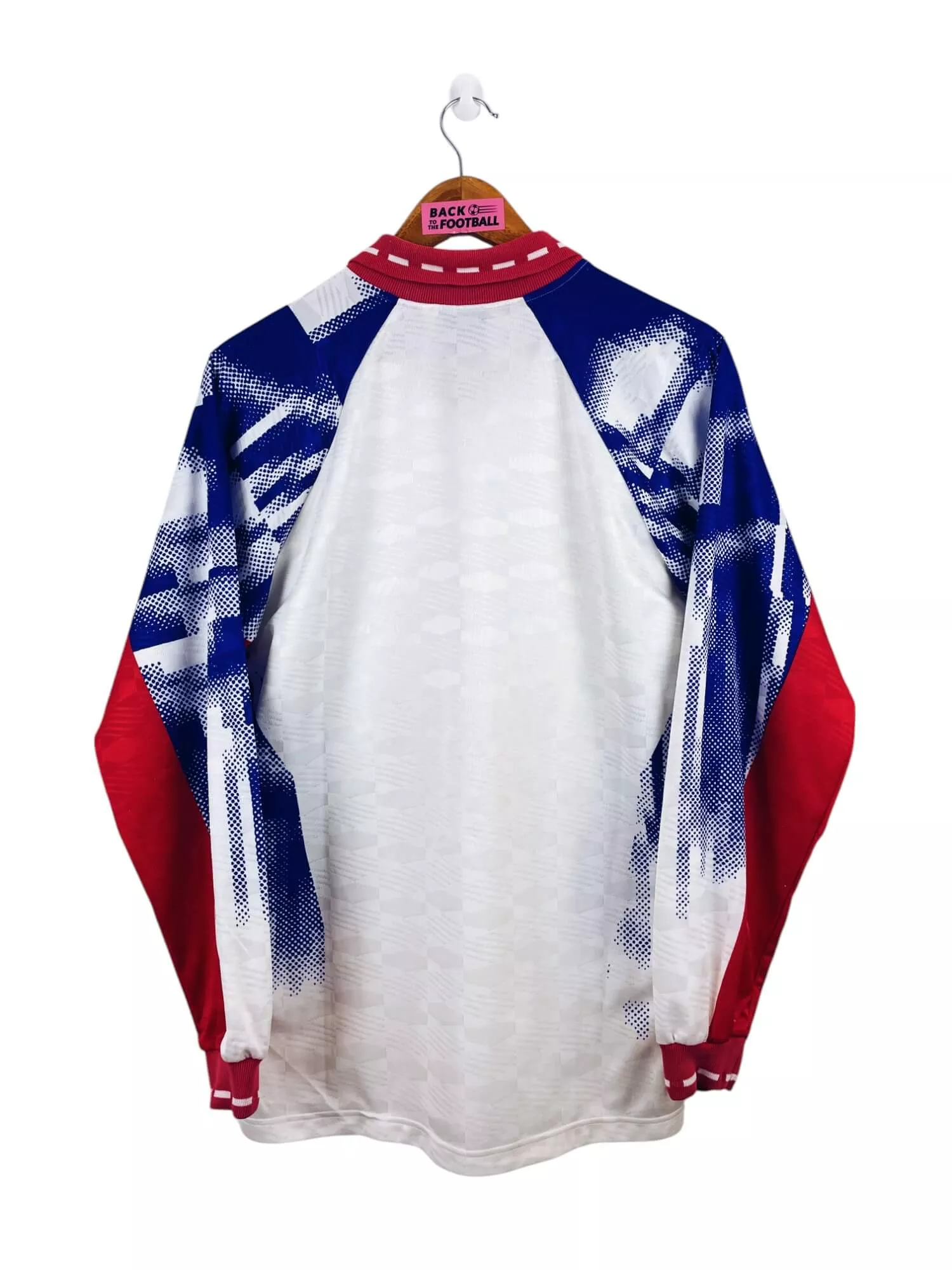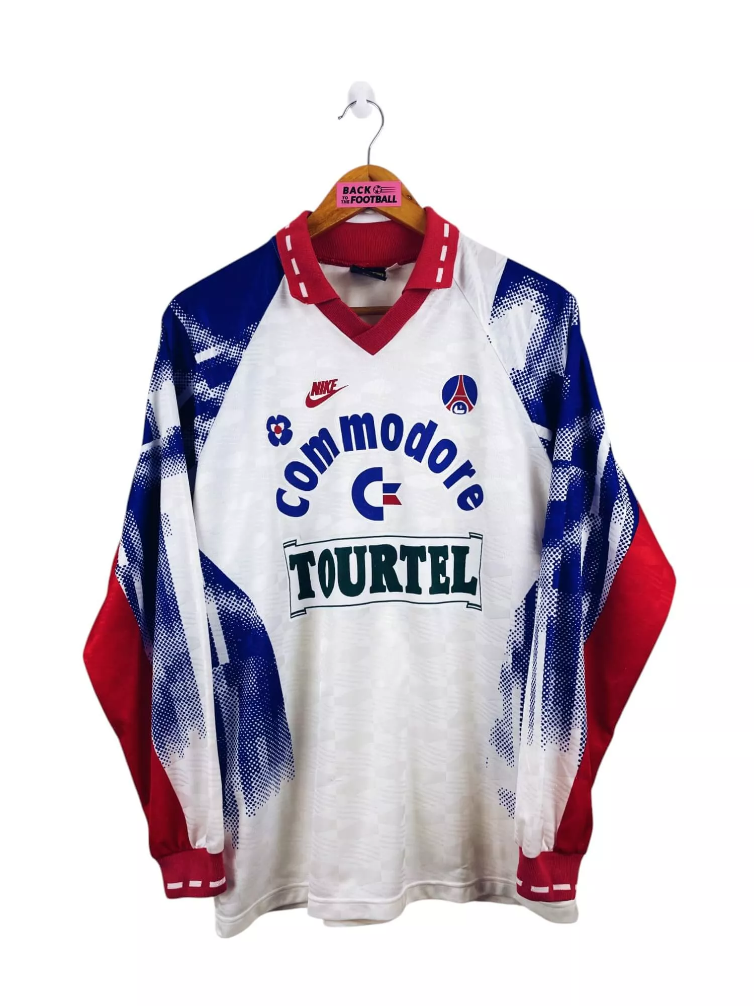 Taille : S Largeur : 51cm (aisselle à aisselle) Longueur : 69cm (base du col au bas) Si tu veux plus de détails, tu peux nous contacter par mail ou sur les réseaux 😉 Etat : 8.5/10 excellent état hormis le logo Nike un peu abimé (voir photo) Le maillot : maillot vintage domicile PSG 1992/1993 manches longues. L’écusson, le logo Nike et les sponsors Commodore et Tourter sont floqués. Très beau maillot rétro du Paris Saint Germain ! Histoire : bonne saison des parisiens qui terminent 2èmes de D1, à 2 points de l’OM. Ils remportent la Coupe de…