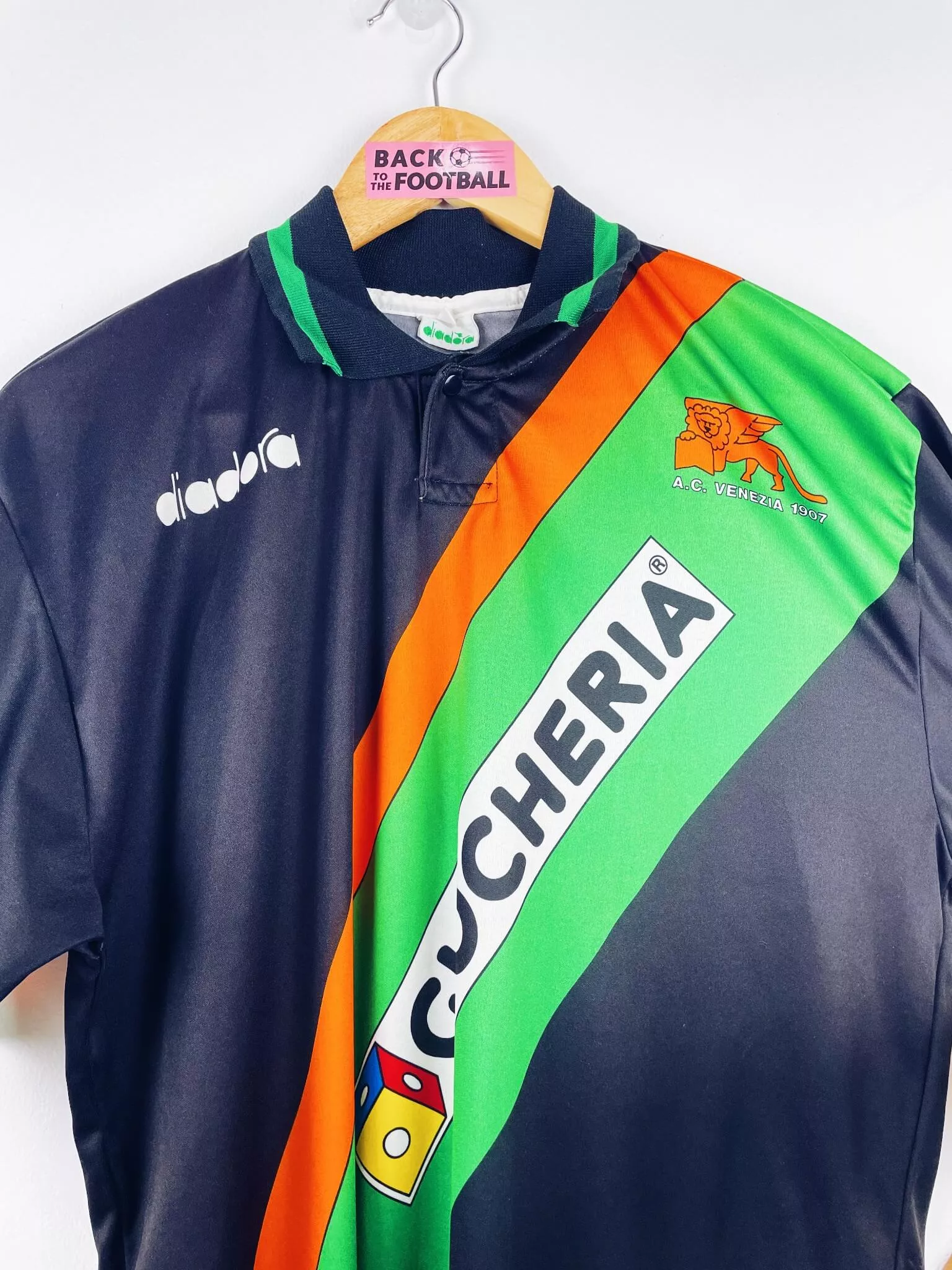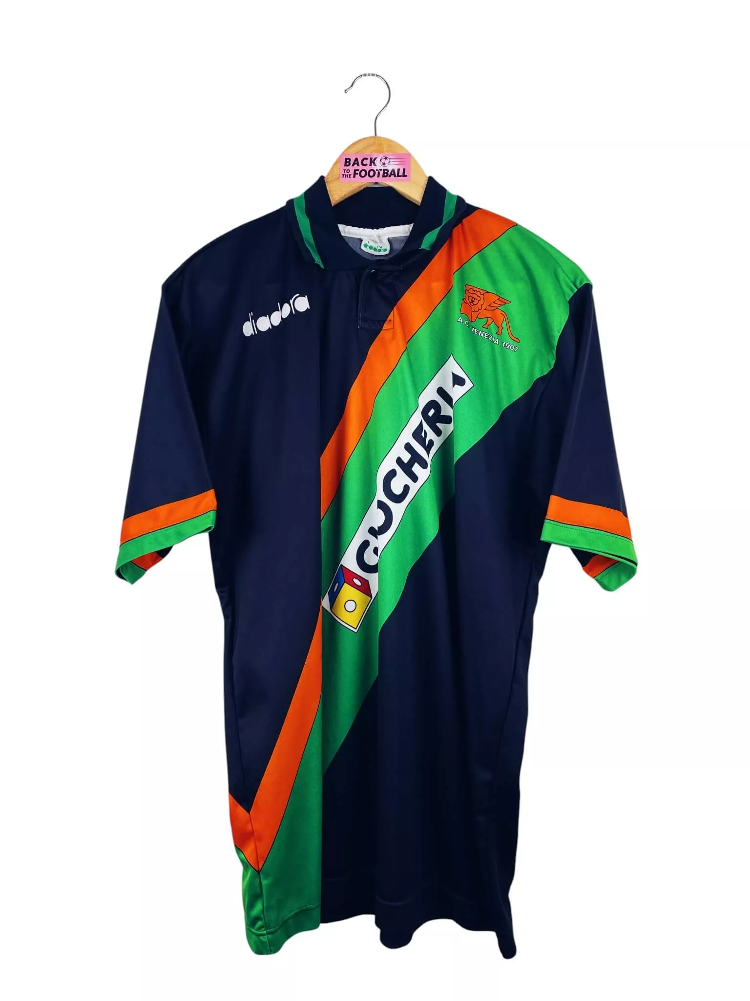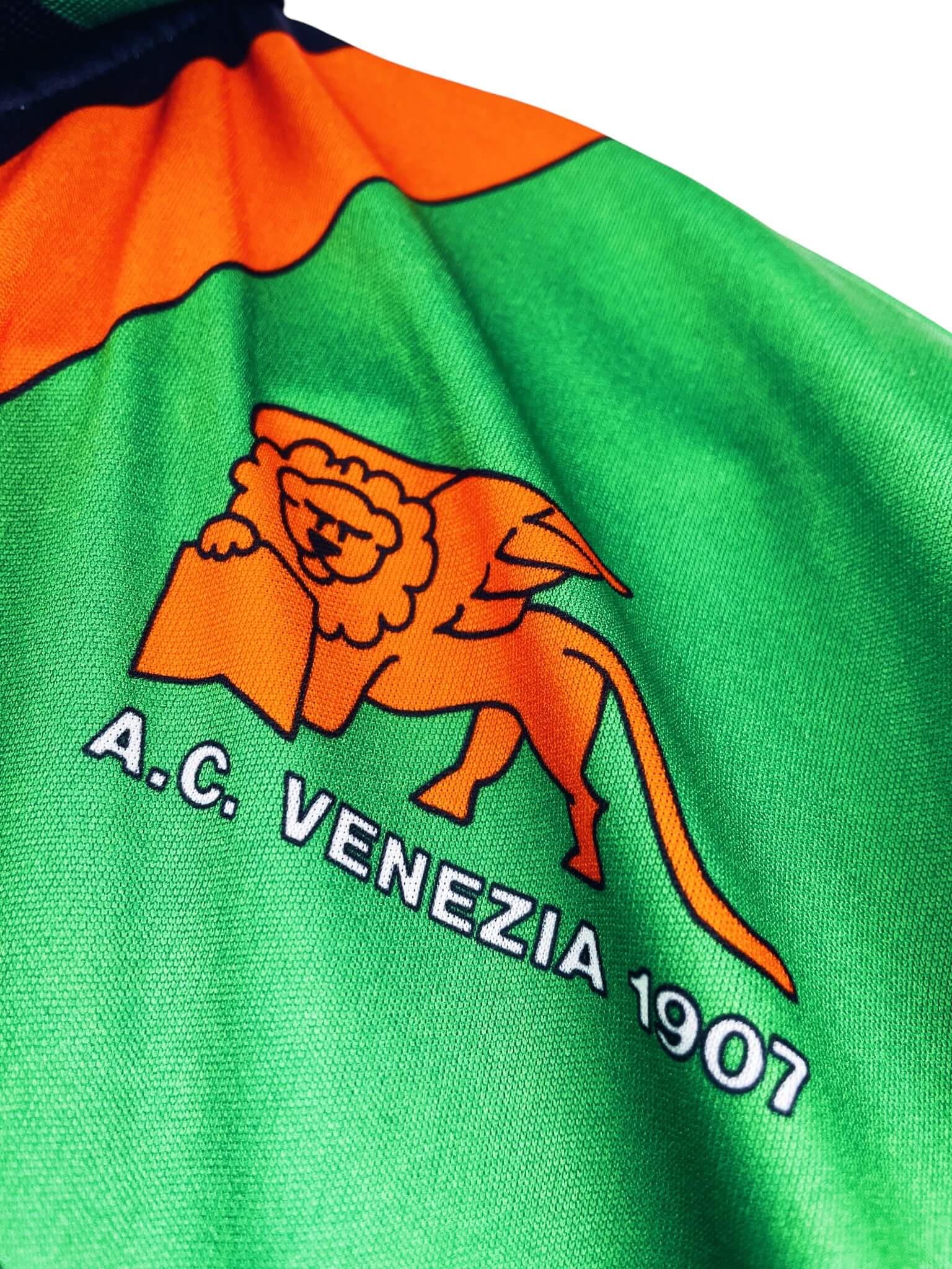 Taille : L Largeur : 54cm (aisselle à aisselle) Longueur : 73cm (base du col au bas) Si tu veux plus de détails, tu peux nous contacter par mail ou sur les réseaux 😉 Etat : 9/10, excellent état Le maillot : maillot vintage domicile de Venezia 1992/1993. L’écusson, le logo Diadora et le sponsor Giocheria sont incrustés, le numéro 16 est en feutrine. Très beau maillot rétro de Venise ! Histoire : le club de Venise termine à la 11ème place de Serie B. Le Venezia sera éliminé en huitième de finale de Coupe d’Italie contre Parme. Bonaldi marquera…