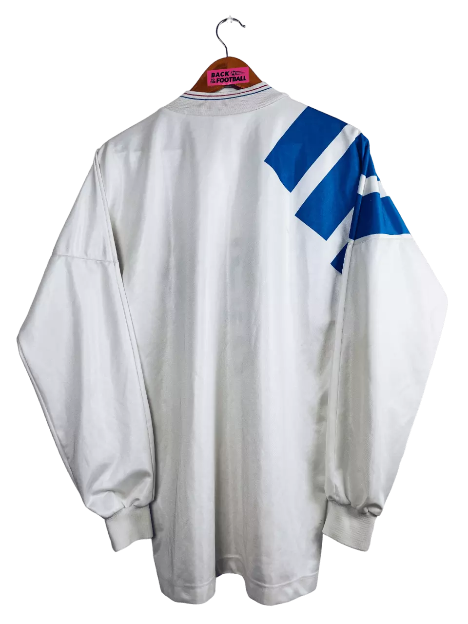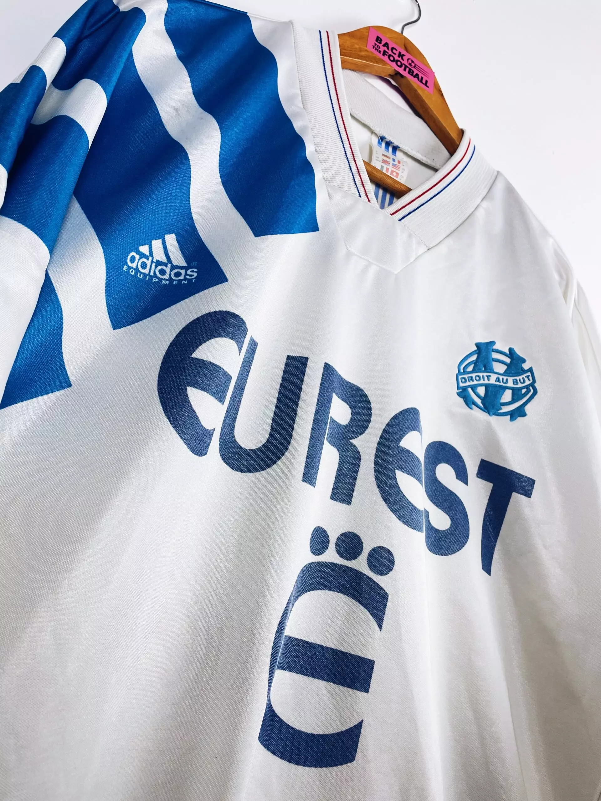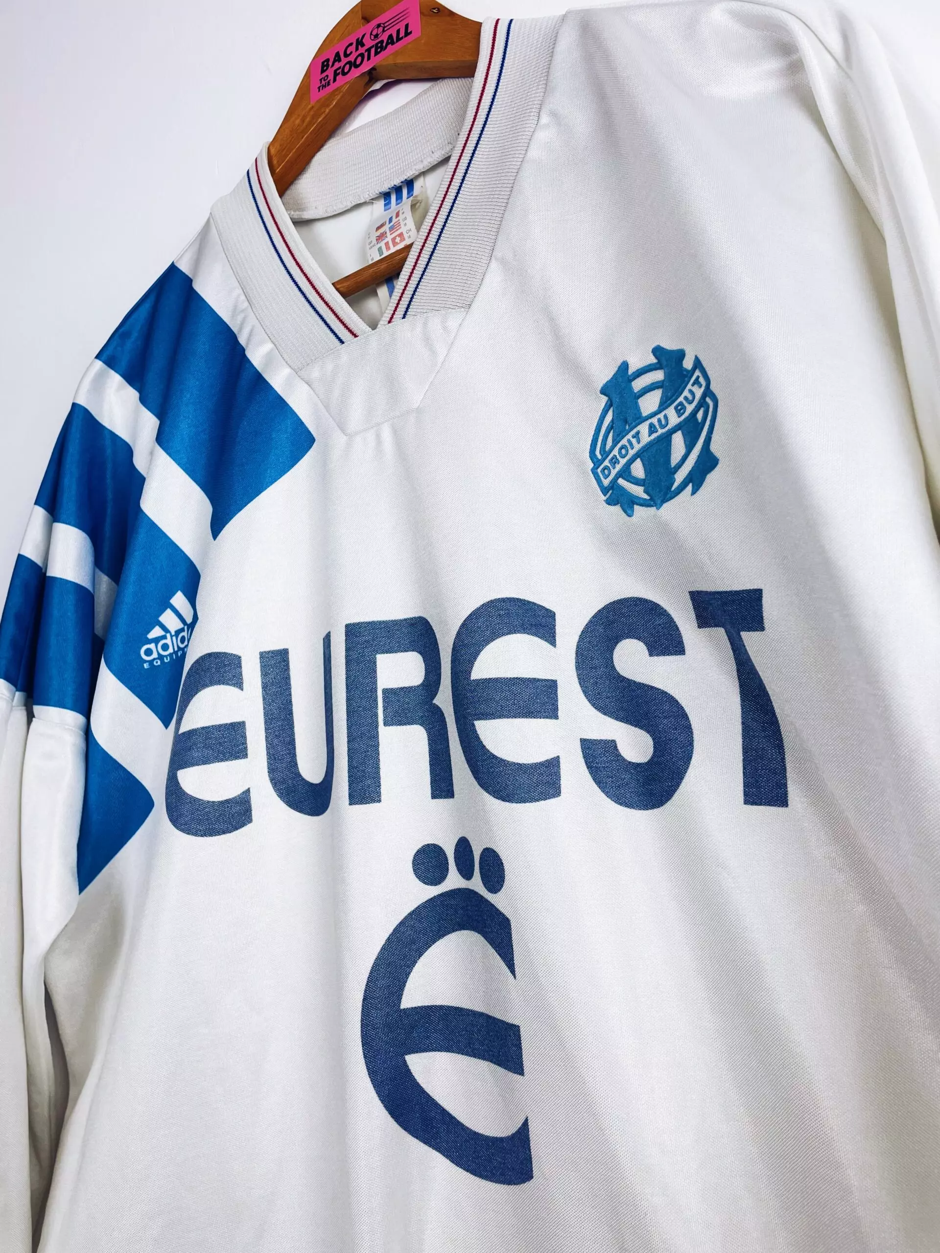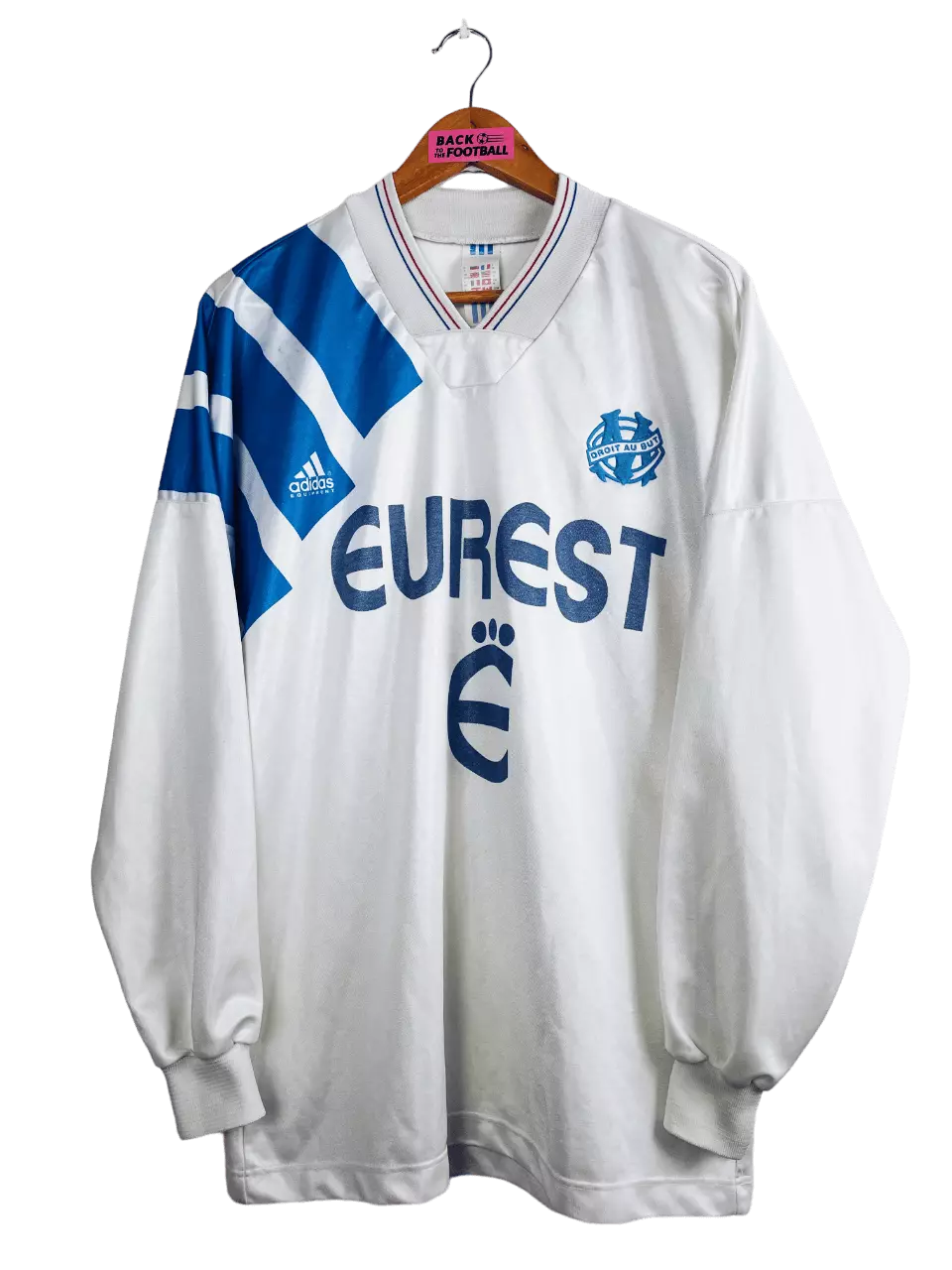 Taille : M Etat : 7/10. Le sponsor a perdu de sa couleur, il y a une légère trace sur le devant et sur le col et il y a des bouloches (voir photos) Le maillot : rare maillot vintage de l’OM 1992/1993 version manches longues. L’écusson de l’Olympique de Marseille est en feutrine, le logo Adidas et le sponsor Eurest sont incrustés au maillot. Très beau maillot rétro de l’OM ! Histoire : saison énorme de l’OM avec une victoire en Ligue des Champions contre l’AC Milan grâce au fameux but de Basile Boli. Les Olympiens finiront 1ers de…