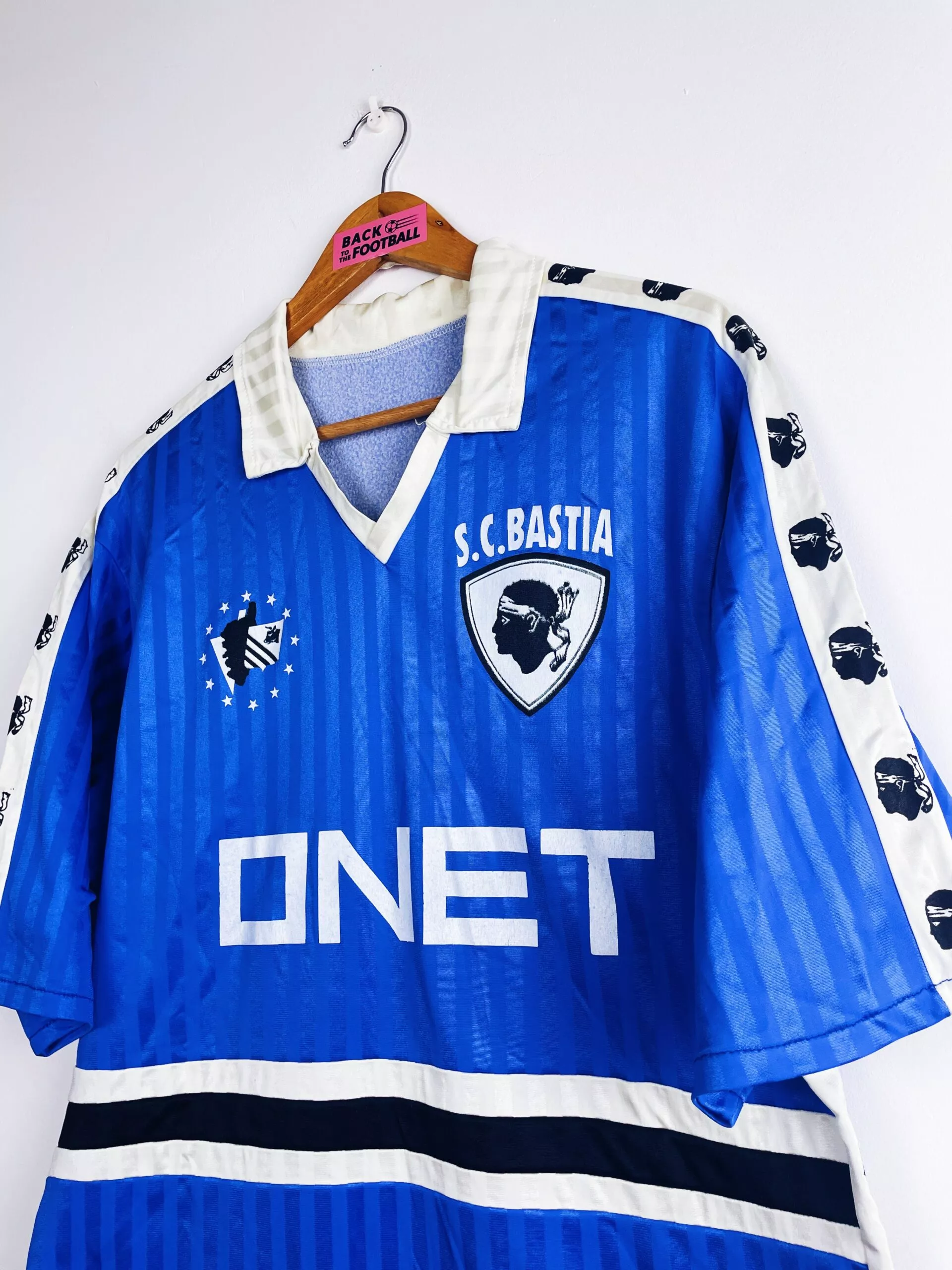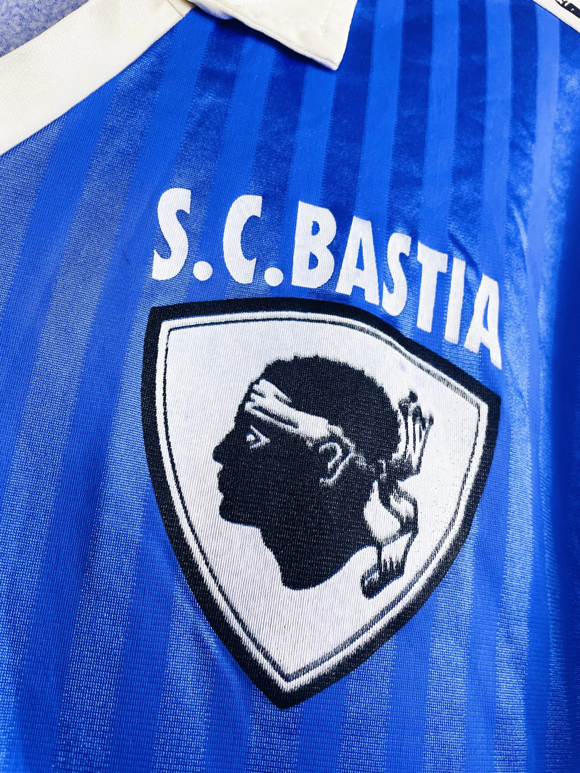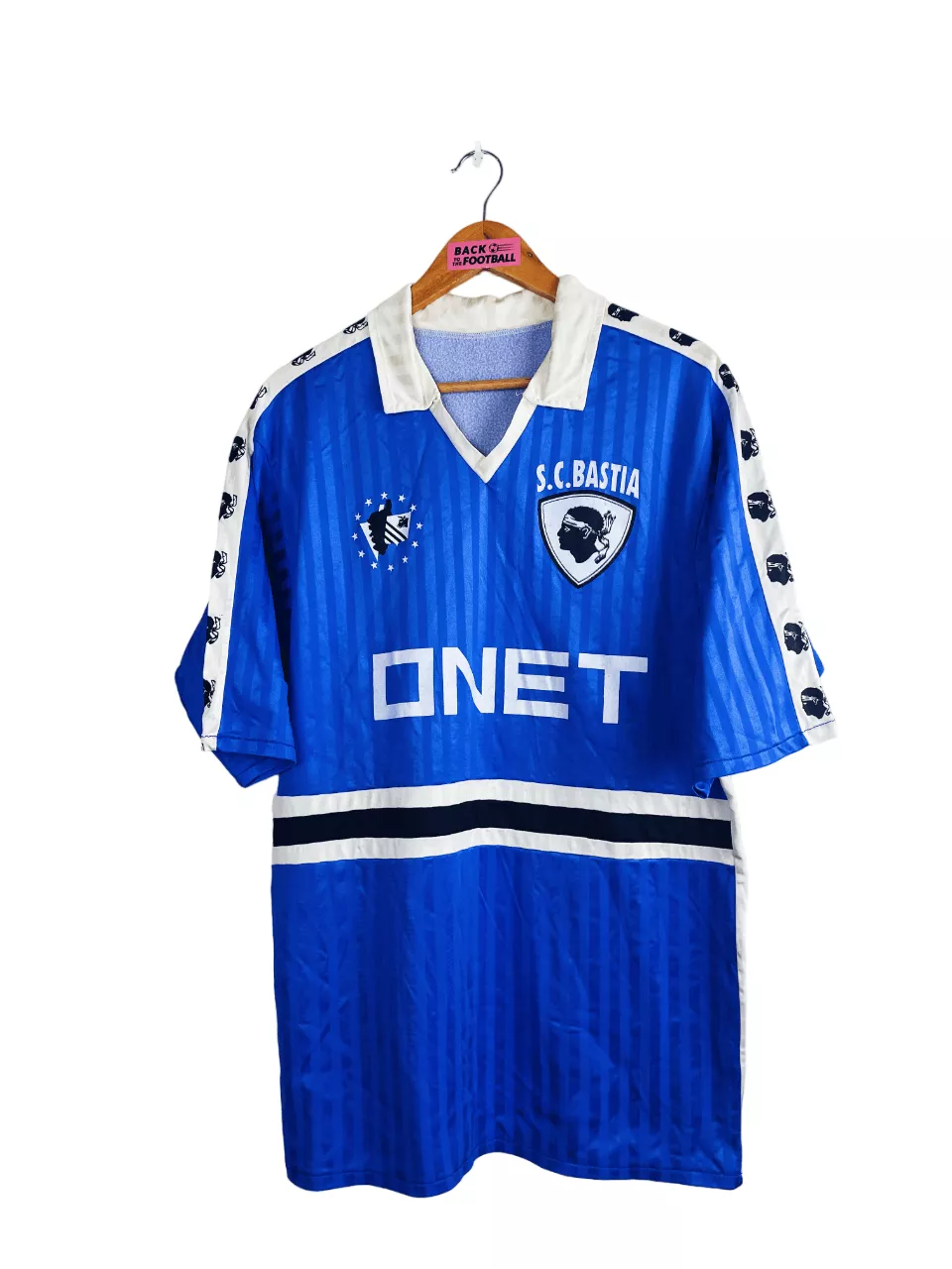 Taille : L/XL Largeur : 53cm (aisselle à aisselle) Longueur : 76cm (base du col au bas) Si tu veux plus de détails, tu peux nous contacter par mail ou sur les réseaux 😉 Etat : 8/10, très bon état, le flocage Onet a légèrement vieilli. Le maillot : maillot vintage domicile du SC Bastia 1992/1993. L’écusson, l’équipementier Corfatex, le logo Onet sont floqués. Les manches sont splendides. Potentiellement un stock pro (player issue), mais pas sûr, si t’as des infos on est preneur ! Très beau maillot rétro du SC Bastia ! Histoire : quelques mois seulement après le…