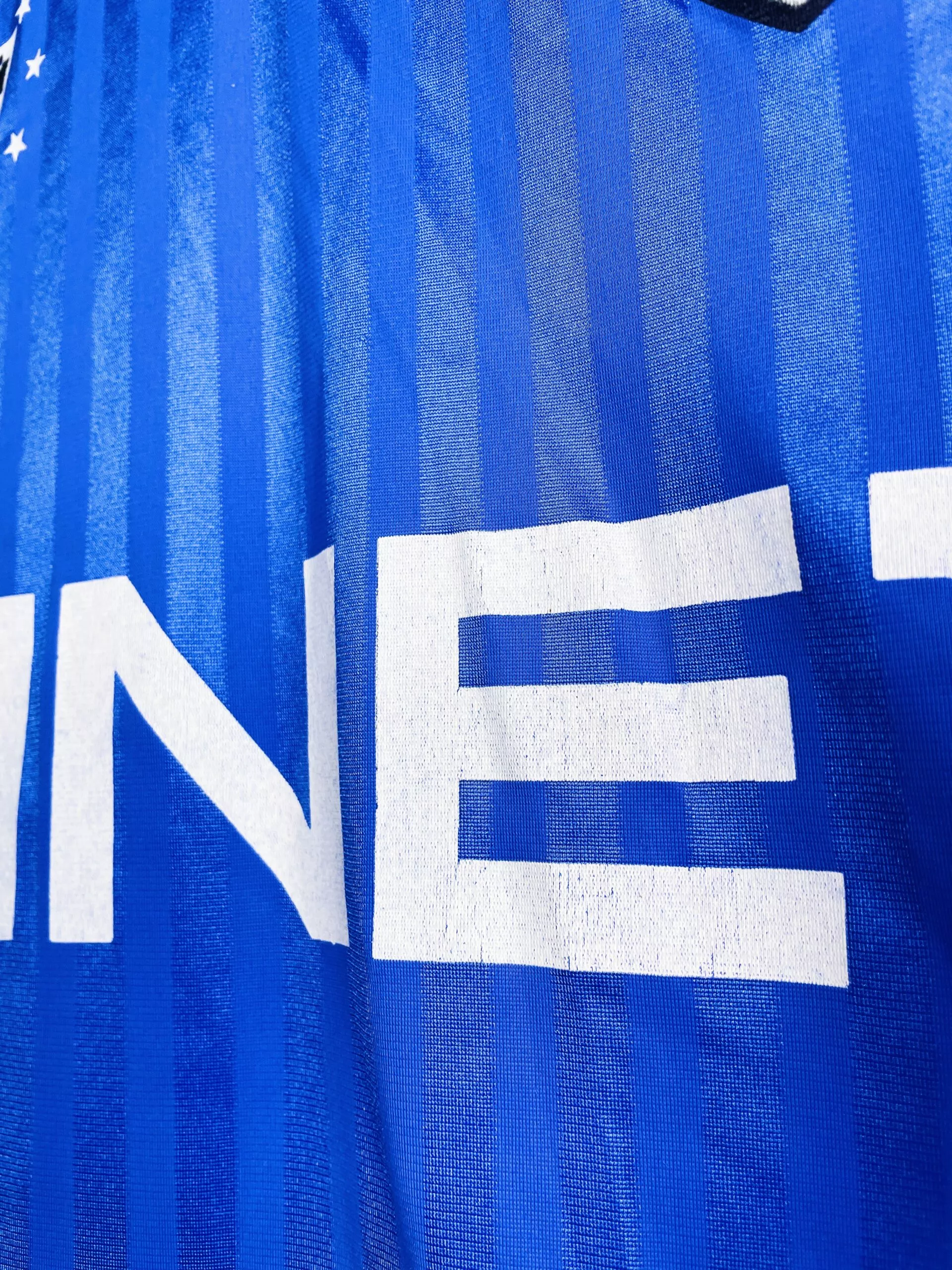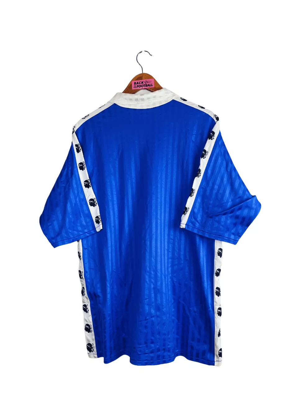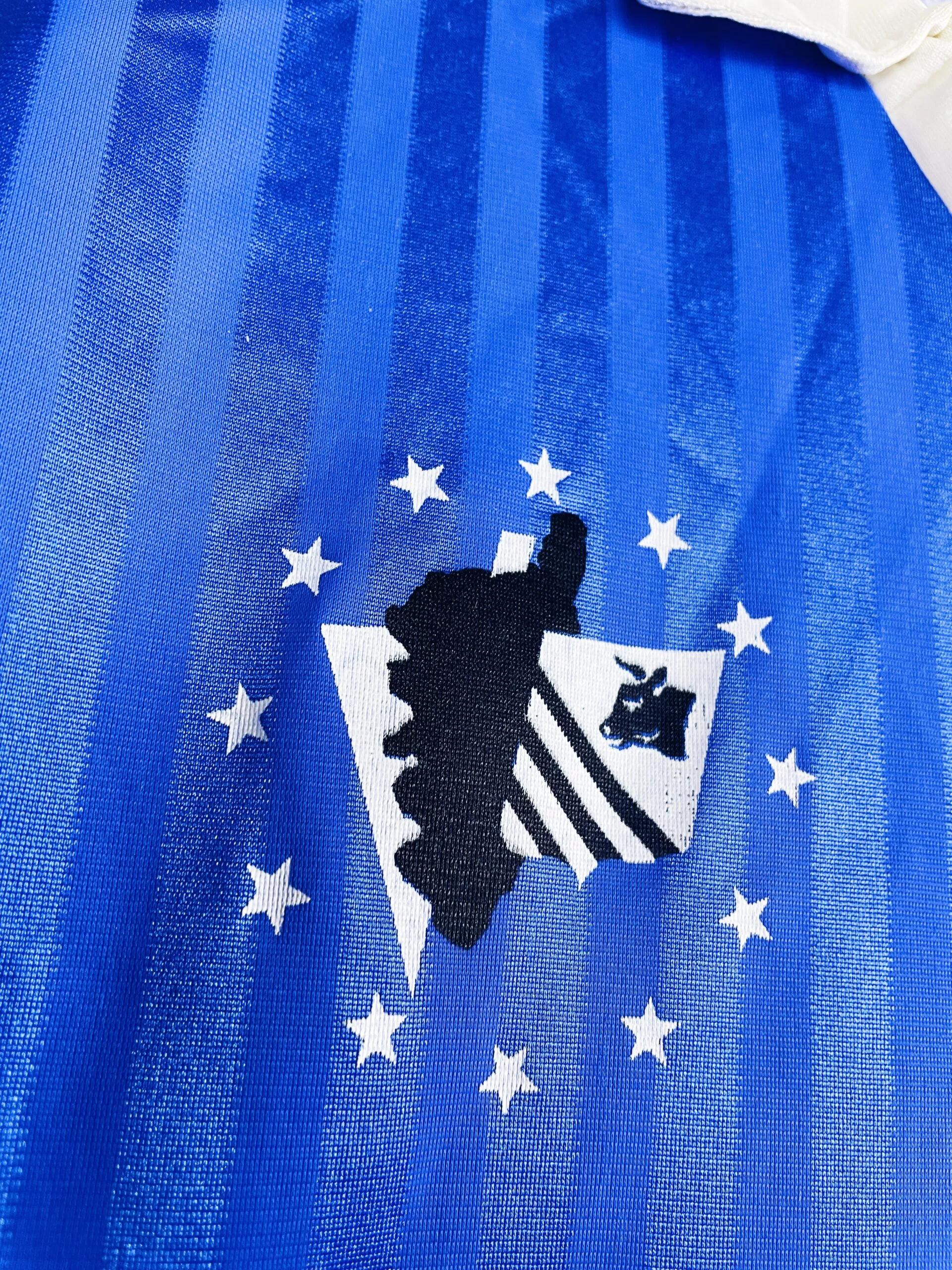 Taille : L/XL Largeur : 53cm (aisselle à aisselle) Longueur : 76cm (base du col au bas) Si tu veux plus de détails, tu peux nous contacter par mail ou sur les réseaux 😉 Etat : 8/10, très bon état, le flocage Onet a légèrement vieilli. Le maillot : maillot vintage domicile du SC Bastia 1992/1993. L’écusson, l’équipementier Corfatex, le logo Onet sont floqués. Les manches sont splendides. Potentiellement un stock pro (player issue), mais pas sûr, si t’as des infos on est preneur ! Très beau maillot rétro du SC Bastia ! Histoire : quelques mois seulement après le…