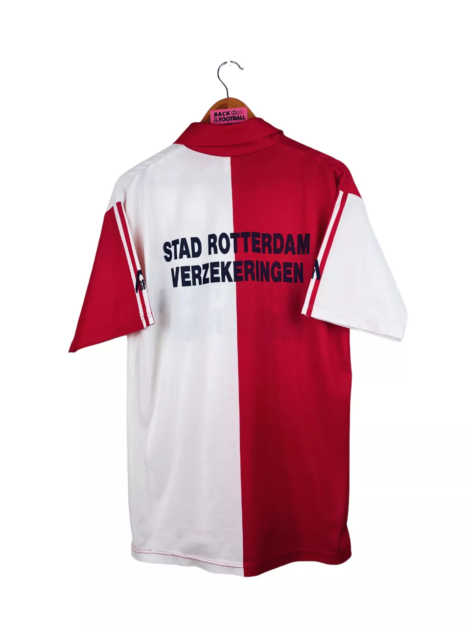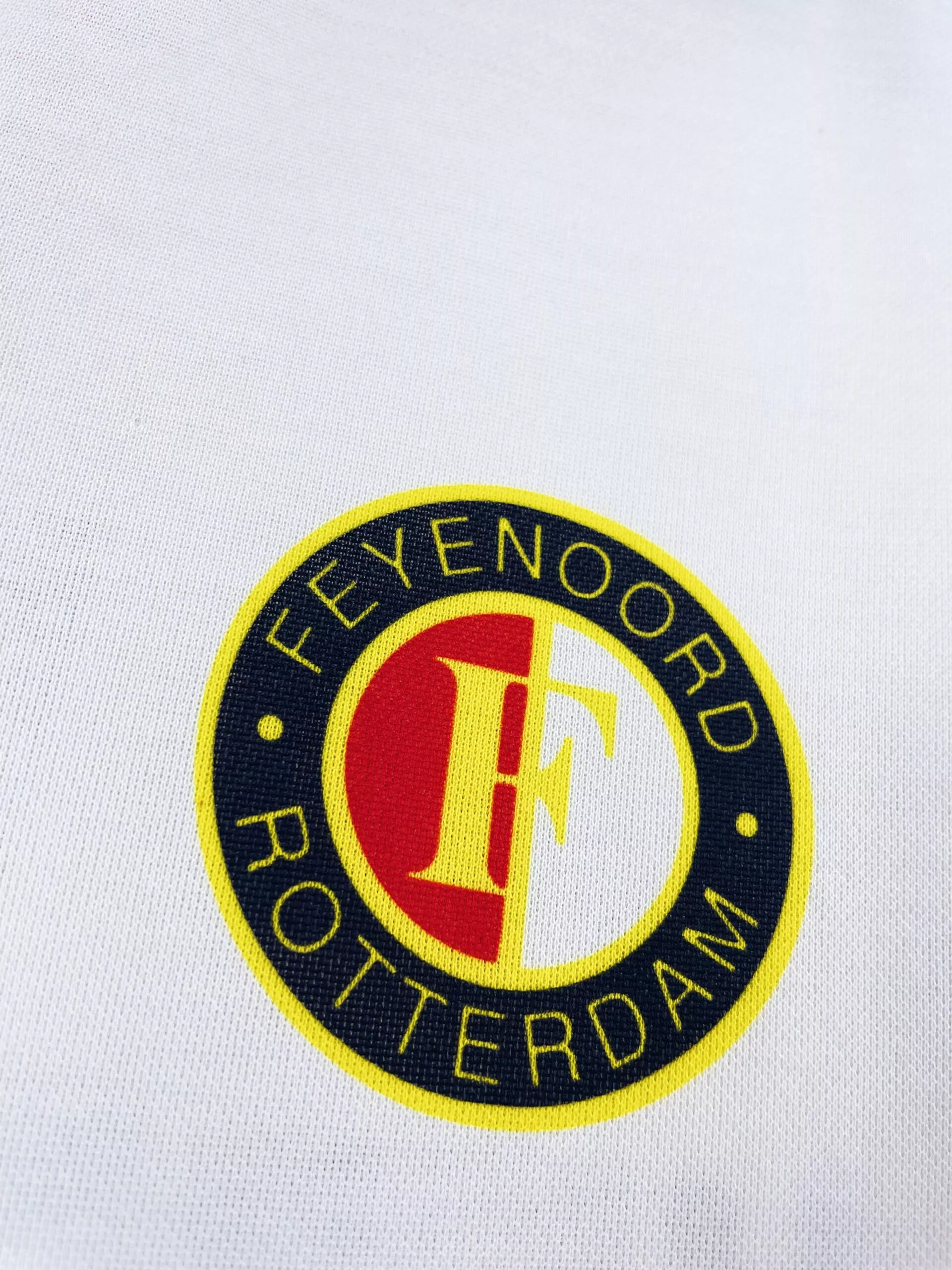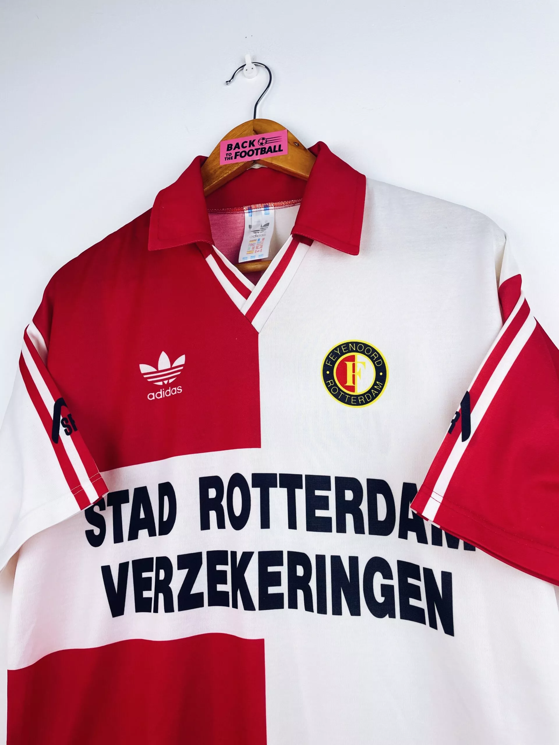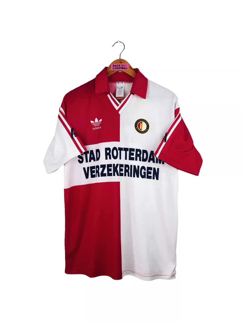Taille : L Si tu veux plus de détails, tu peux nous contacter par mail ou sur les réseaux 😉 Etat : 8/10, très bon état, quelques micros points (voir photo) Le maillot : maillot vintage domicile de Feyenoord 1992/1994. L’écusson, le logo Adidas à trèfle et le sponsor sont incrustés. Très beau maillot rétro de Feyenoord ! Histoire : la première saison, le club de Rotterdam remporte le championnat des Pays-Bas devant le PSV et l’Ajax. La saison suivante, les joueurs n’arriveront pas à garder leur titre avec une 2ème place derrière l’Ajax mais remporteront la coupe des Pays-Bas.…