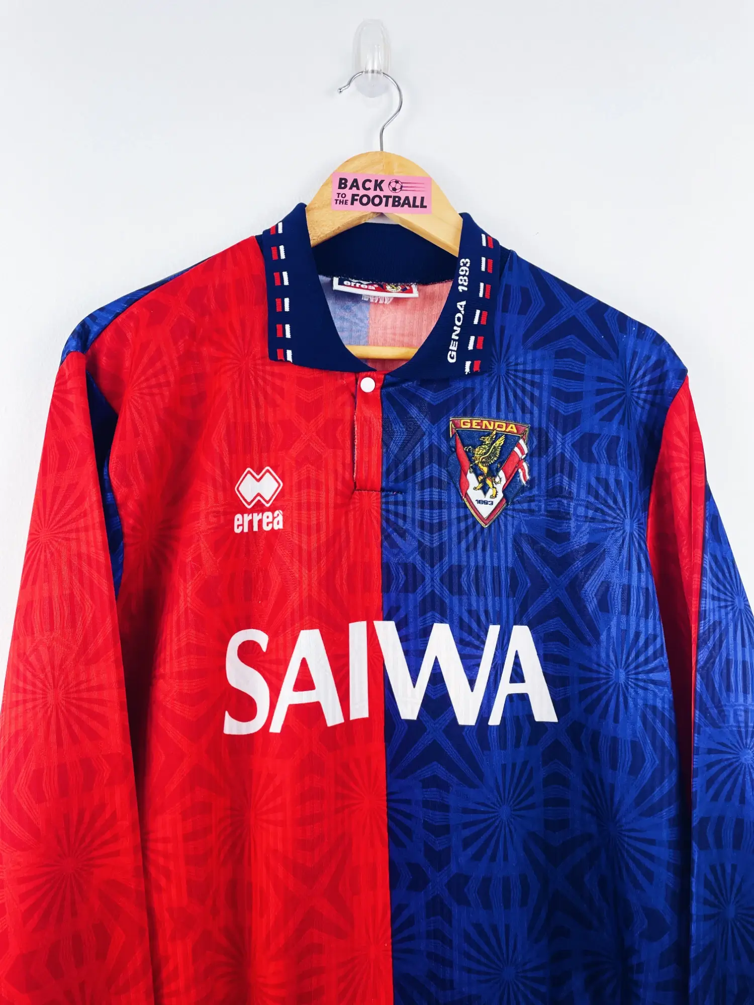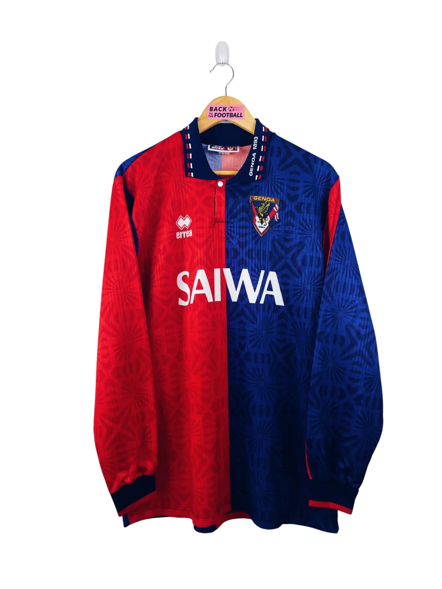 Taille : XL Largeur : 56cm (aisselle à aisselle) Longueur : 76cm (base du col au bas) Si tu veux plus de détails, tu peux nous contacter par mail ou sur les réseaux 😉 Etat : 9/10 excellent état Le maillot : maillot vintage domicile du Genoa 1992/1994 en manches longues floqué du numéro 11. L’écusson est en feutrine, le logo Errea et le sponsor Saiwa sont incrustés, le numéro 11 floqué. Très beau maillot rétro du Genoa ! Histoire : 2 saisons moyennes pour le Genoa qui reste dans le ventre mou de la Serie A. Skuhravy sera le…