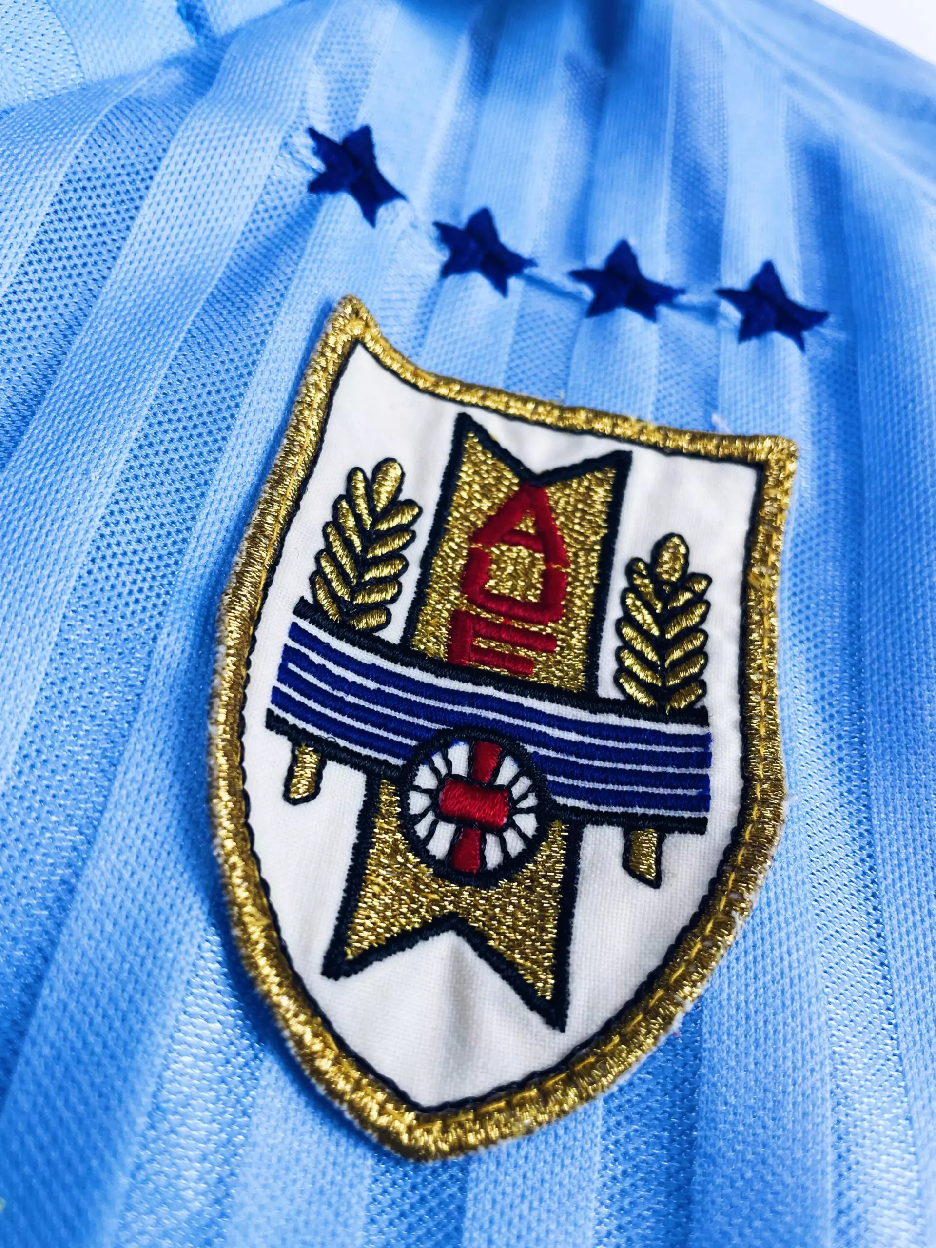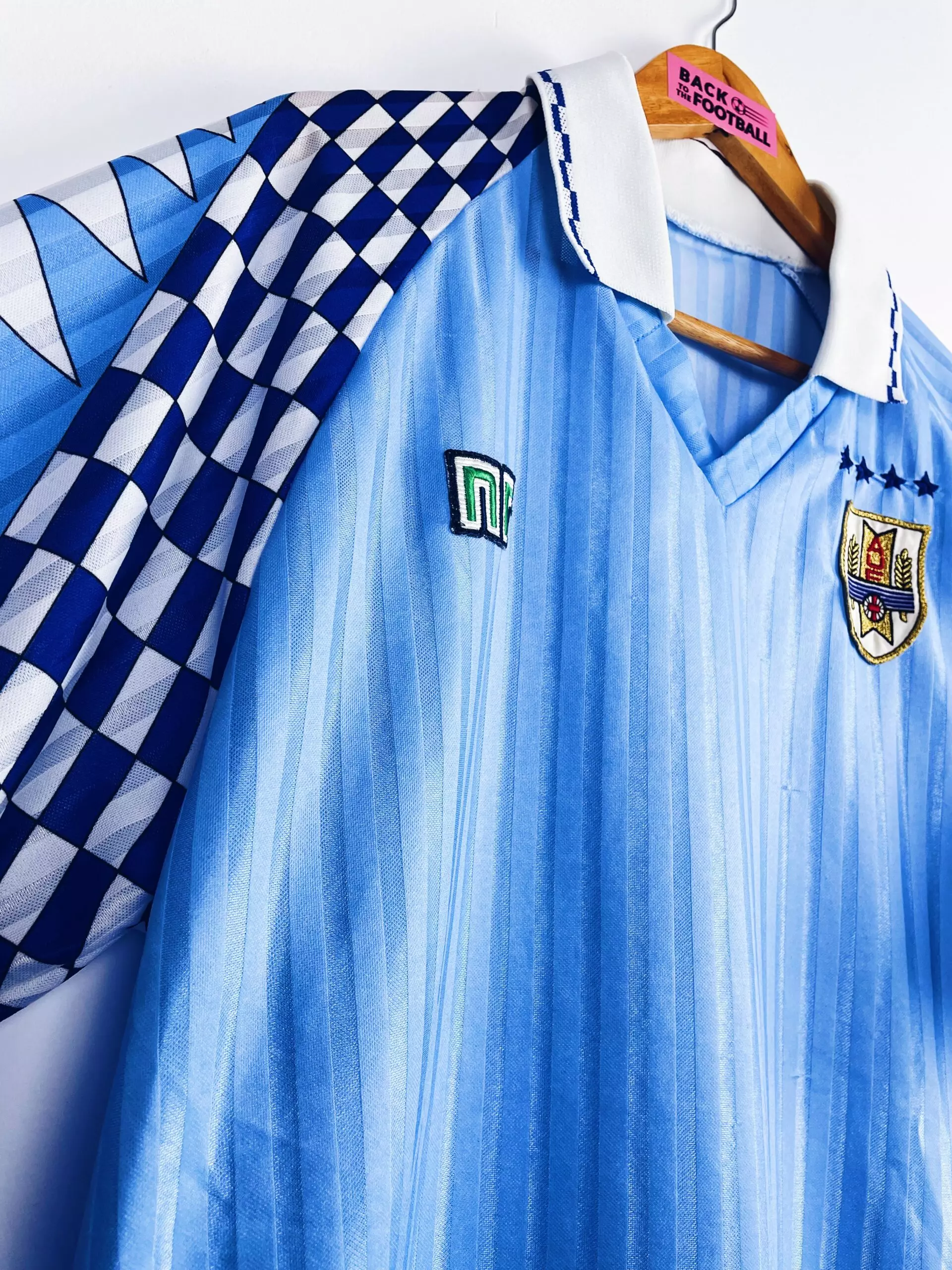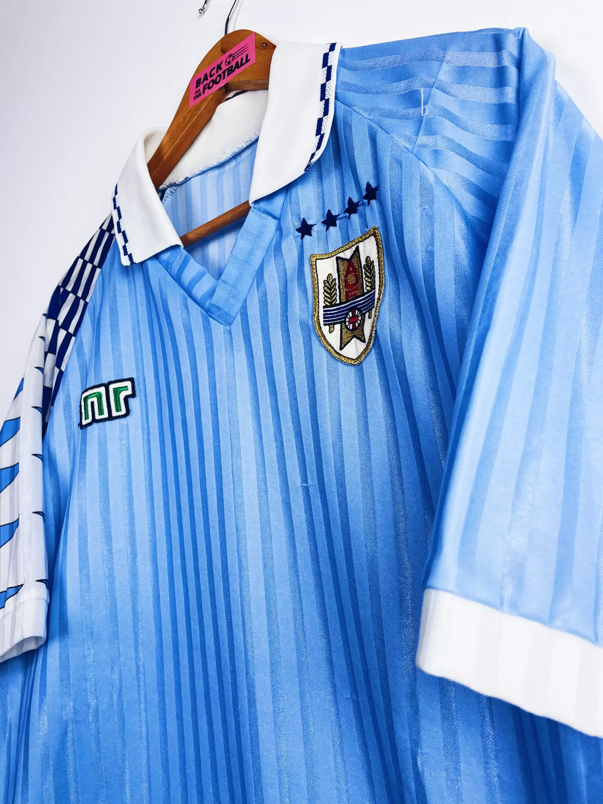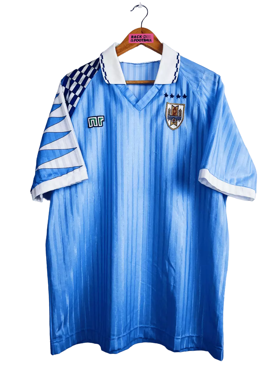Taille : L Etat : 8/10, très bon état, quelques petits accrocs (voir photo) Le maillot : maillot vintage de l’Uruguay 1992/1994, porté notamment pendant la Copa America 1993. L’écusson est brodé, le logo NR aussi. Le design est magnifique ! Très beau maillot rétro de l’Uruguay ! Histoire : lors de la Copa America 1993 organisé par l’Equateur, l’Uruguay se qualifie lors de la phase de groupe avec une 2ème place, derrière justement le pays hôte. La Celeste se fera éliminer en quart de finale, aux tirs au buts, contre la Colombie. Les uruguayens ne se qualifieront pas pour…