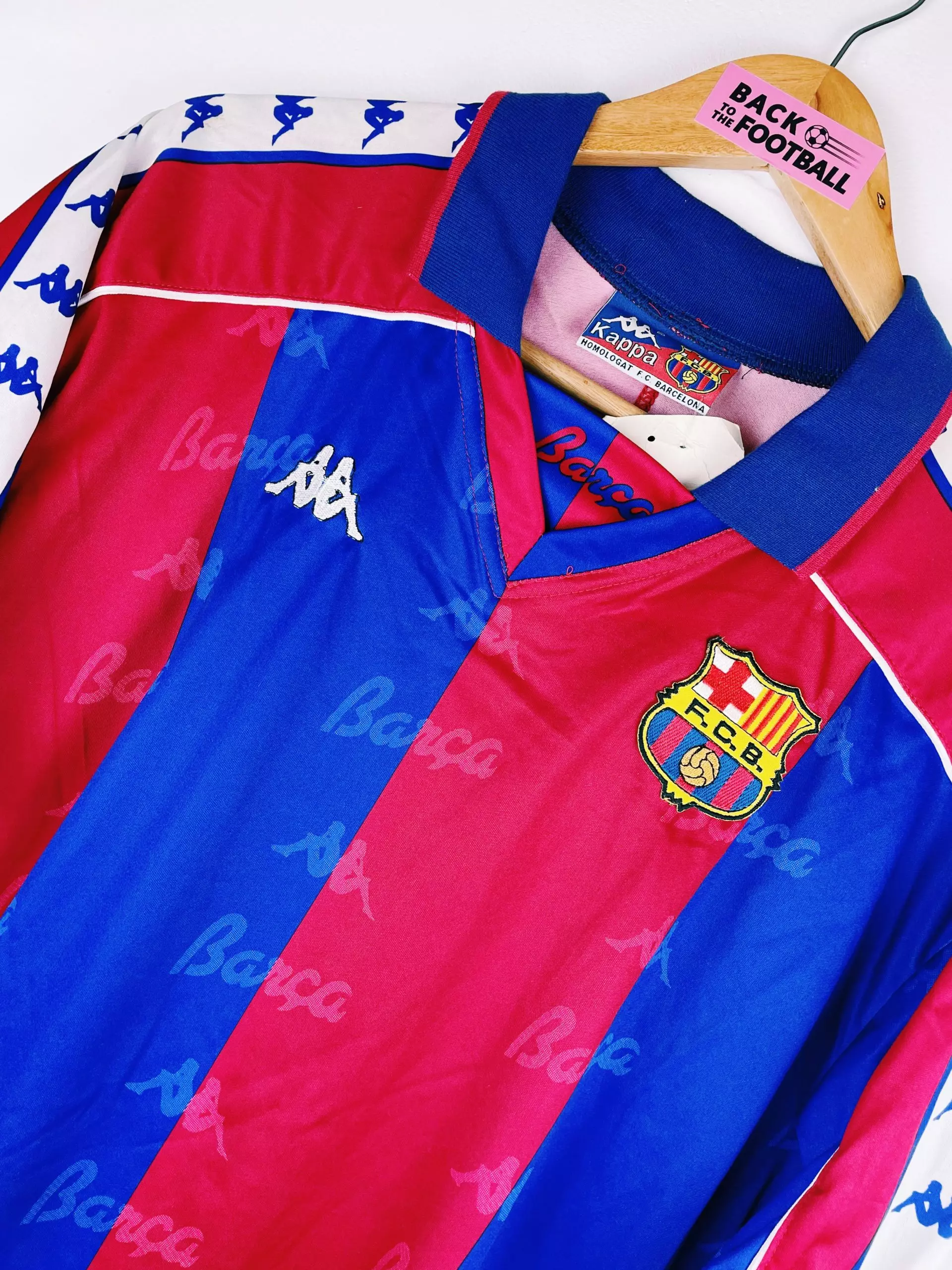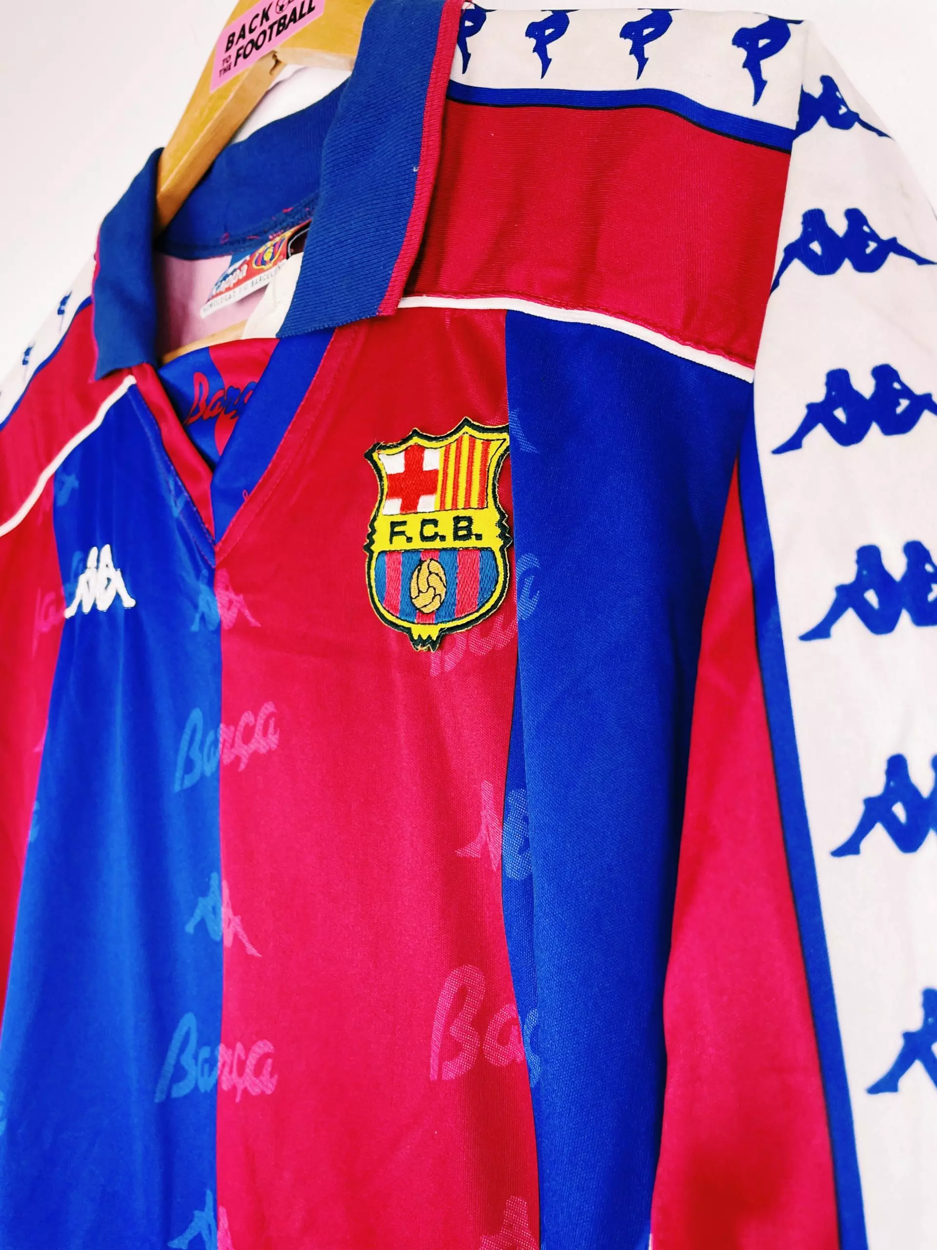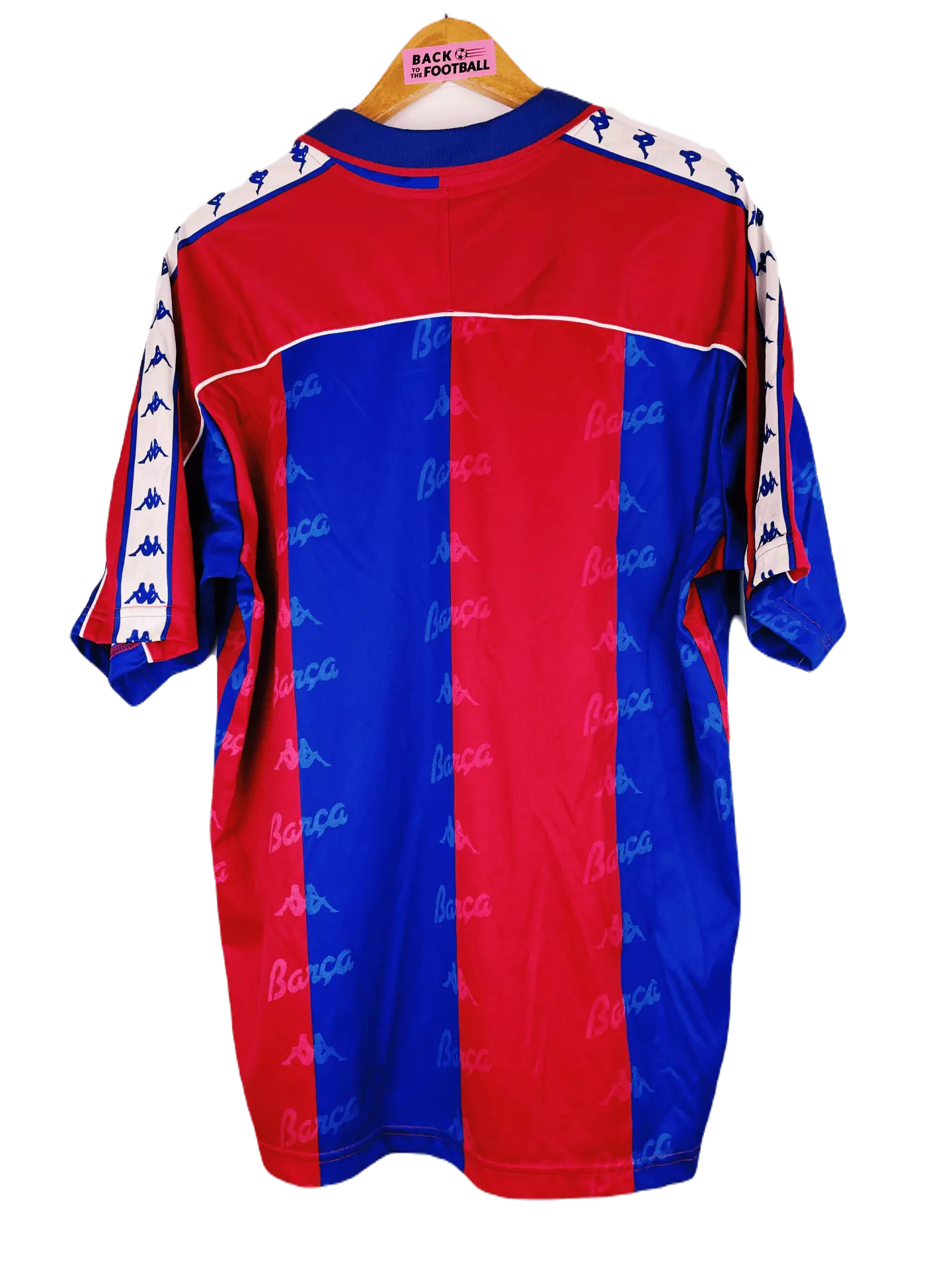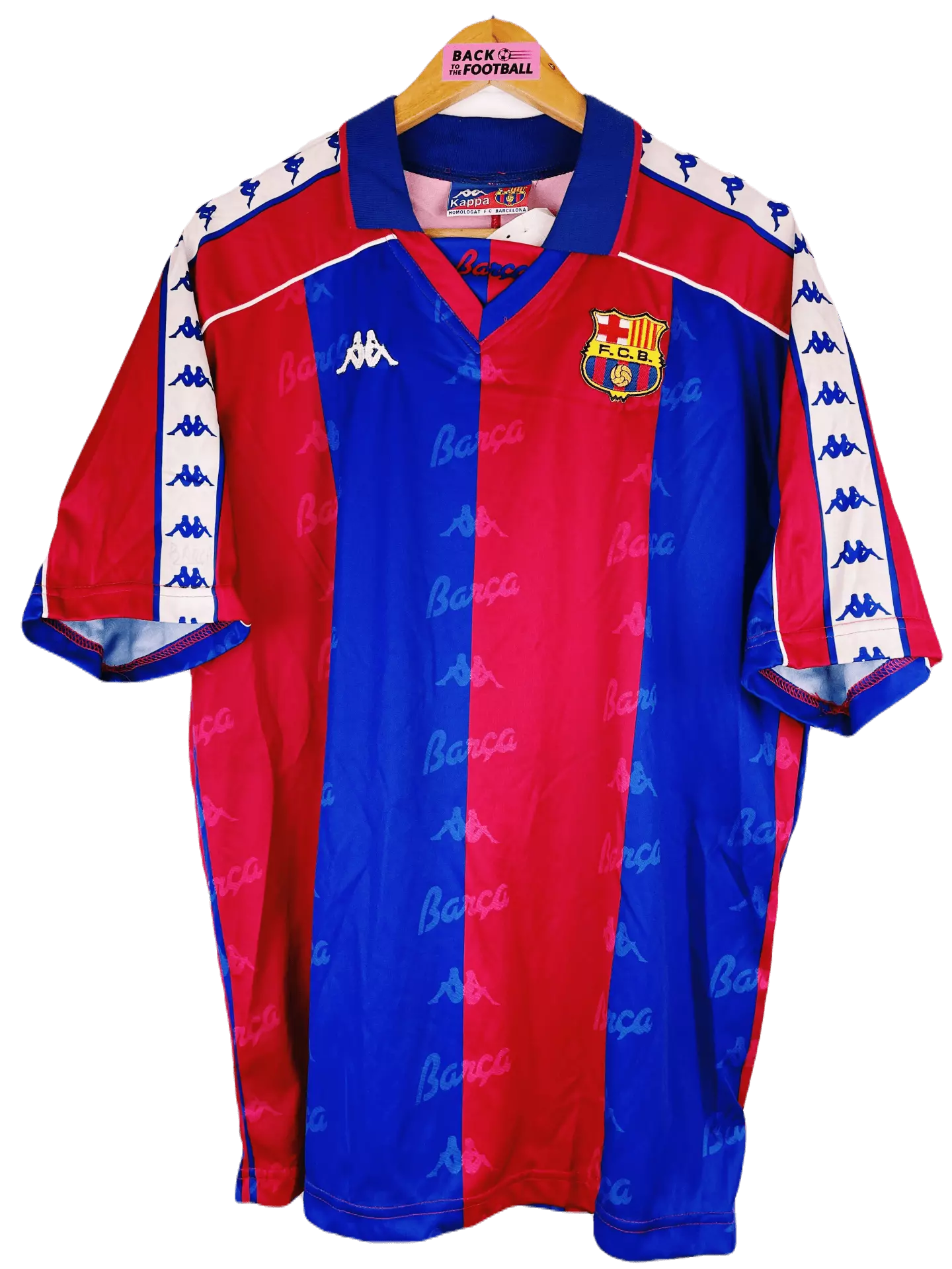 Taille : L Etat : neuf avec l’étiquette d’époque. Il y a la mention « Barça » marquée sur la manche. Le maillot : magnifique maillot vintage du FC Barcelone saisons 1992/1995. L’écusson est brodé comme le logo Kappa. La mention « Barca » et le logo Kappa sont en tramé sur tout le maillot. Histoire : très gros Barca, coaché par la légende Johan Cruyff, qui gagnera sur ces 3 saisons : 2 Liga, 2 Supercoupe d’Espagne, 1 Super Coupe UEFA et ils feront une finale de Ligue des Champions. Quelques joueurs : Romario, Guardiola, Carles Busquets (le père de Sergio), Koeman, Eusebio,…