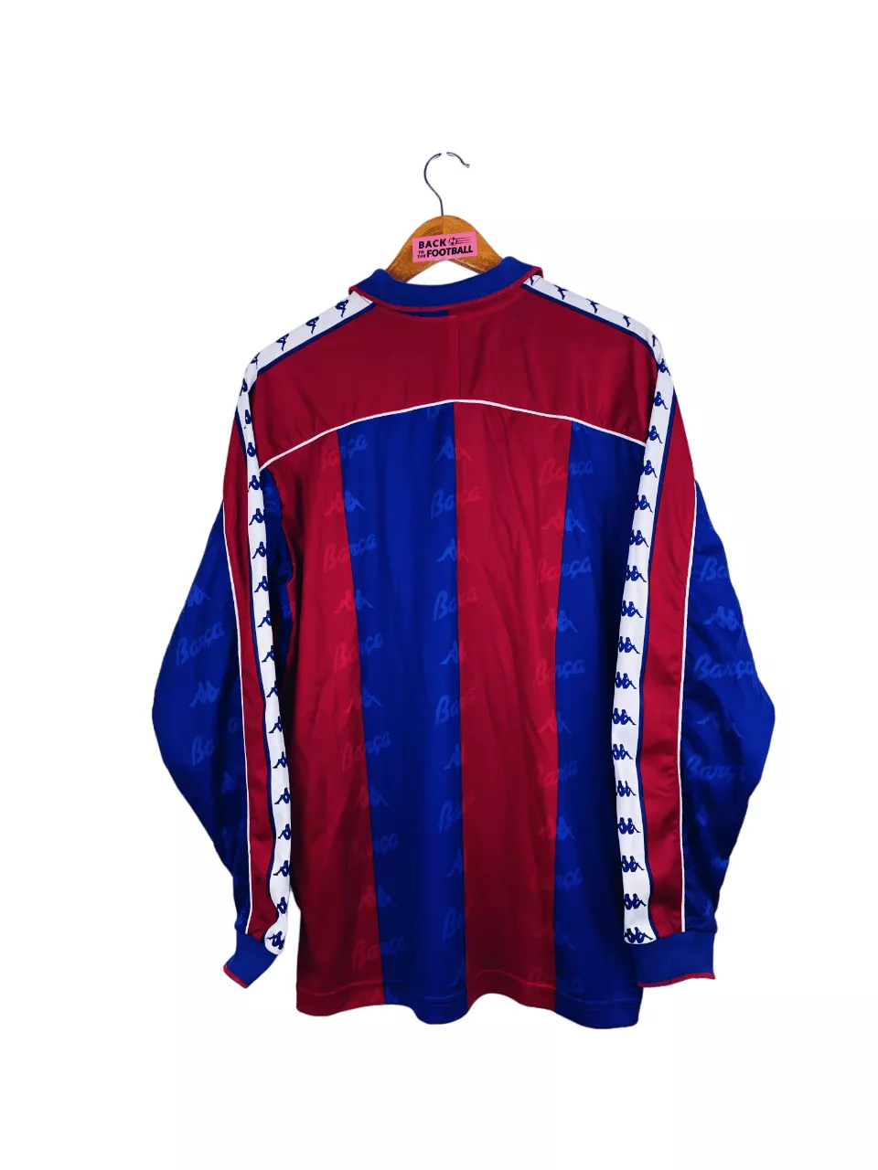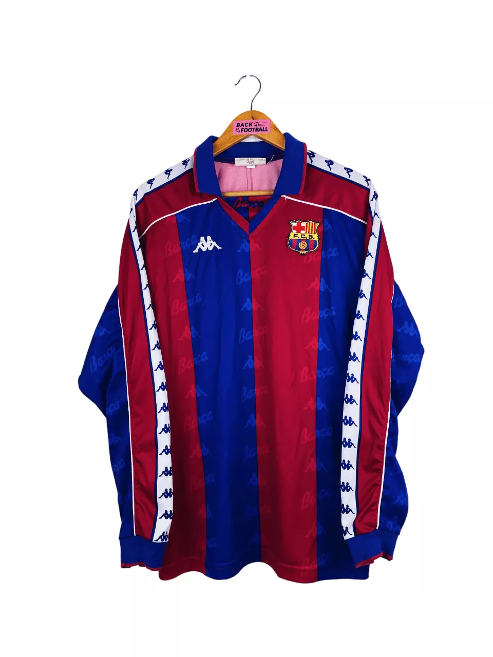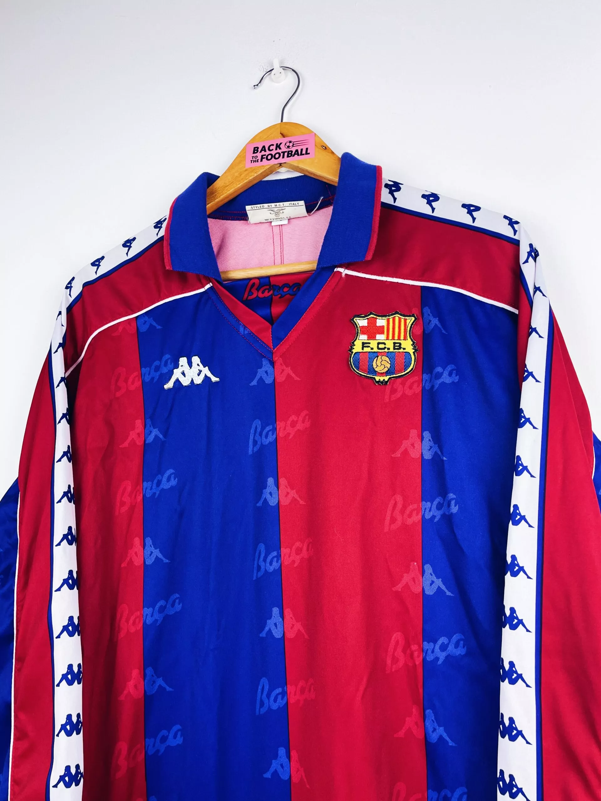 Taille : L Si tu veux plus de détails, tu peux nous contacter par mail ou sur les réseaux 😉 Etat : 8/10, très bon état. Le Kappa est légèrement jauni (voir photo) Le maillot : maillot vintage domicile du FC Barcelone 1992/1995 en manches longues. L’écusson est brodé comme le logo Kappa. La mention « Barca » et le logo Kappa sont en tramé sur tout le maillot. Très beau maillot rétro de Barcelone ! Histoire : très gros Barca, coaché par la légende Johan Cruyff, qui gagnera sur ces 3 saisons : 2 Liga, 2 Supercoupe d’Espagne, 1 Super Coupe…