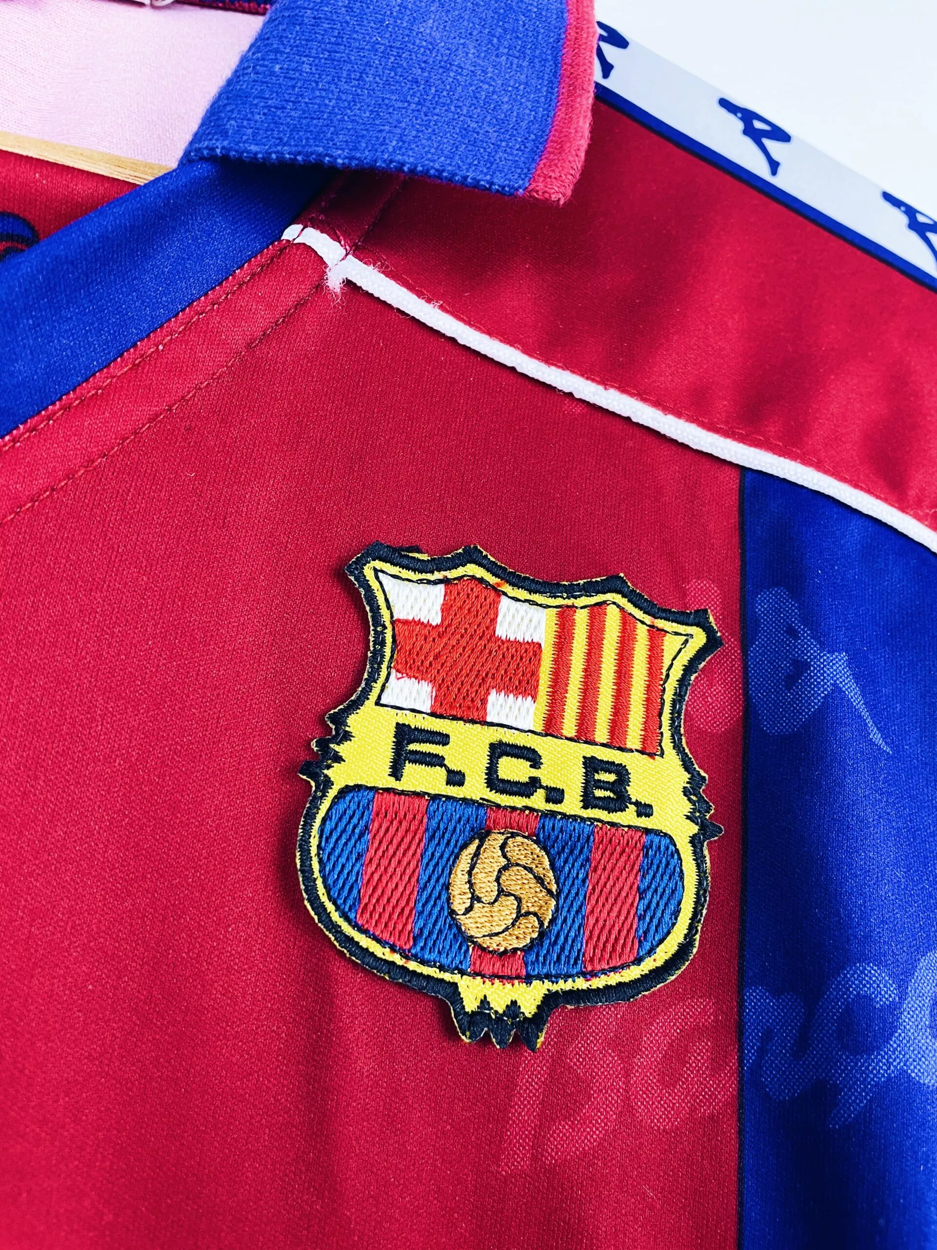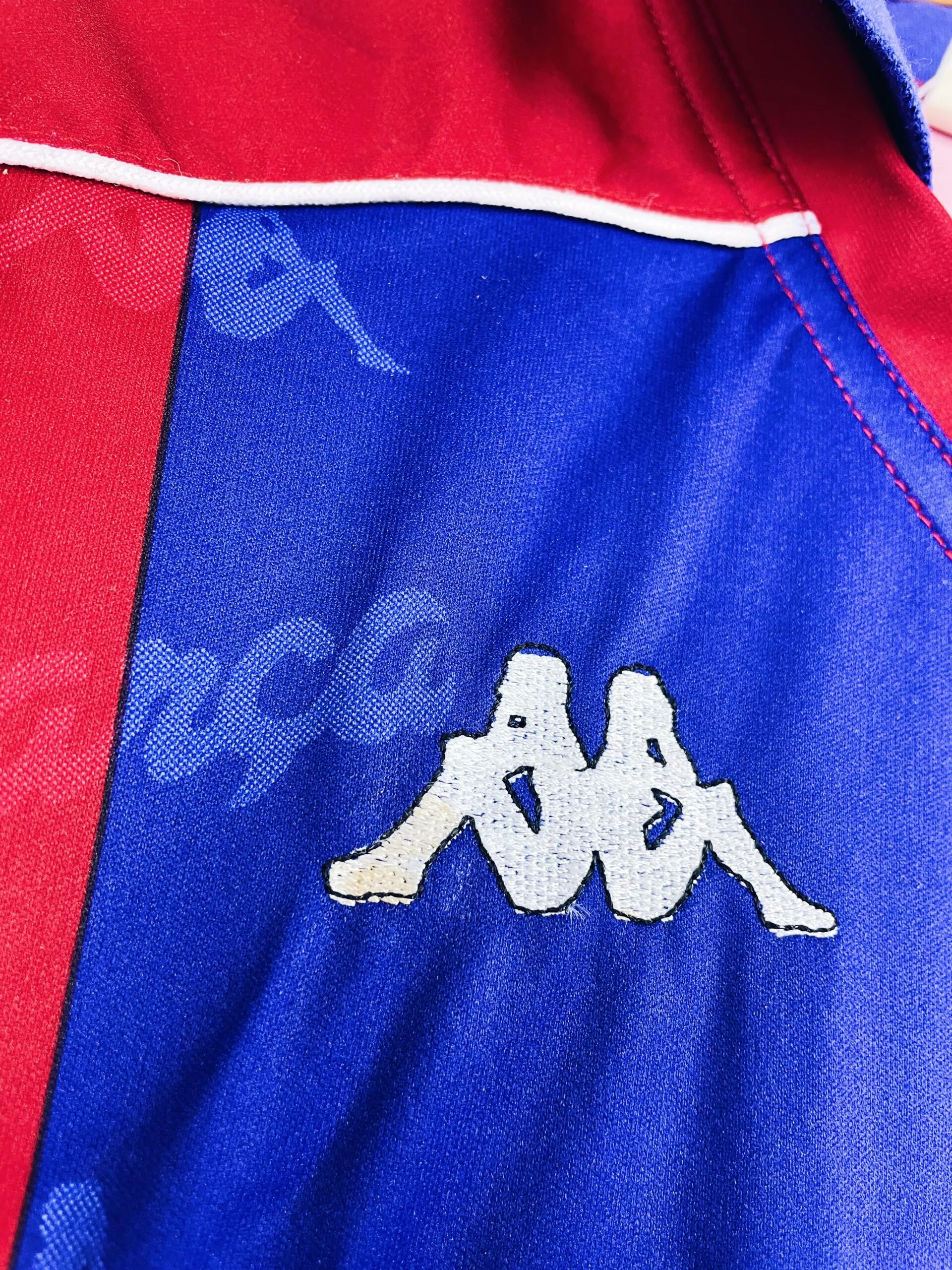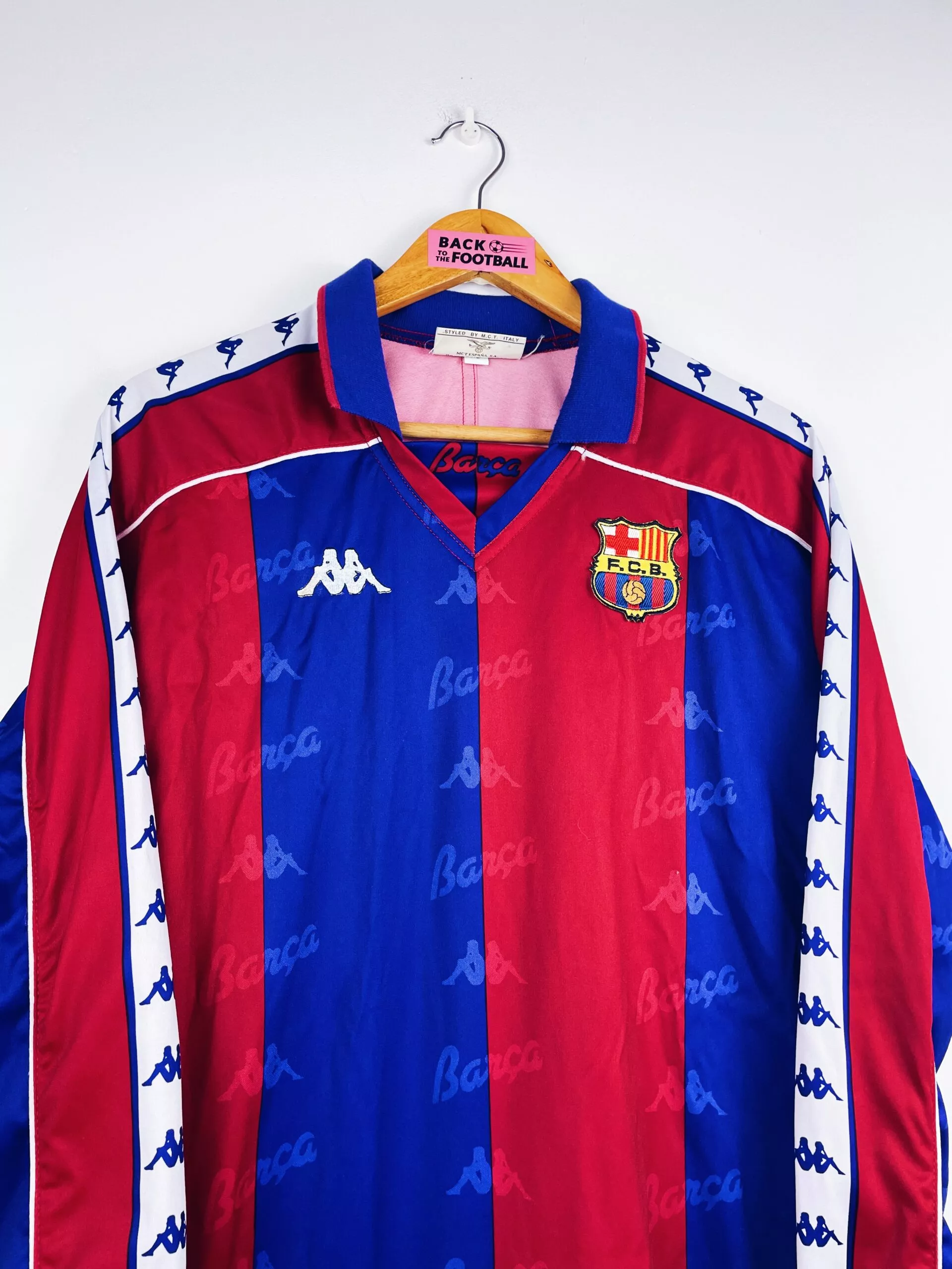 Taille : L Si tu veux plus de détails, tu peux nous contacter par mail ou sur les réseaux 😉 Etat : 8/10, très bon état. Le Kappa est légèrement jauni (voir photo) Le maillot : maillot vintage domicile du FC Barcelone 1992/1995 en manches longues. L’écusson est brodé comme le logo Kappa. La mention « Barca » et le logo Kappa sont en tramé sur tout le maillot. Très beau maillot rétro de Barcelone ! Histoire : très gros Barca, coaché par la légende Johan Cruyff, qui gagnera sur ces 3 saisons : 2 Liga, 2 Supercoupe d’Espagne, 1 Super Coupe…