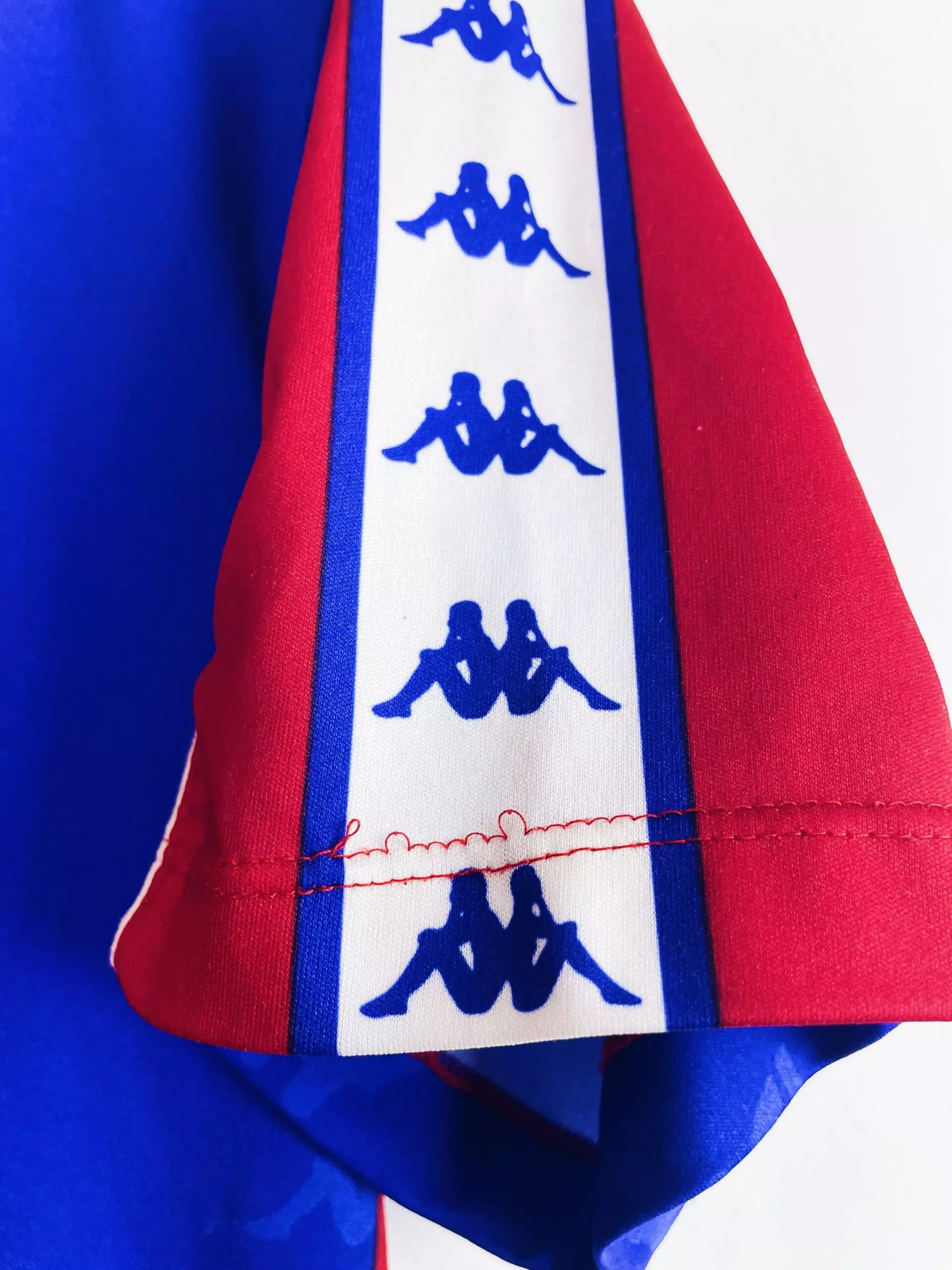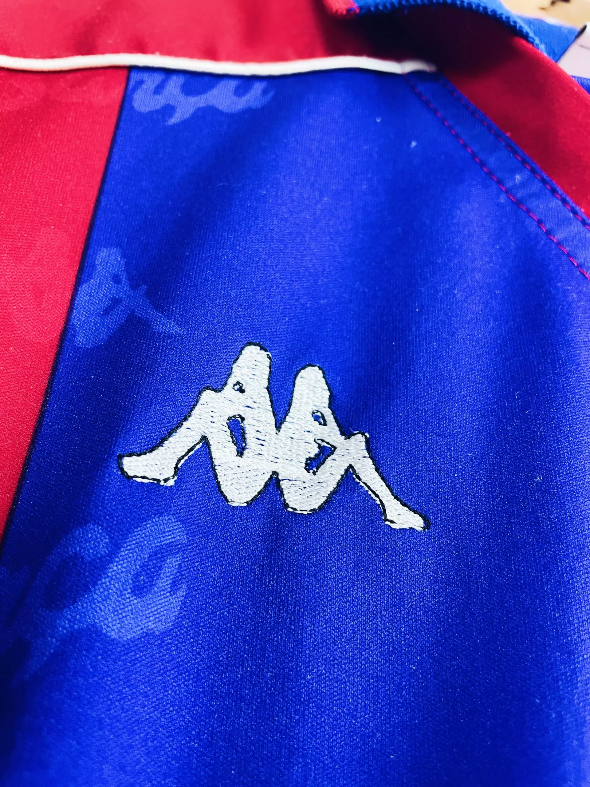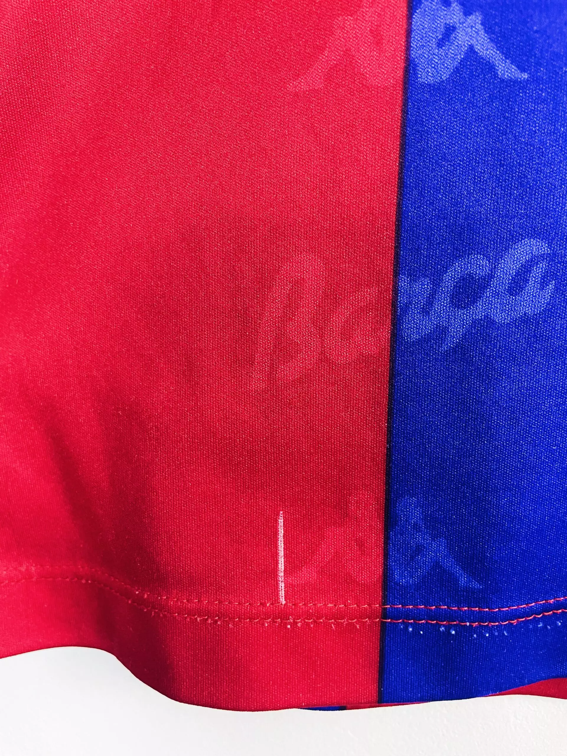 Taille : M Etat : 7.5/10, très bon état mais un accro en bas du maillot, un fil tiré sur la manche et une très légère trace quasi invisible (voir photos) Le maillot : maillot vintage domicile du FC Barcelone 1992/1995. L’écusson est brodé comme le logo Kappa. La mention « Barca » et le logo Kappa sont en tramé sur tout le maillot. Très beau maillot rétro de Barcelone ! Histoire : très gros Barca, coaché par la légende Johan Cruyff, qui gagnera sur ces 3 saisons : 2 Liga, 2 Supercoupe d’Espagne, 1 Super Coupe UEFA et ils feront une…