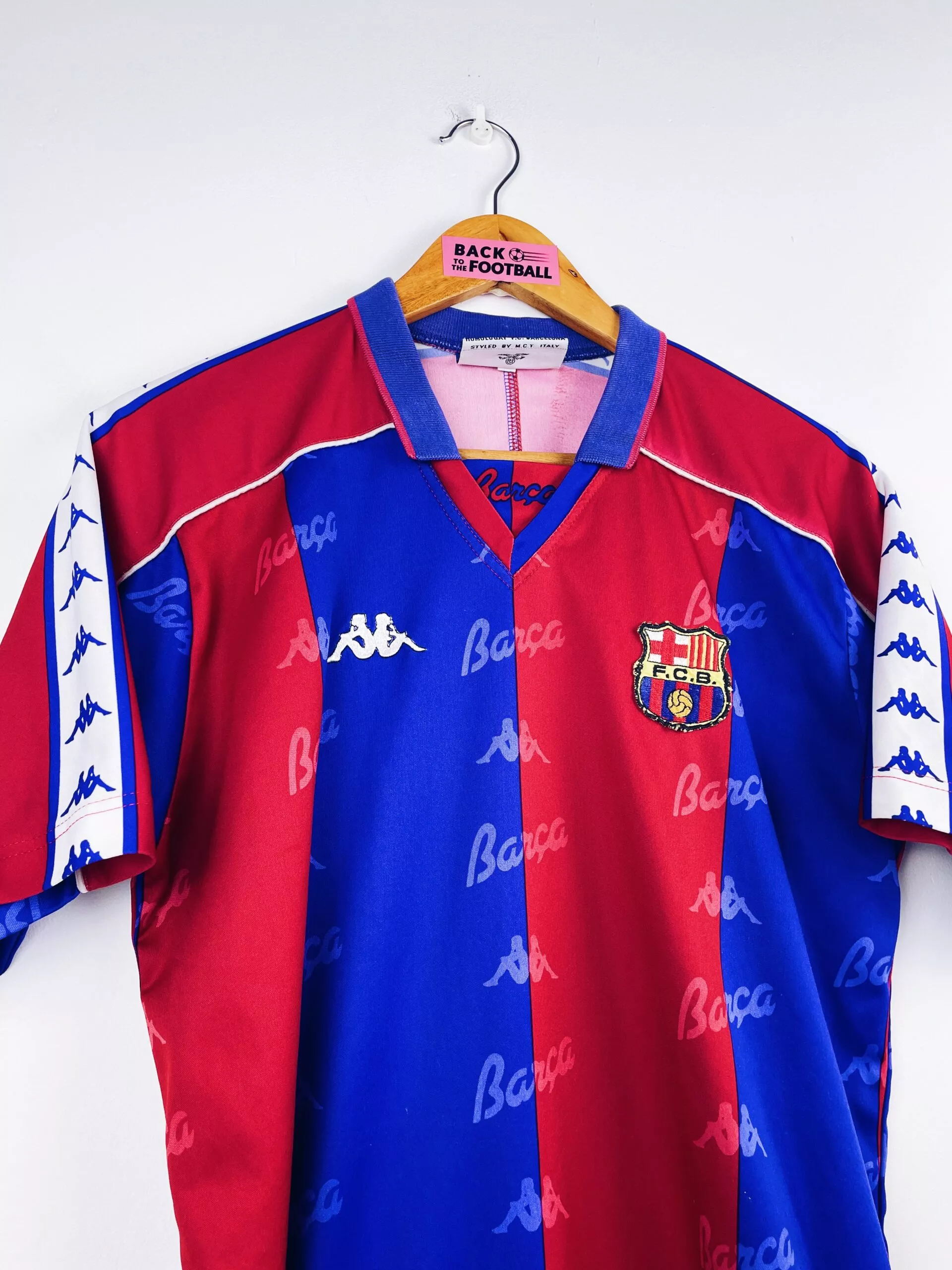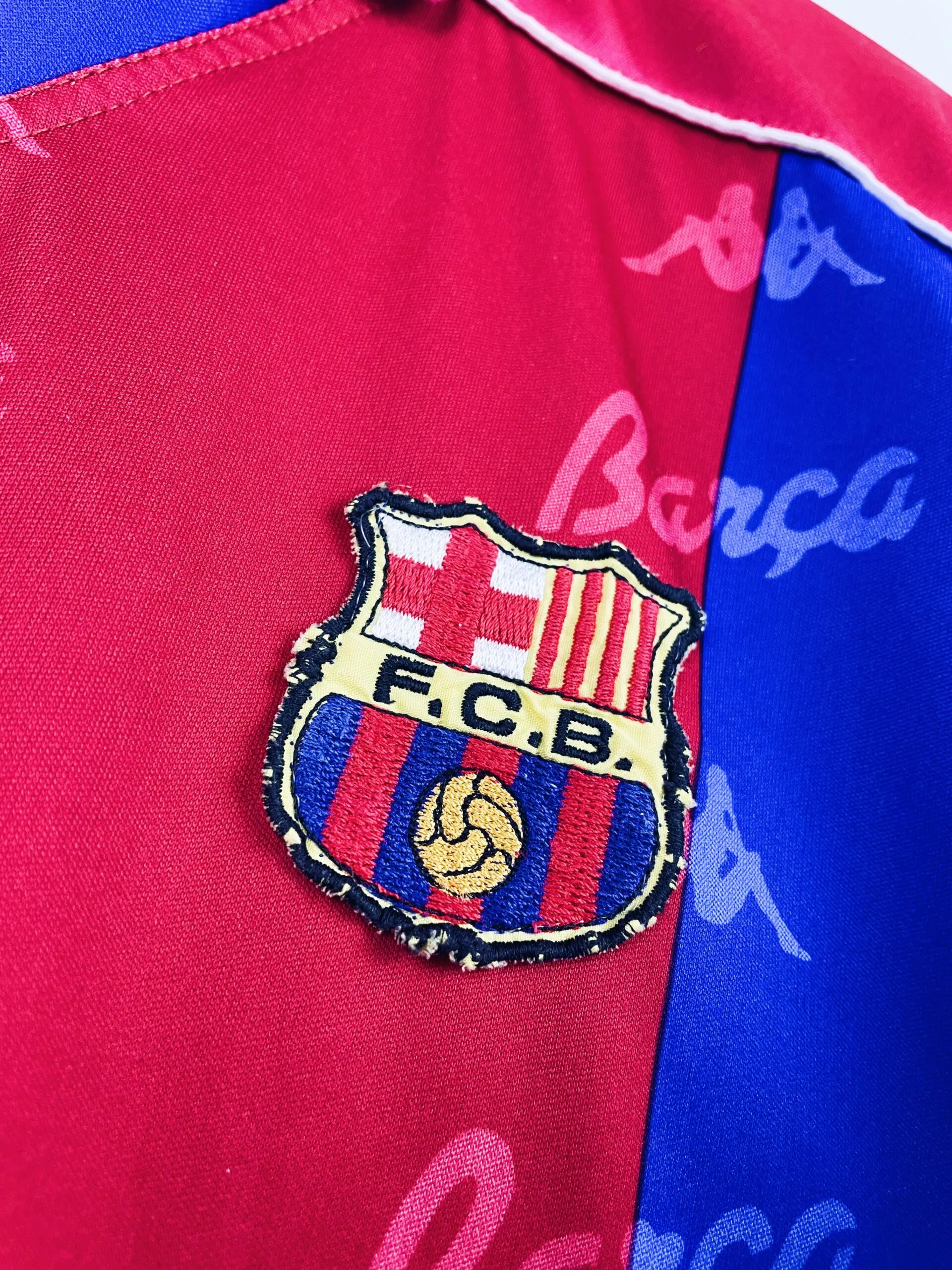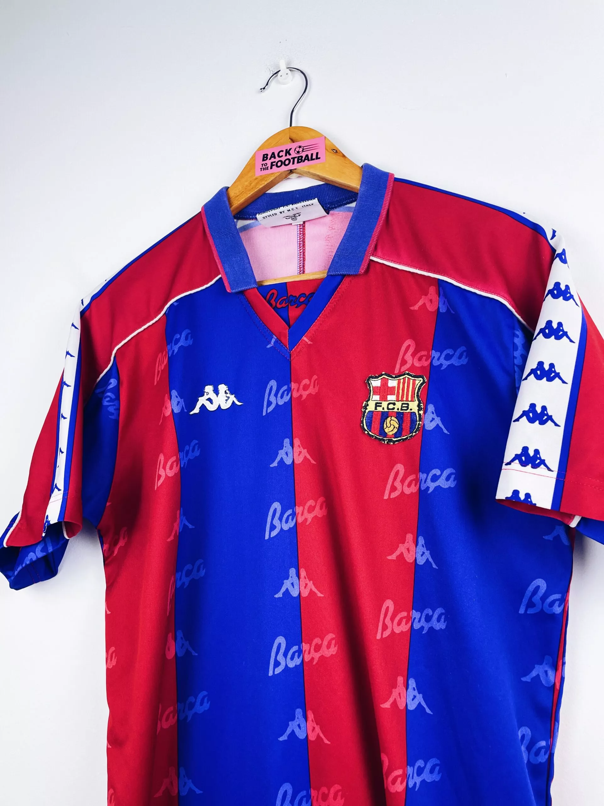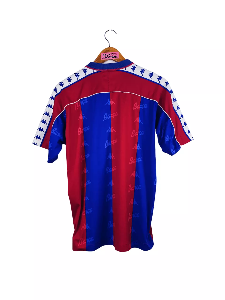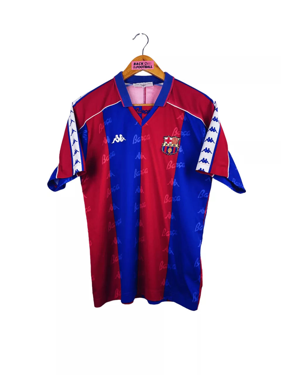 Taille : M Si tu veux plus de détails, tu peux nous contacter par mail ou sur les réseaux 😉 Etat : 8/10, très bon état. Le maillot : maillot vintage domicile du FC Barcelone 1992/1995. L’écusson est brodé comme le logo Kappa. La mention « Barca » et le logo Kappa sont en tramé sur tout le maillot. Très beau maillot rétro de Barcelone ! Histoire : très gros Barca, coaché par la légende Johan Cruyff, qui gagnera sur ces 3 saisons : 2 Liga, 2 Supercoupe d’Espagne, 1 Super Coupe UEFA et ils feront une finale de Ligue des Champions.…