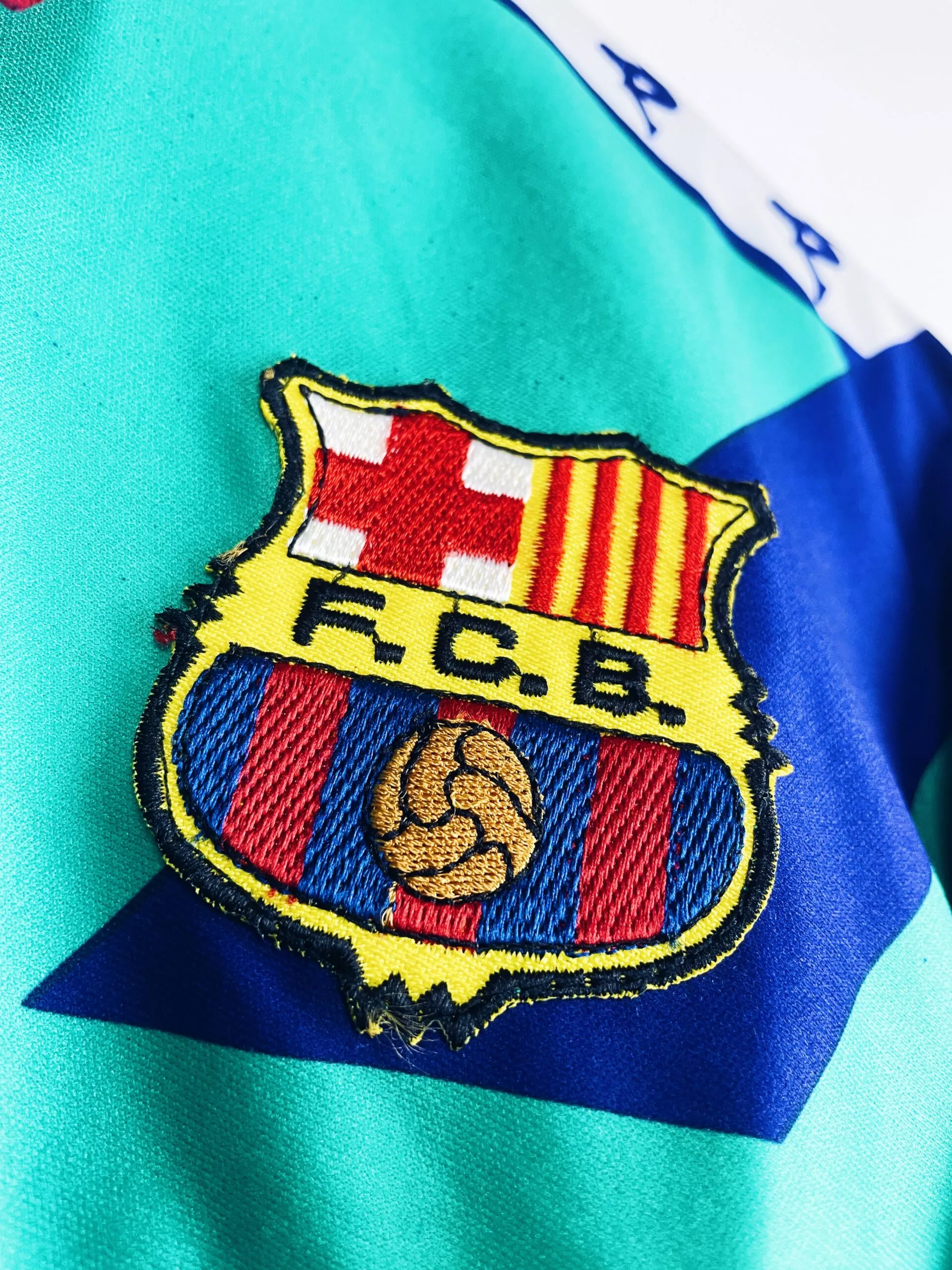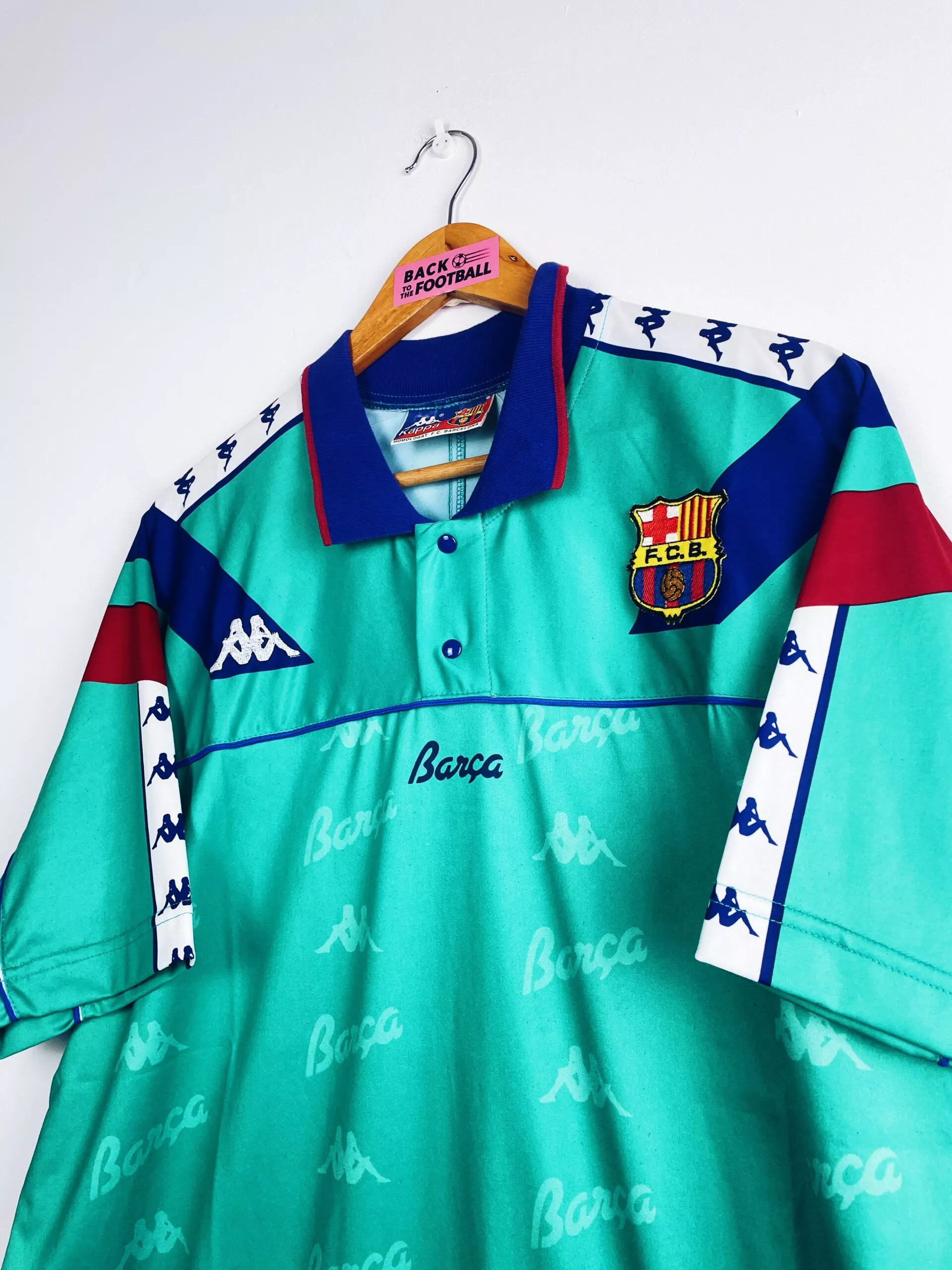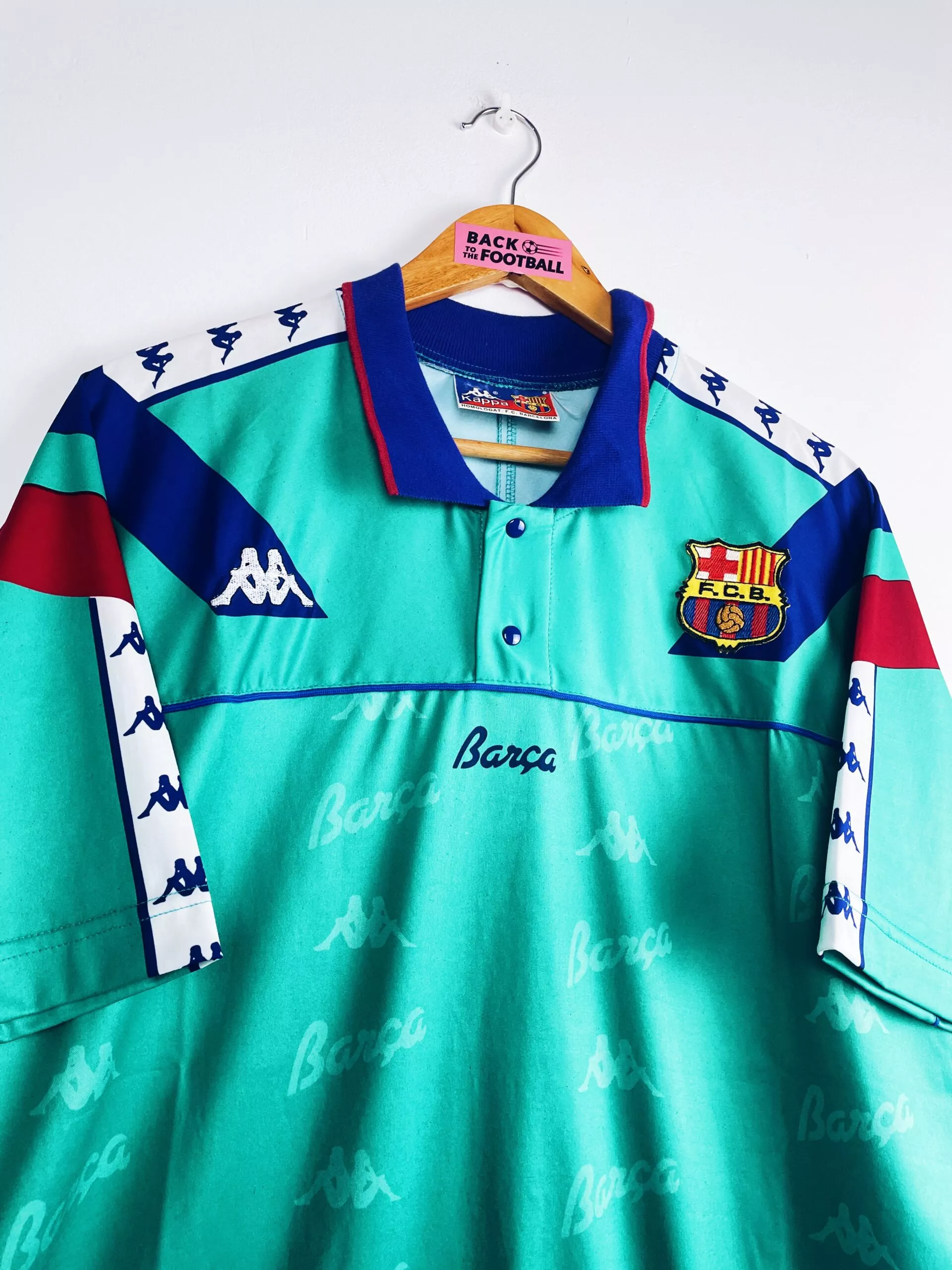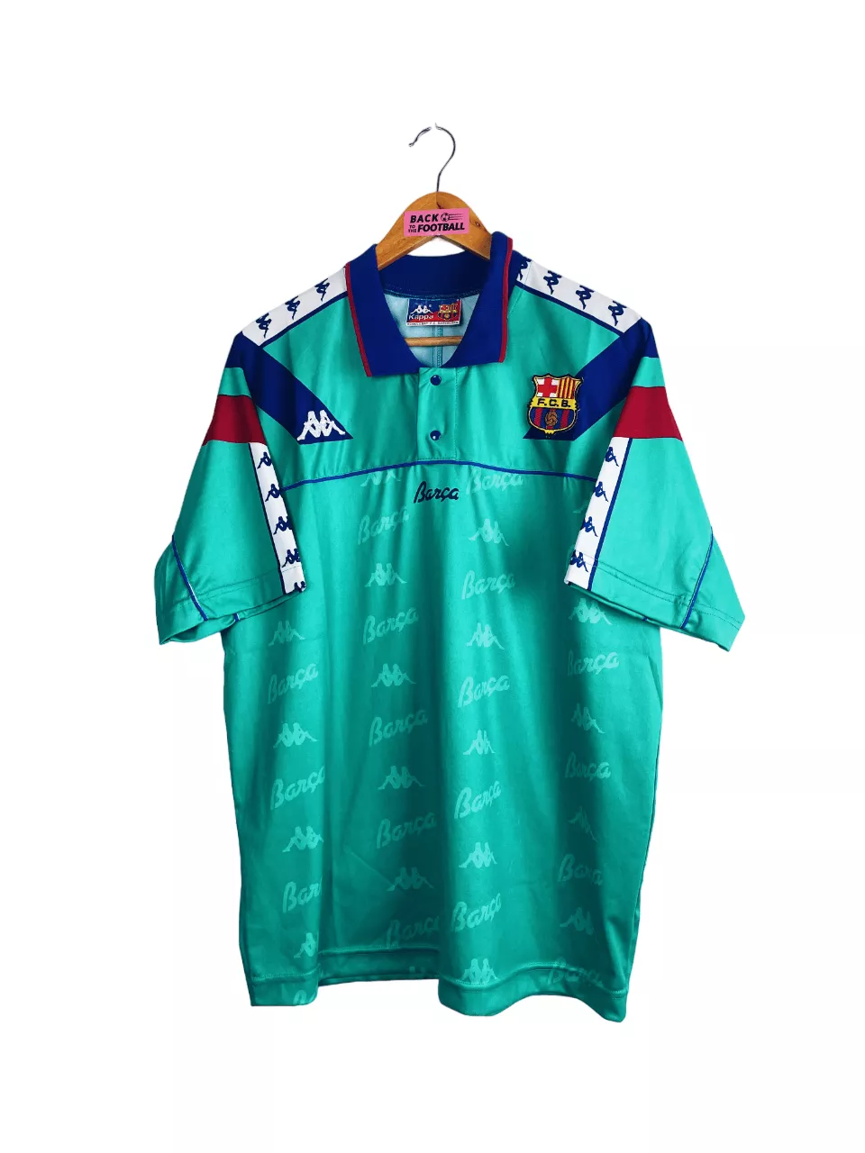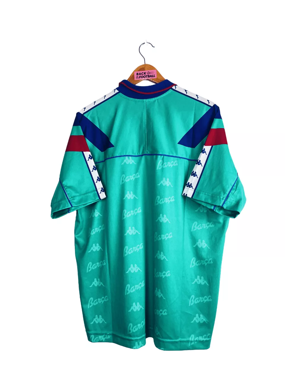 Taille : XL Si tu veux plus de détails, tu peux nous contacter par mail ou sur les réseaux 😉 Etat : 8/10, très bon état, le col est un peu plus clair qu’à l’origine Le maillot : maillot vintage extérieur du FC Barcelone 1992/1995. L’écusson est brodé comme le logo Kappa. La mention « Barca » et le logo Kappa sont en tramé sur tout le maillot. Très beau maillot rétro de Barcelone ! Histoire : très gros Barca, coaché par la légende Johan Cruyff, qui gagnera sur ces 3 saisons : 2 Liga, 2 Supercoupe d’Espagne, 1 Super Coupe UEFA…