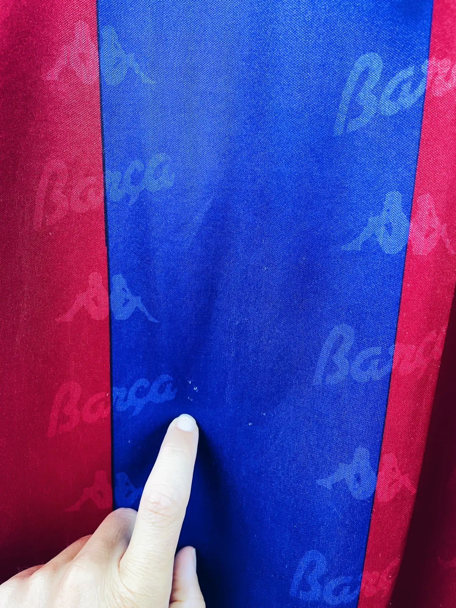 Taille : M Largeur : 54cm (aisselle à aisselle) Longueur : 70cm (base du col au bas) Si tu veux plus de détails, tu peux nous contacter par mail ou sur les réseaux 😉 Etat : 8.5/10, très bon état, quelques bouloches/peluches (voir photos) Le maillot : maillot vintage domicile du FC Barcelone 1992/1995. L’écusson et le logo Kappa sont brodés. La mention « Barca » et le logo Kappa sont en tramé sur tout le maillot. Très beau maillot rétro de Barcelone ! Histoire : très gros Barca, coaché par la légende Johan Cruyff, qui gagnera sur ces 3 saisons :…