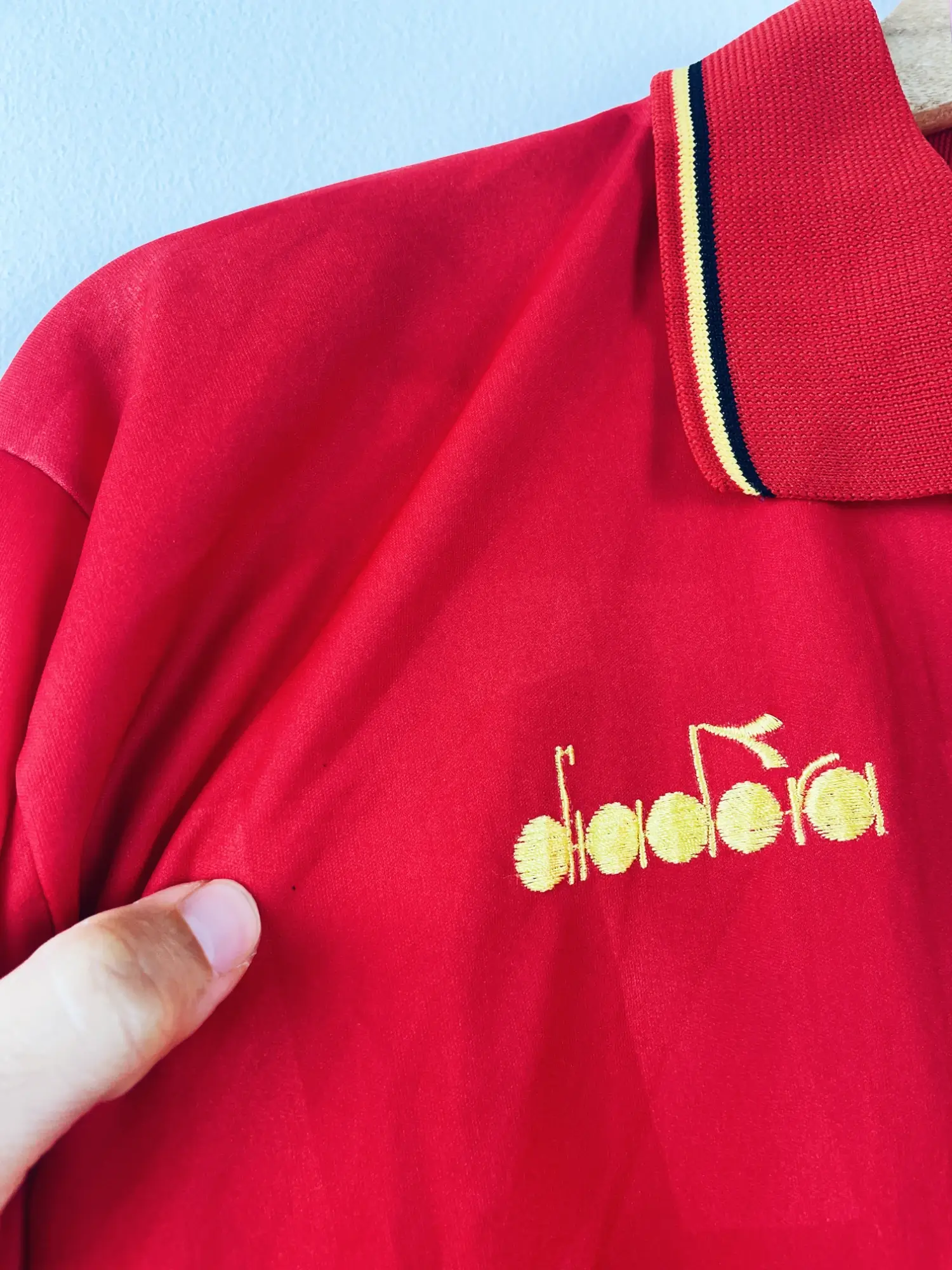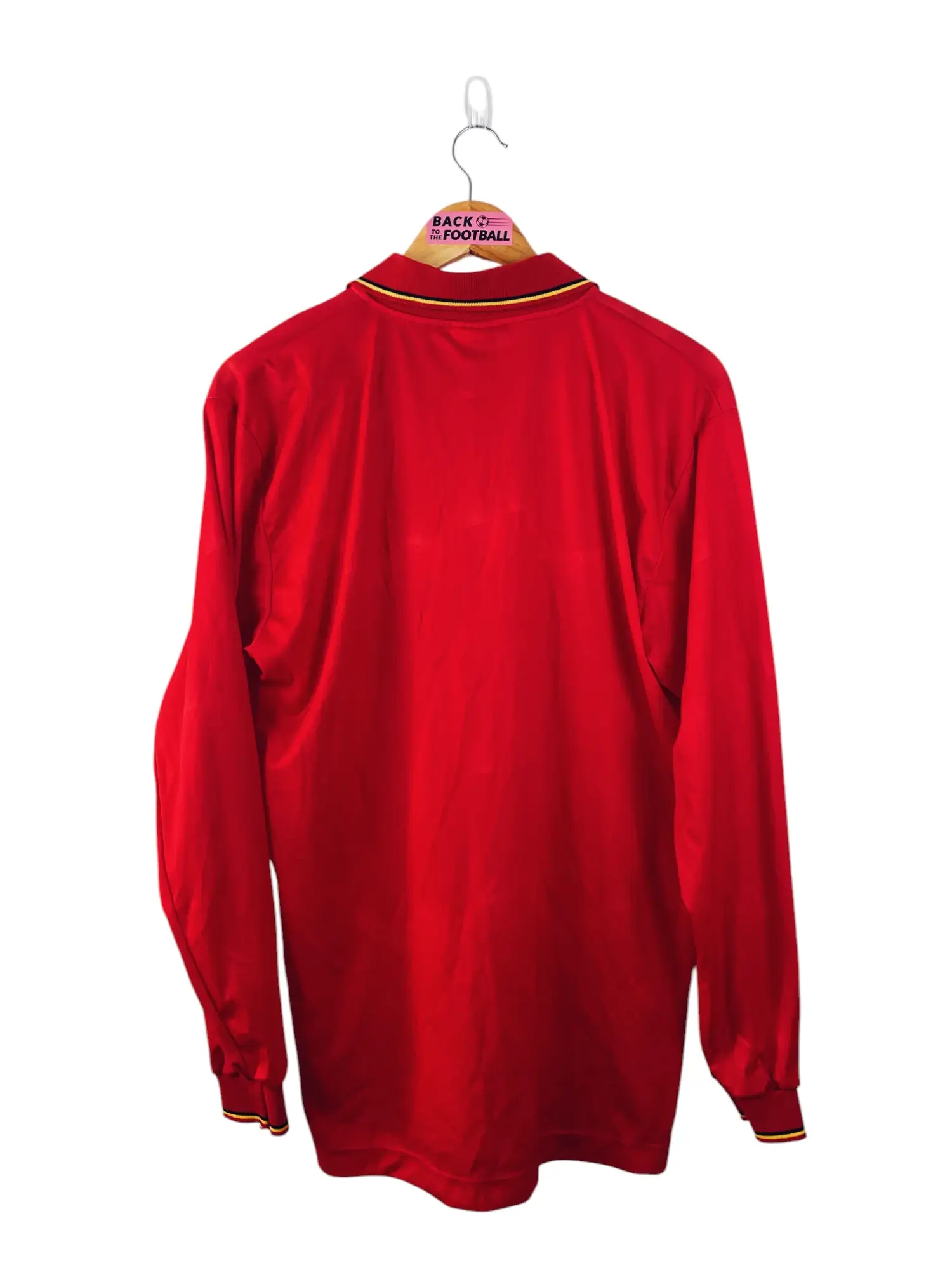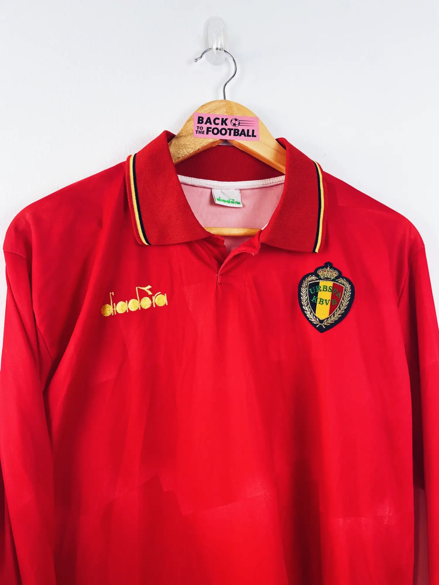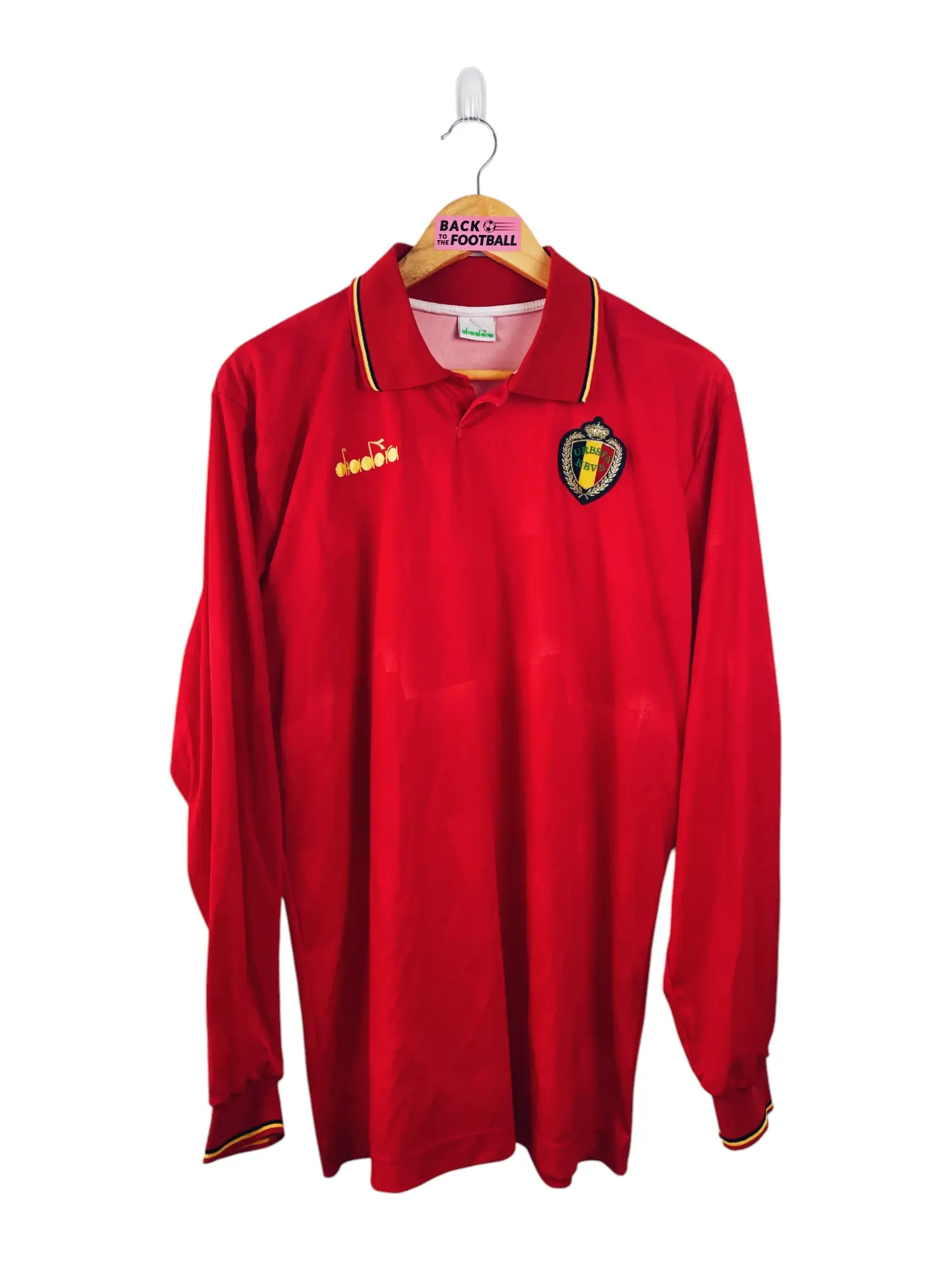 Taille : L Largeur : 54cm (aisselle à aisselle) Longueur : 73cm (base du col au bas) Si tu veux plus de détails, tu peux nous contacter par mail ou sur les réseaux 😉 Etat : 8.5/10, très bon état, minis points noirs (voir photos) Le maillot : maillot vintage domicile de la Belgique 1992 manches longues. L’écusson et le logo Diadora sont brodés. Très beau maillot rétro de la Belgique ! Histoire : les Diables Rouges ne sont pas qualifiés pour l’Euro 1992 (8 équipes seulement). Par contre, ils valident leur ticket pour le mondial 1994 avec une deuxième…