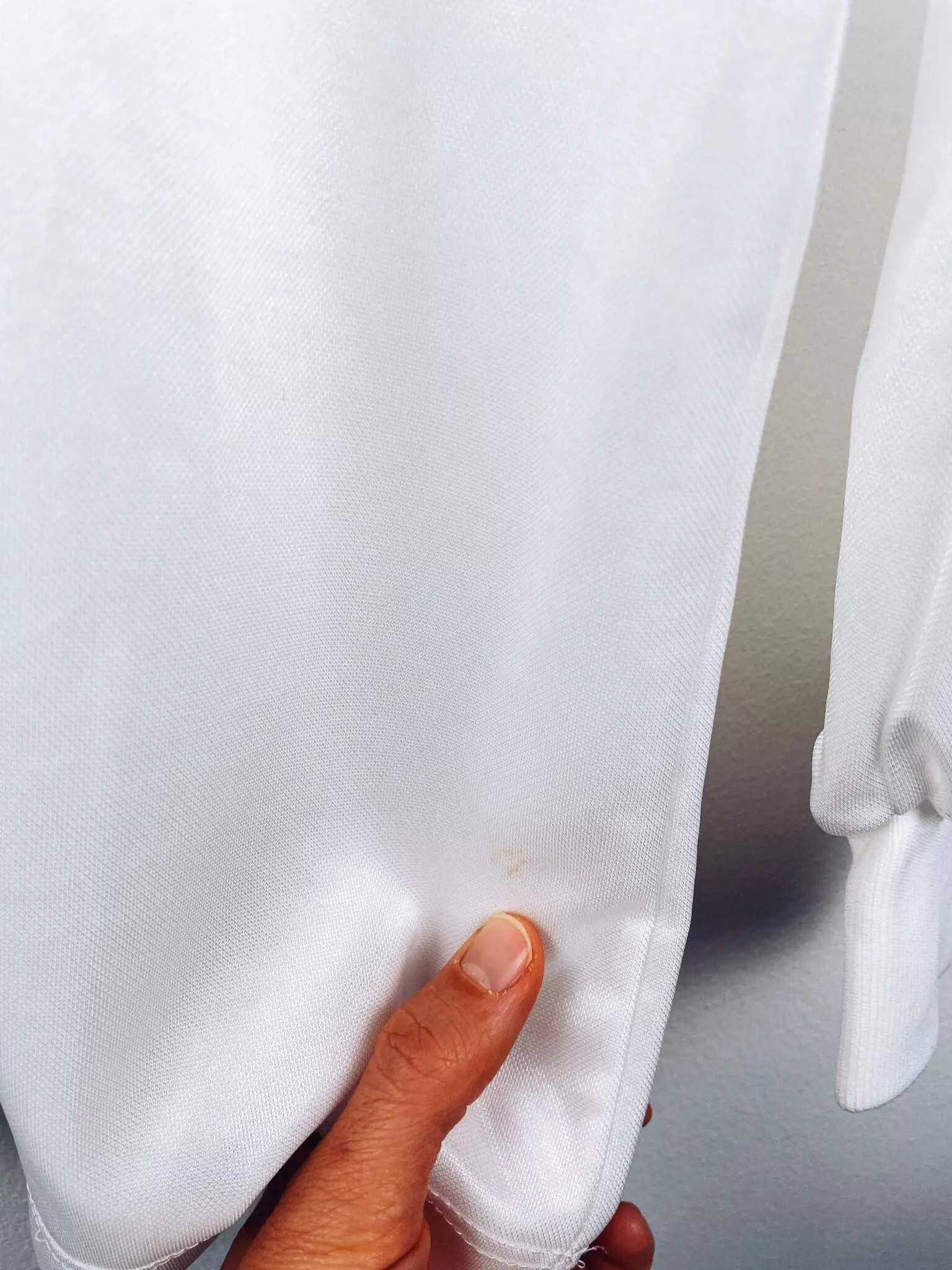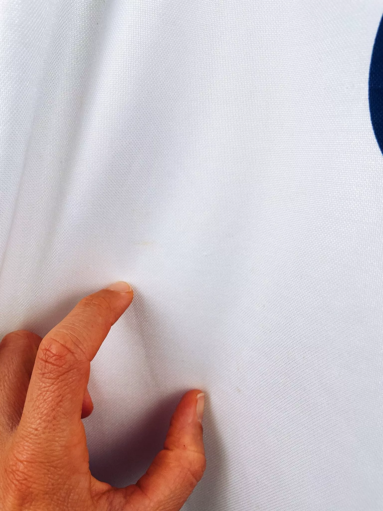 Taille : L – taille oversize Largeur : 57cm (aisselle à aisselle) Longueur : 77cm (base du col au bas) Si tu veux plus de détails, tu peux nous contacter par mail ou sur les réseaux 😉 Etat : 8/10, très bon état hormis des petites traces (voir photos) Le maillot : maillot vintage domicile de l’OM 1993/1994 manches longues. L’écusson est en feutrine, le logo Adidas et le sponsor Eurest sont incrustés. Très beau maillot rétro de l’Olympique de Marseille ! Histoire : l’OM de Bernard Tapie termine à la 2ème place du championnat. Les phocéens iront jusqu’en quart…