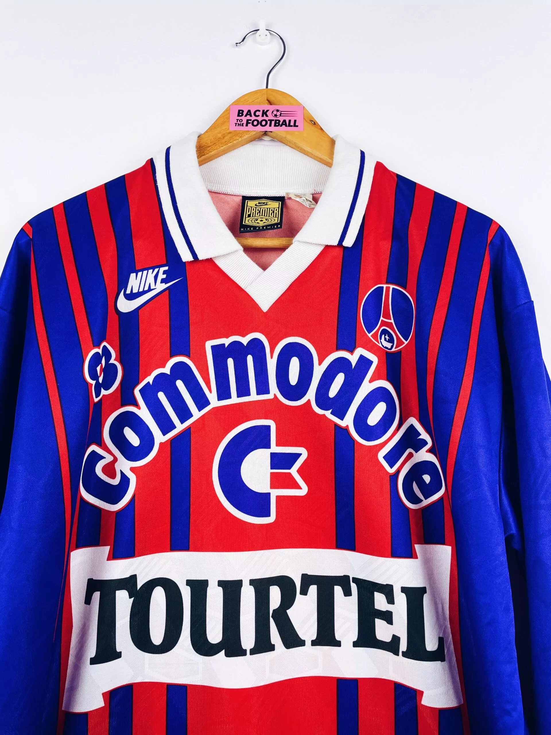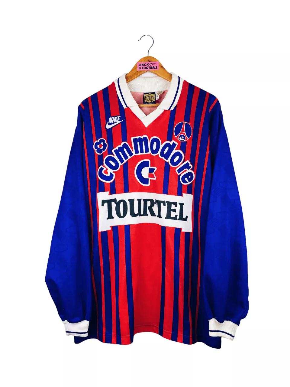 Taille : L Si tu veux plus de détails, tu peux nous contacter par mail ou sur les réseaux 😉 Etat : 8.5/10, excellent état Le maillot : maillot vintage domicile du PSG 1993/1994 manches longues. L’écusson, le logo Nike et les sponsors Commodore et Tourtel sont incrustés au maillot. Très beau maillot rétro du PSG ! Histoire : énorme saison des parisiens qui remporteront leur deuxième championnat de leur histoire, devant notamment l’Olympique de Marseille… Ils ne quitteront pas leur 1ère place depuis la 13ème journée, avec seulement 3 défaites cette saison. En coupe de France, ils seront éliminés…