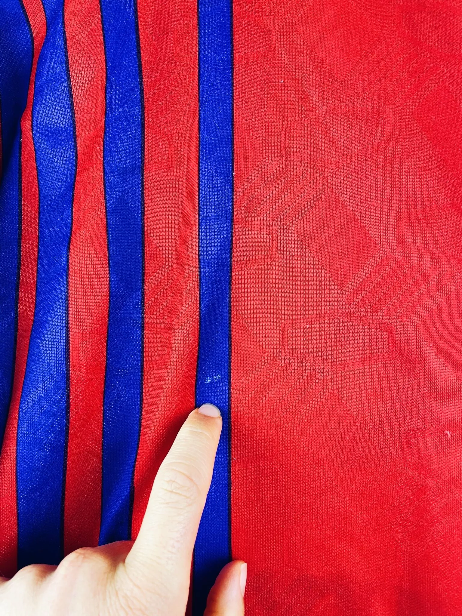 Taille : S Largeur : 51cm (aisselle à aisselle) Longueur : 71cm (base du col au bas) Si tu veux plus de détails, tu peux nous contacter par mail ou sur les réseaux 😉 Etat : 7.5/10, bon état mais des accrocs et des minis traces dans le dos (voir photos) Le maillot : maillot vintage domicile du PSG 1993/1994. L’écusson, le logo Nike et les sponsors Commodore et Tourtel sont incrustés au maillot. Très beau maillot rétro du PSG ! Histoire : énorme saison des parisiens qui remporteront leur deuxième championnat de leur histoire, devant notamment l’Olympique de Marseille……