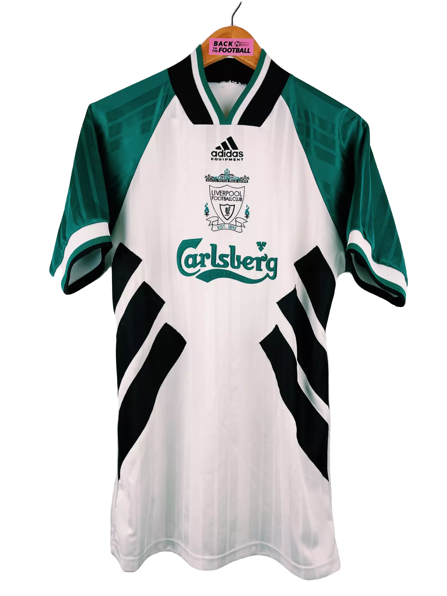 La taille : M/L Etat : bon état, l’étiquette au niveau de l’intérieur du col a été arrachée et il y a 2 micros taches en haut du dos Le maillot : maillot extérieur vintage de Liverpool pour les saisons 1993 à 1995, vert et blanc avec les bandes Adidas sur le côté. L’ancien écusson du club est magnifique, en feutrine, avec les deux flammes pour le drame de Hillsborough et le slogan iconique « You’ll never walk alone ». Le sponsor Carlsberg est aussi en feutrine. Histoire : sur la première saison, Liverpool finit 8ème du championnat et n’ira pas plus…