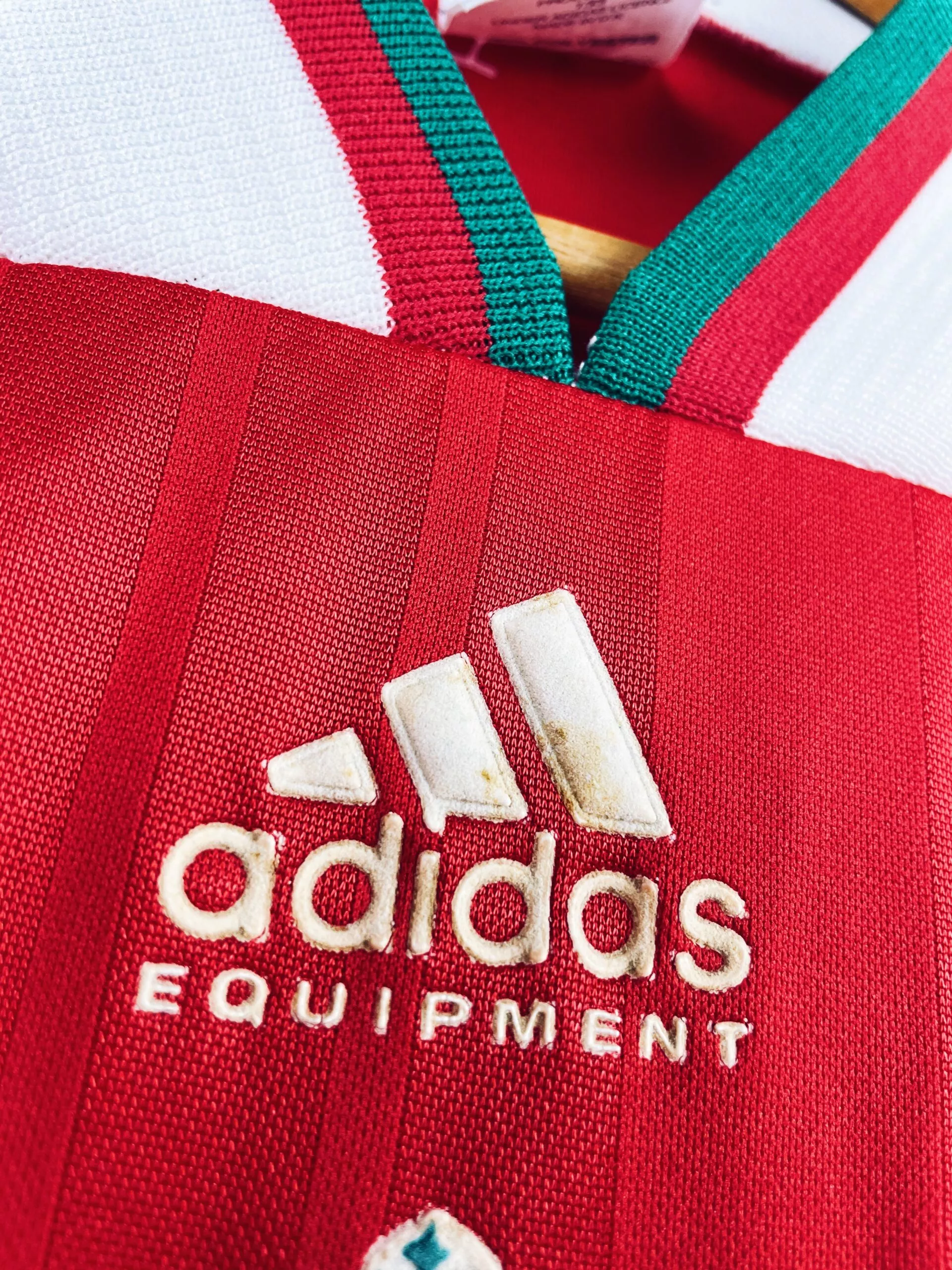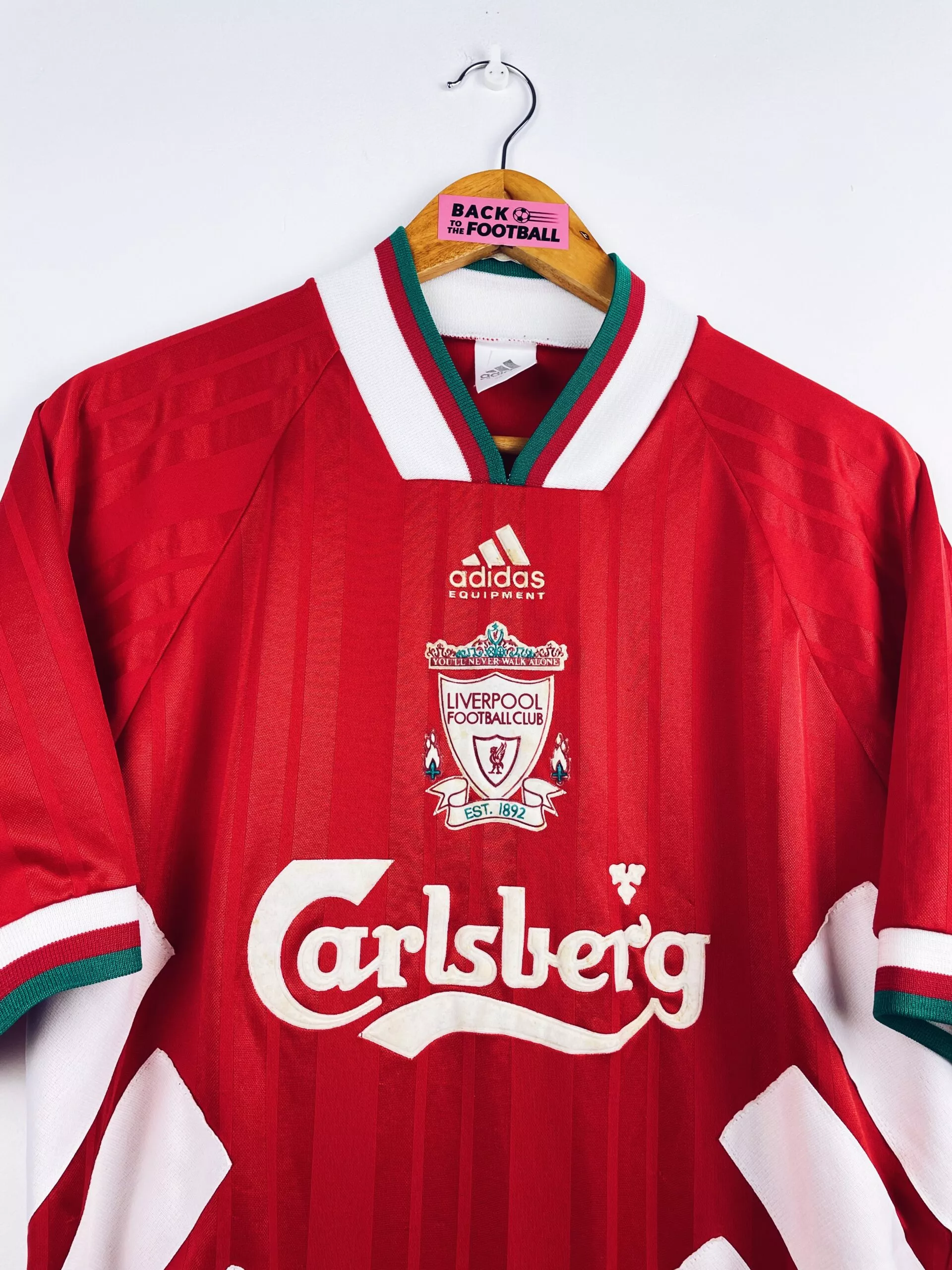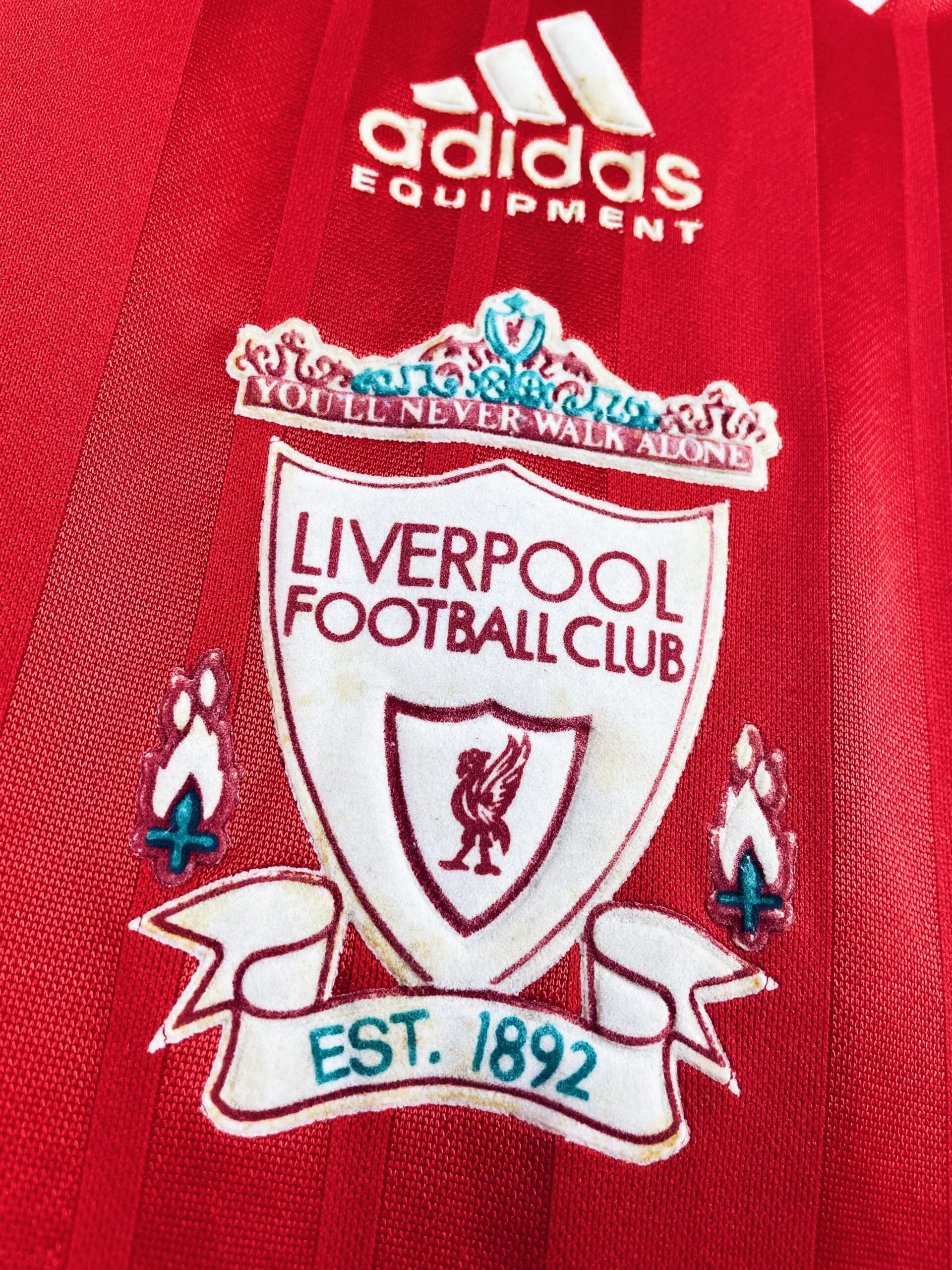 La taille : M Si tu veux plus de détails, tu peux nous contacter par mail ou sur les réseaux 😉 Etat : 8/10, très bon état, logo Adidas un peu abimé, quelques bouloches (voir photos) Le maillot : maillot vintage domicile de Liverpool 1993/1995. L’ancien écusson du club est magnifique, en feutrine, avec les deux flammes pour le drame de Hillsborough et le slogan iconique « You’ll never walk alone ». Le sponsor Carlsberg et le logo Adidas sont aussi en feutrine. Très beau maillot rétro de Liverpool ! Histoire : sur la première saison, Liverpool finit 8ème du championnat et…