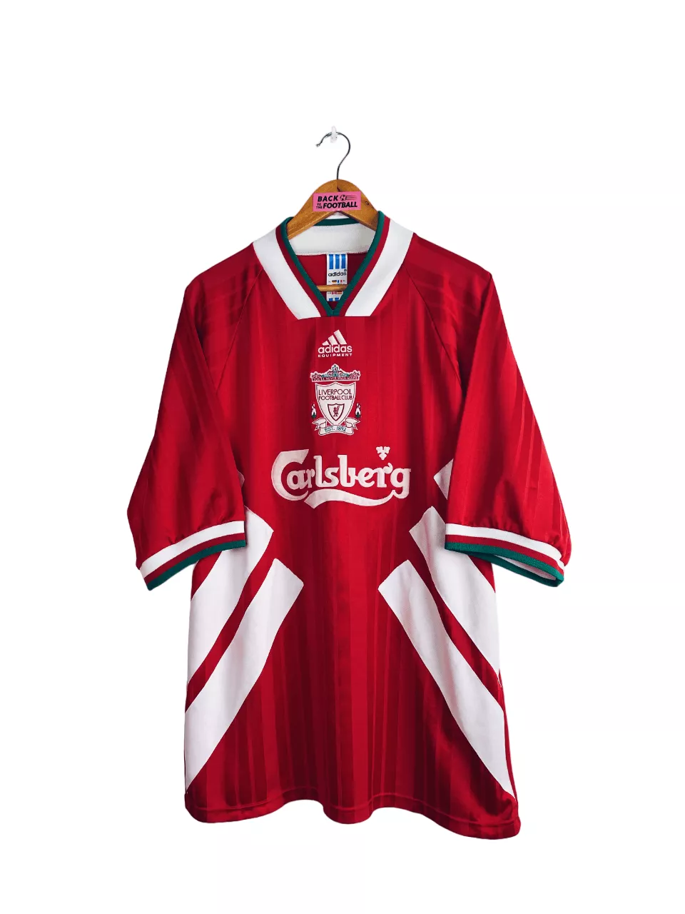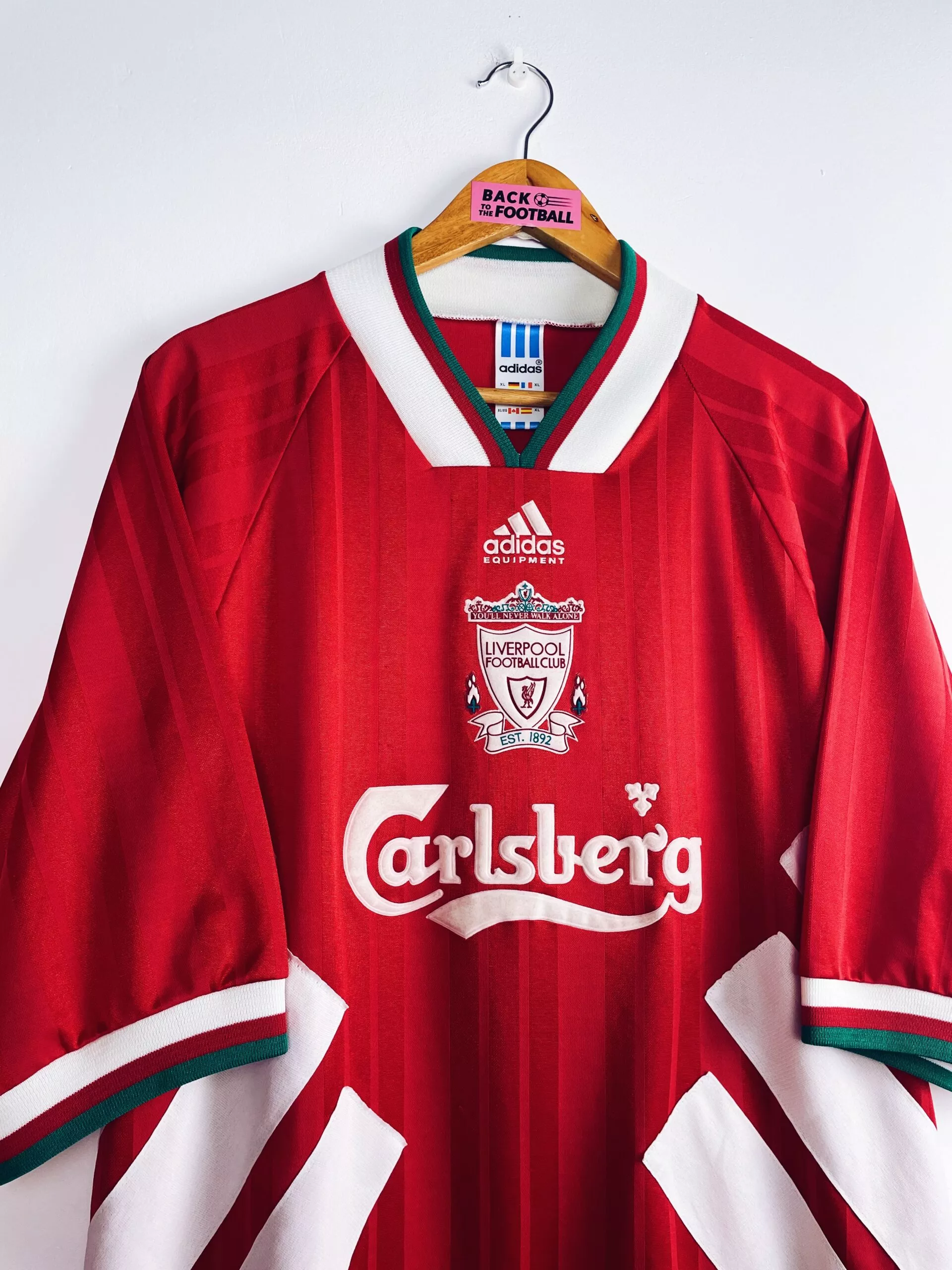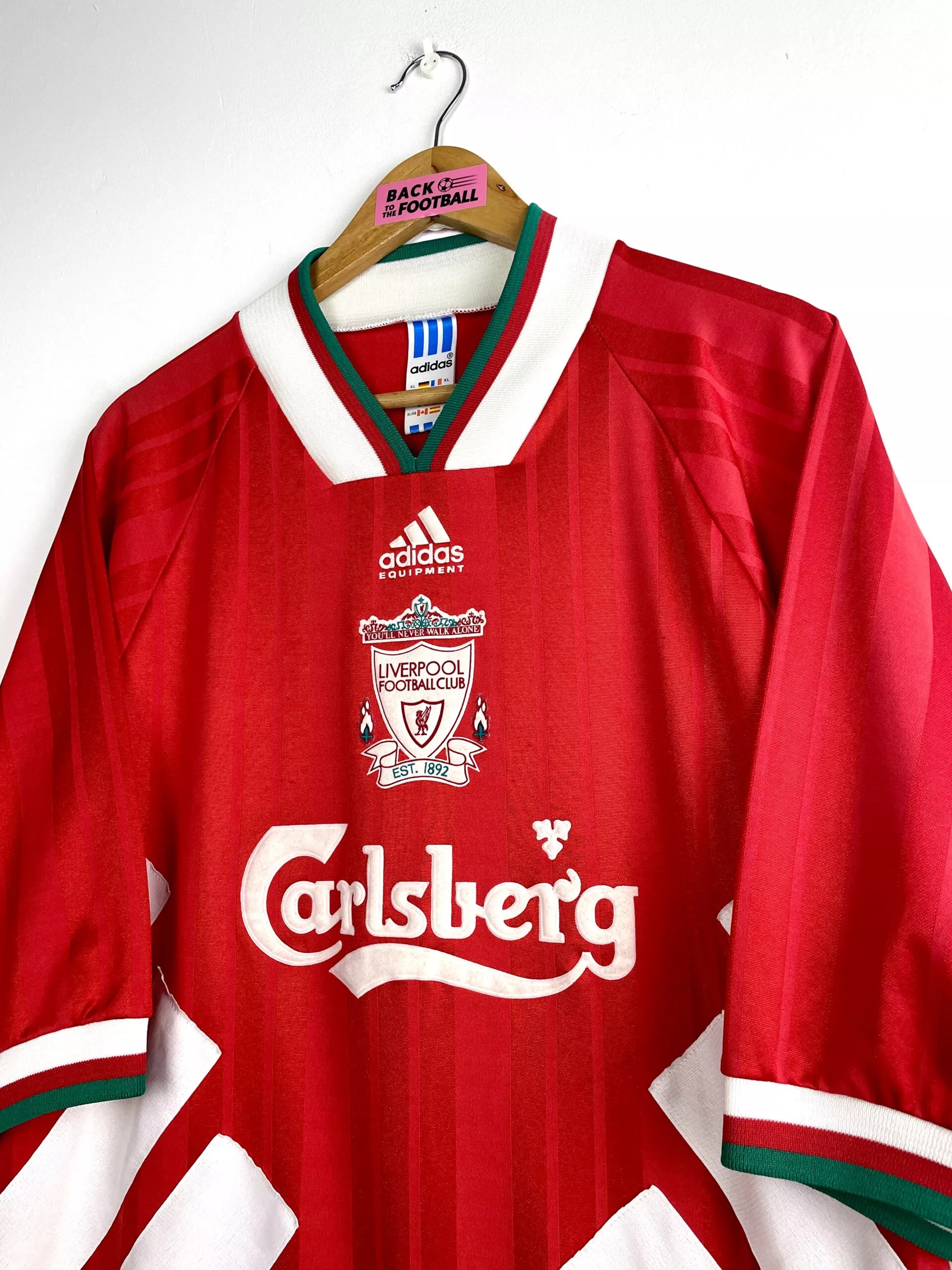La taille : XL Si tu veux plus de détails, tu peux nous contacter par mail ou sur les réseaux 😉 Etat : 8/10, très bon état, quelques légères bouloches (voir photo) Le maillot : maillot vintage domicile de Liverpool 1993/1995. L’ancien écusson du club est magnifique, en feutrine, avec les deux flammes pour le drame de Hillsborough et le slogan iconique « You’ll never walk alone ». Le sponsor Carlsberg et le logo Adidas sont aussi en feutrine. Très beau maillot rétro de Liverpool ! Histoire : sur la première saison, Liverpool finit 8ème du championnat et n’ira pas plus loin…