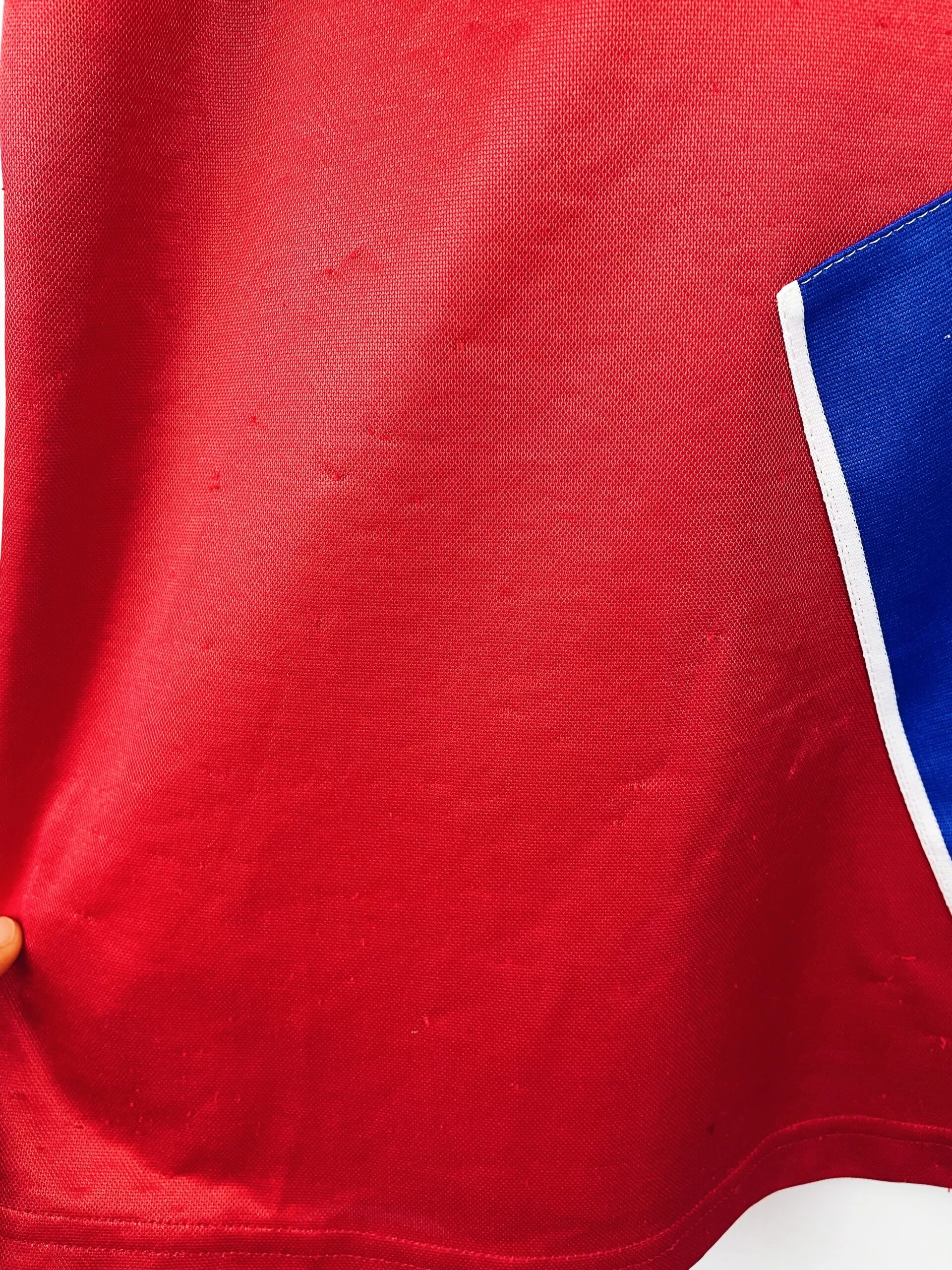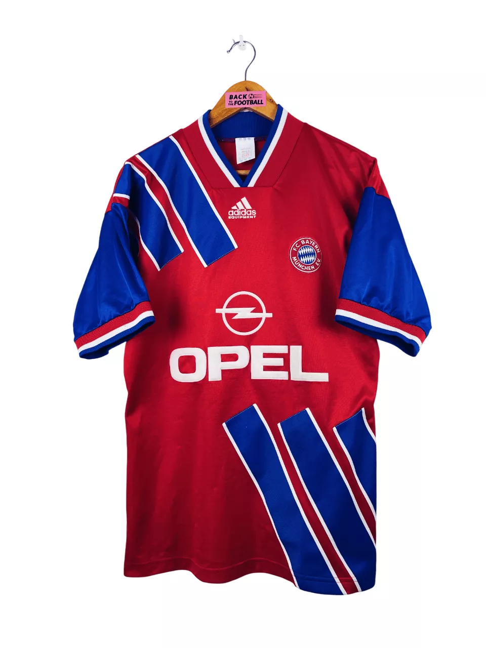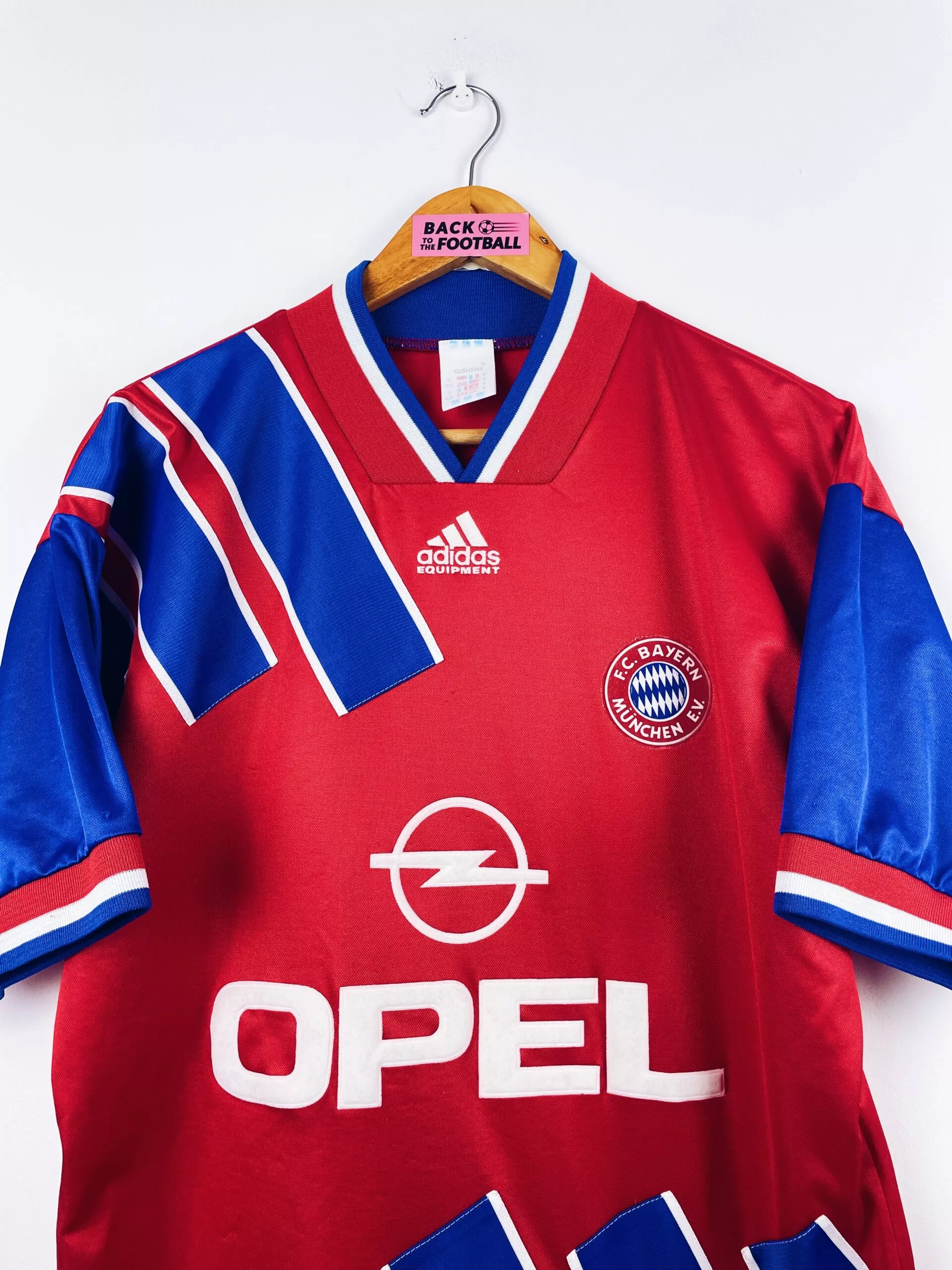 Taille : M Largeur : 51cm (aisselle à aisselle) Longueur : 73cm (base du col au bas) Si tu veux plus de détails, tu peux nous contacter par mail ou sur les réseaux 😉 Etat : 7.5/10, très bon état général mais des bouloches et une micro trace en bas du maillot (voir photos) Le maillot : maillot vintage domicile du Bayern Munich 1993/1995. L’écusson, le logo Adidas et le sponsor Opel sont en feutrine. Très beau maillot rétro du Bayern ! Histoire : Le Bayern sera champion de Bundesliga la première saison, à 1 point d’écart avec Kaiserslautern. Scholl…