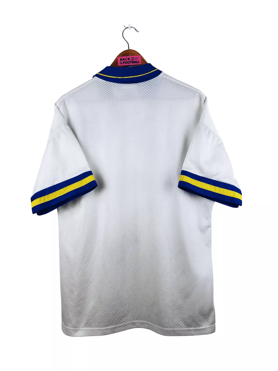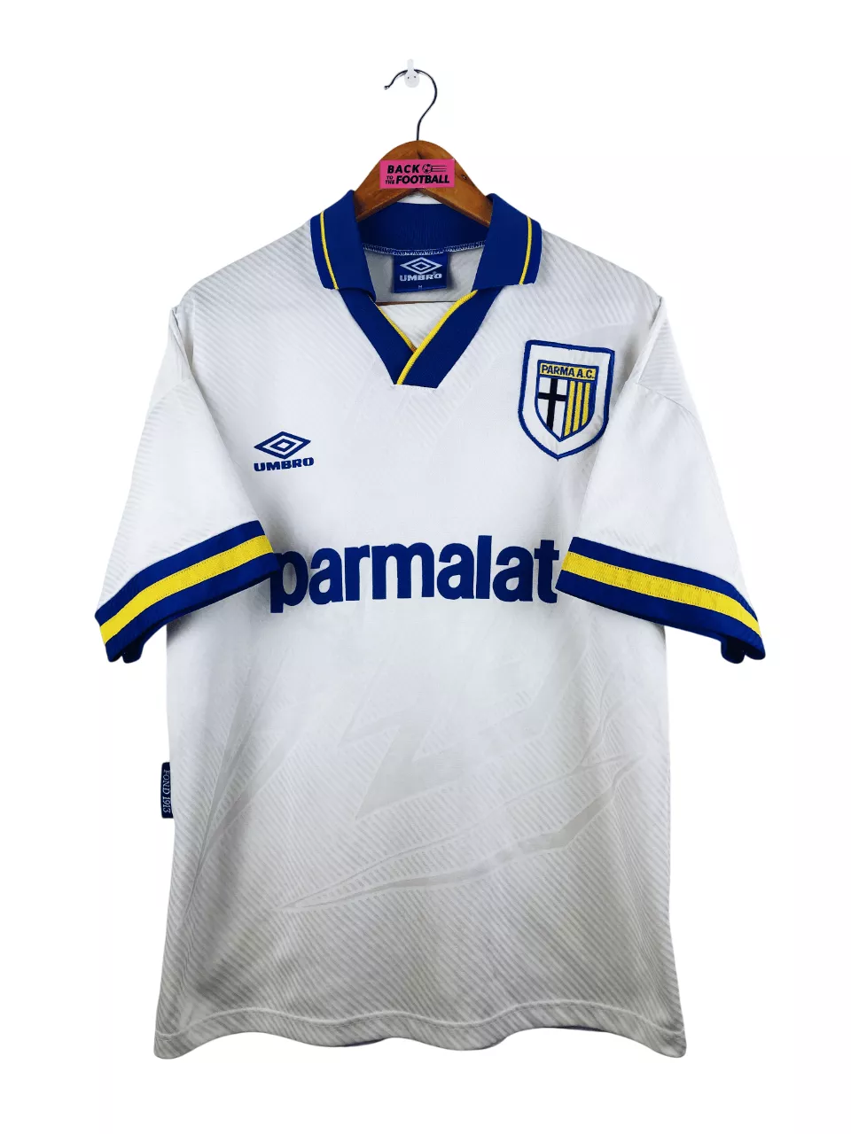 Taille : M Largeur : 53cm (aisselle à aisselle) Longueur : 71cm (base du col au bas) Si tu veux plus de détails, tu peux nous contacter par mail ou sur les réseaux 😉 Etat : 9/10, excellent état Le maillot : maillot vintage domicile de Parme 1993/1995. L’écusson et le logo Umbro sont brodés, le sponsor Parmalat est en feutrine. Les motifs en tramé sont magnifiques. Très beau maillot rétro de Parma ! Histoire : la 1ère saison, le Parma AC termine 5ème de Serie A. Ils seront défaits en demi de Coupe d’Italie contre la Sampdoria. Ils remportent…