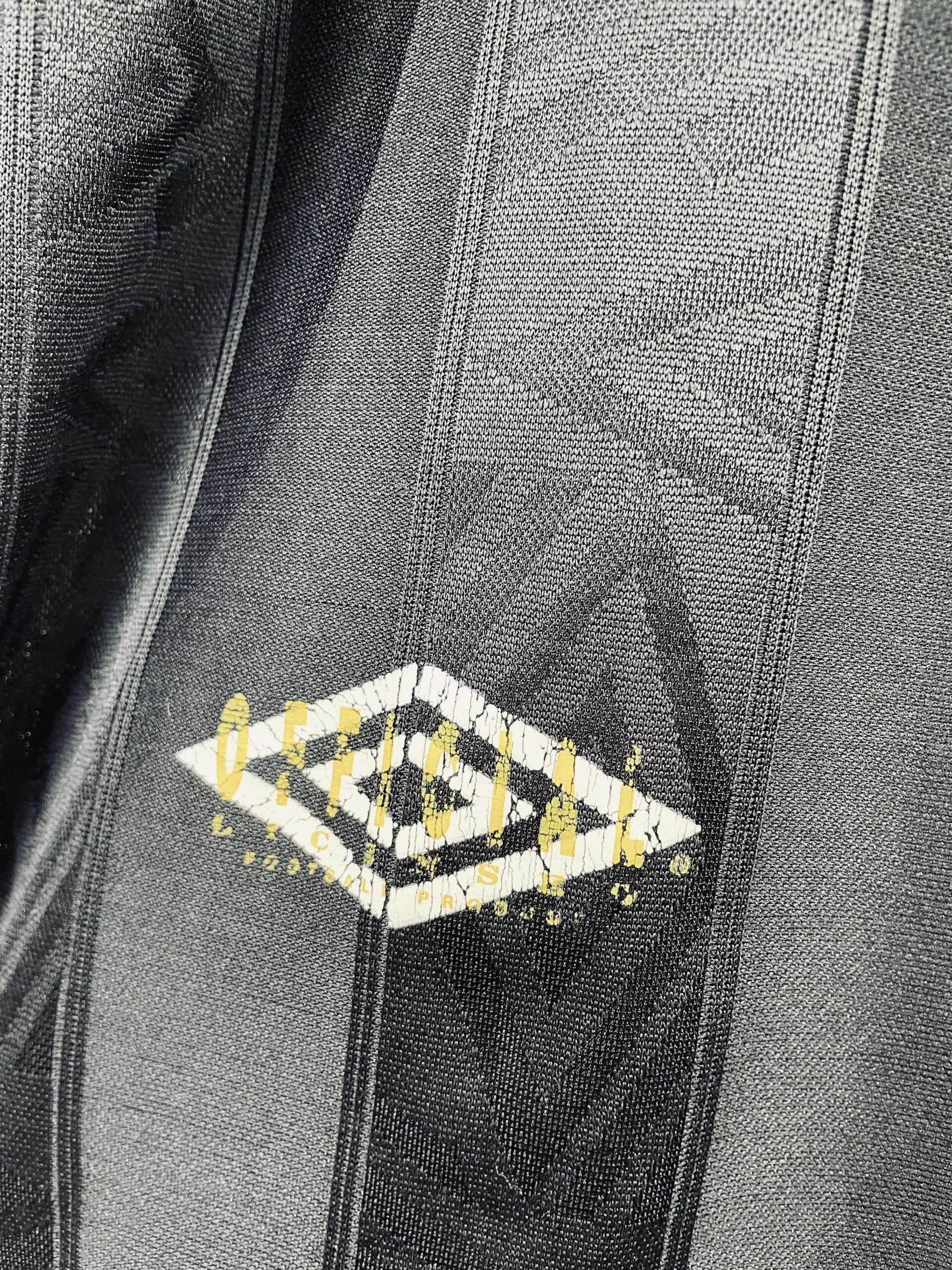Taille : L Largeur : 55cm (aisselle à aisselle) Longueur : 73cm (base du col au bas) Si tu veux plus de détails, tu peux nous contacter par mail ou sur les réseaux 😉 Etat : 8.5/10, excellent état. Mini trace au niveau du flocage (voir photo) Le maillot : maillot vintage extérieur de Manchester United 1993/1995 floqué Cantona #7. Le maillot est tout noir, avec le logo Umbro en tramé sur tout le maillot. L’écusson du club et le logo Umbro sont brodés. Le sponsor Sharp est en feutrine. Cantona #7 au dos aussi. Très beau maillot rétro de…
