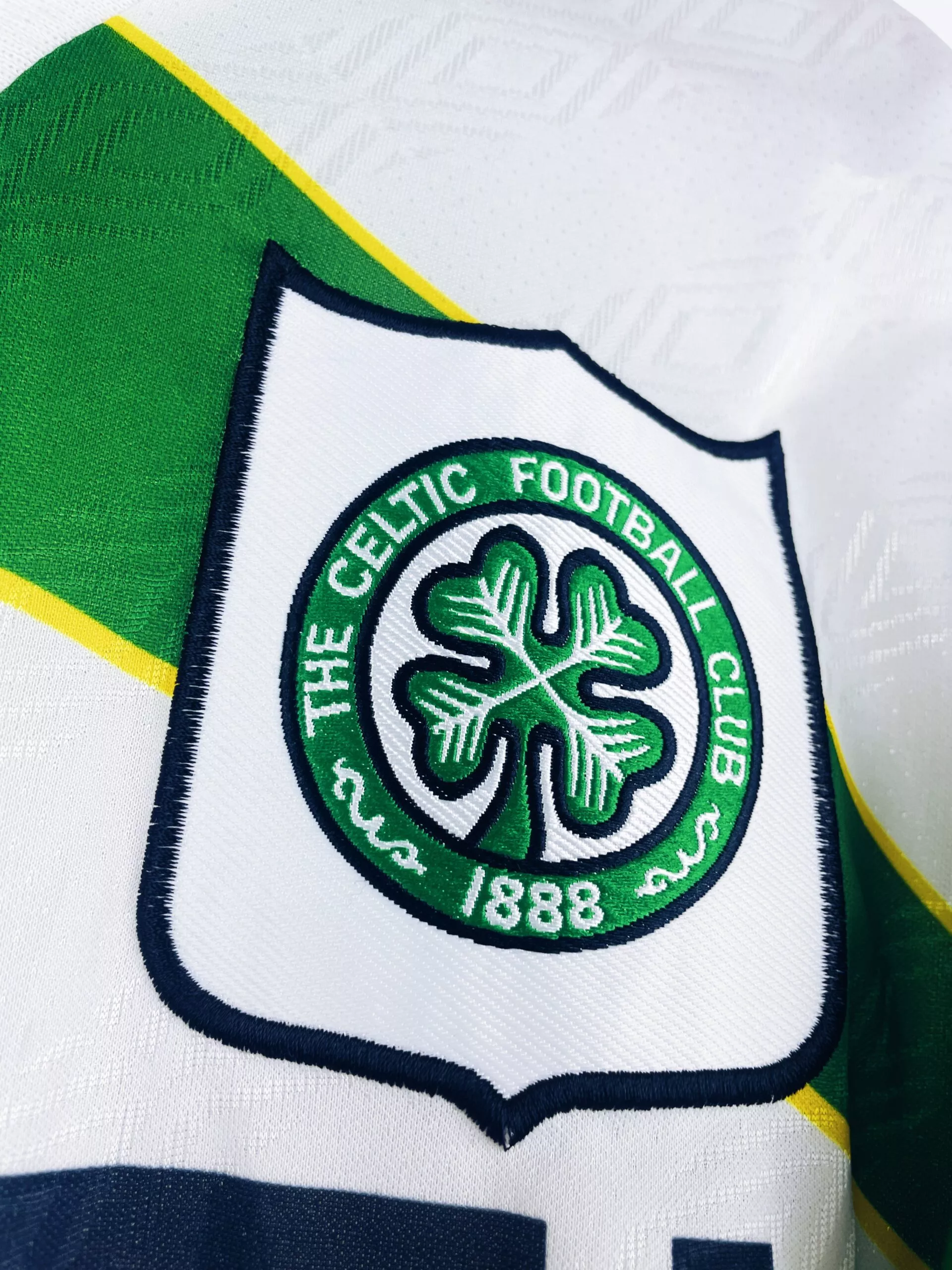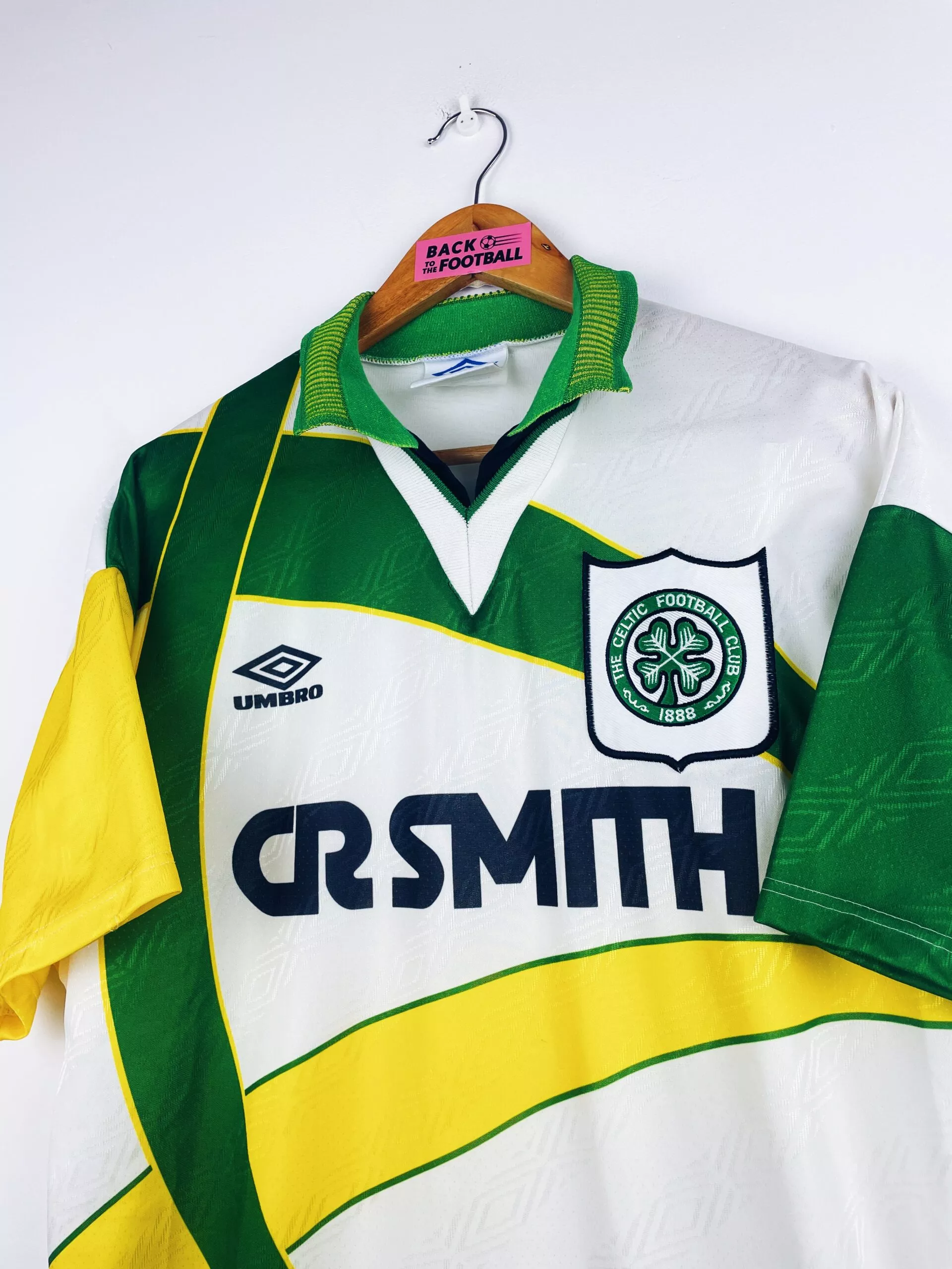 Taille : M Si tu veux plus d’infos, tu peux nous contacter par mail ou sur les réseaux 😉 Etat : 8.5/10, très bon état Le maillot : maillot vintage extérieur du Celtic 1994/1995. L’écusson est brodé, le logo Umbro et le sponsor CR Smith sont incrustés. On peut voir le logo Umbro en tramé sur tout le maillot. Très beau maillot rétro du Celtic Glasgow ! Histoire : le Celtic termine à la 4ème place du championnat écossais. Les Bhoys se rattrapent en remportent la Coupe d’Ecosse face à Airdrieonians. Ils auraient pu faire le doublé avec la Coupe…