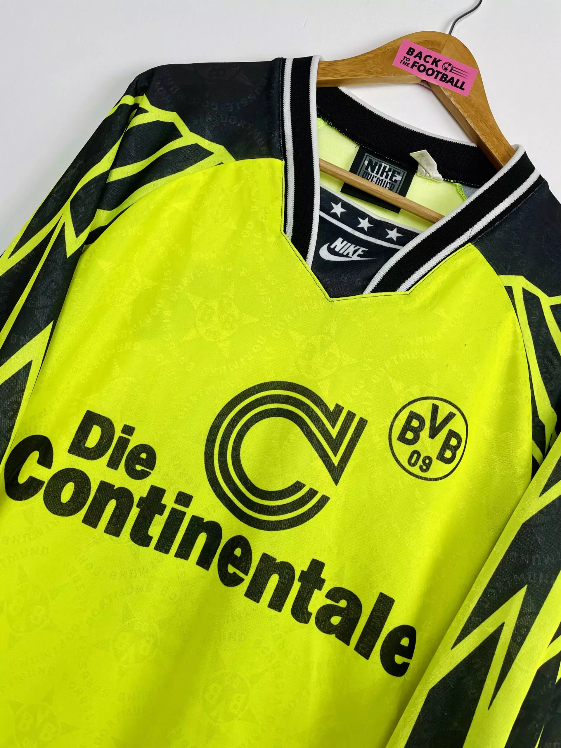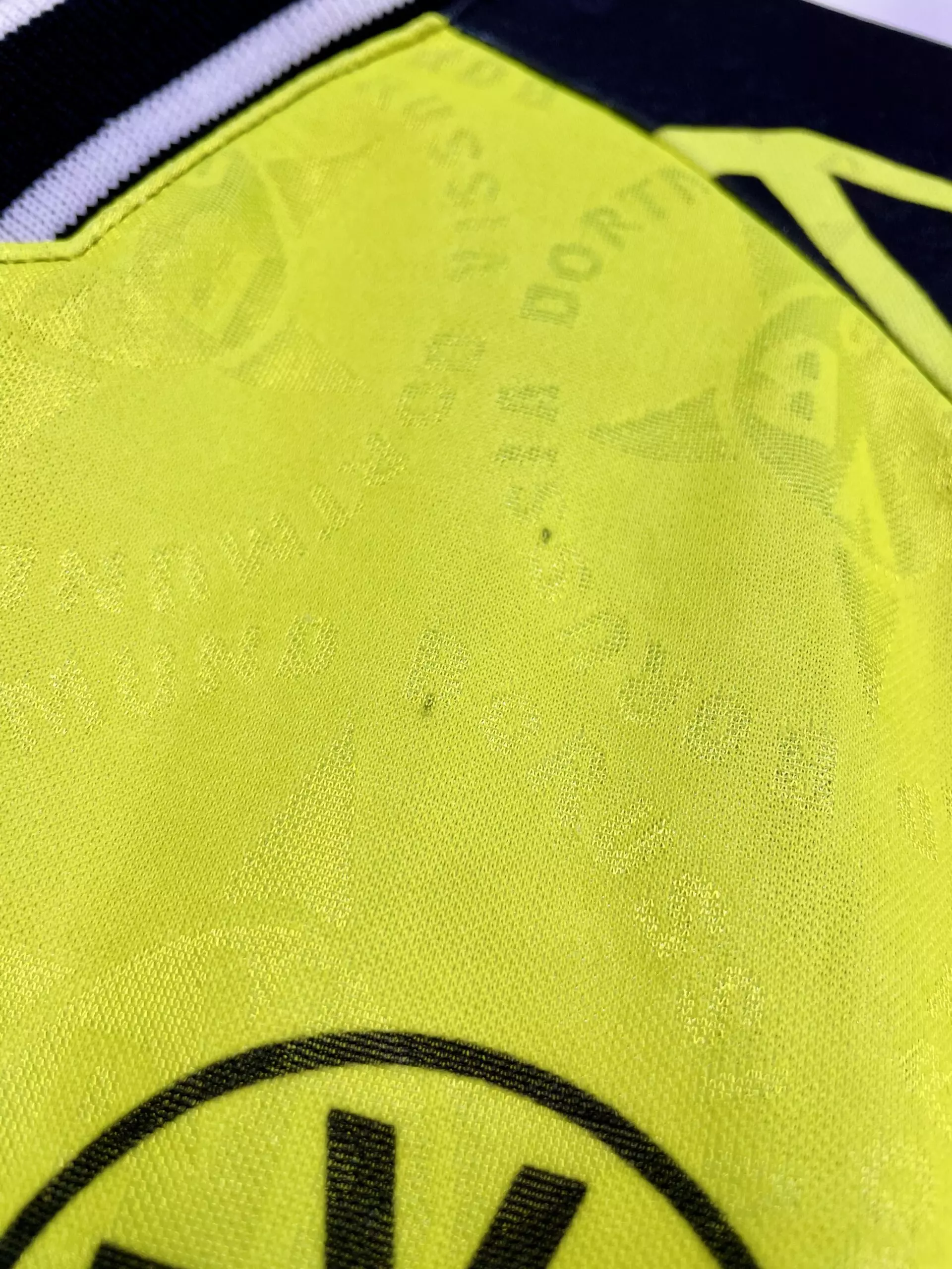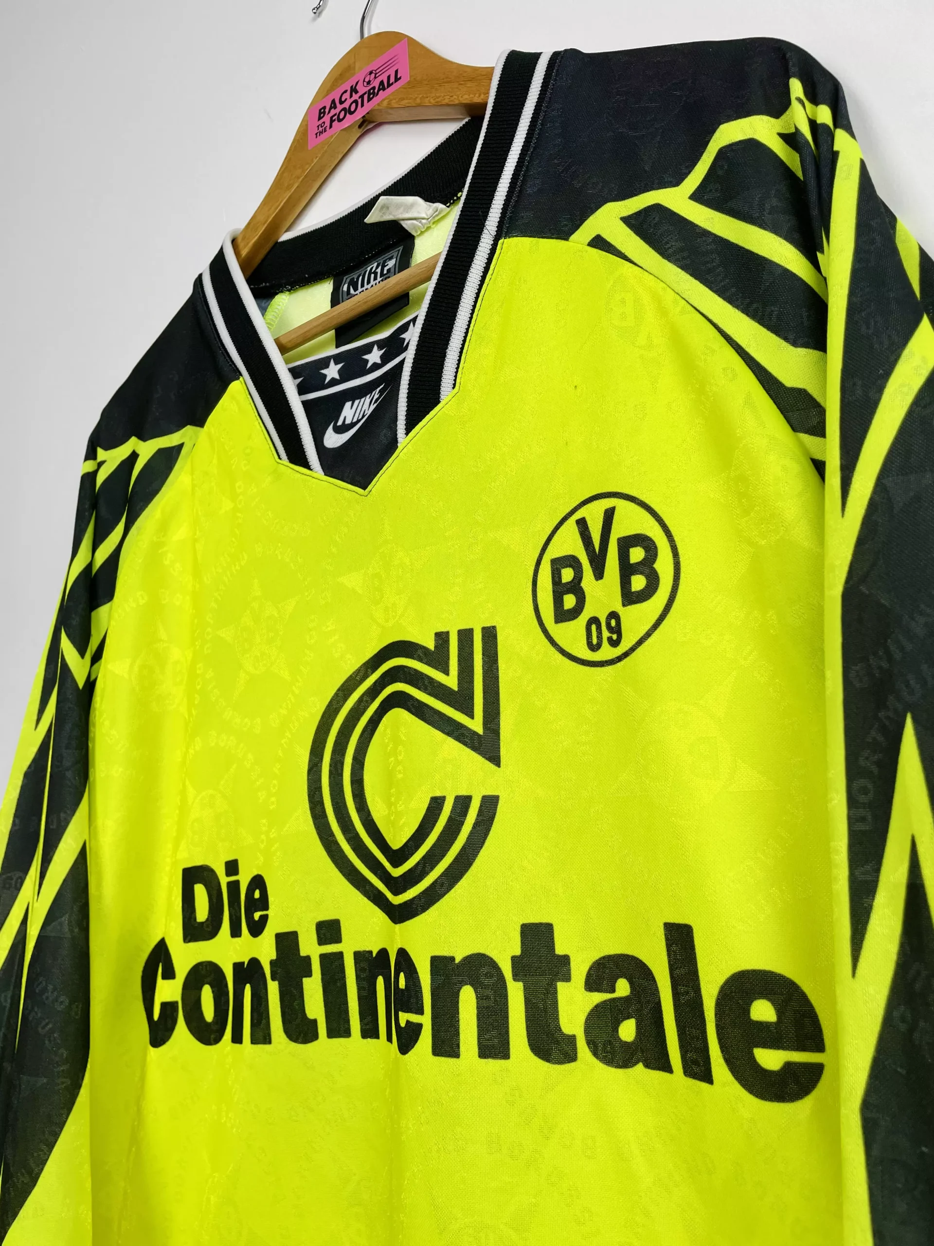 Taille : L Etat : 8/10, très bon état. A noter 2 micros traces (voir photo) Le maillot : maillot vintage domicile Nike de Dortmund, saison 1994/1995. L’écusson, le logo Nike et le sponsor sont incrustés. On peut voir l’écusson en tramé sur tout le maillot. Magnifique maillot rétro du Borussia ! Histoire : 1er titre de champion de Bundesliga pour Dortmund ! Ils finissent un point devant le Werder Breme. En coupe UEFA, Dortmund sera éliminé en demi-finale face à la Juventus, 4-3 score cumulé.