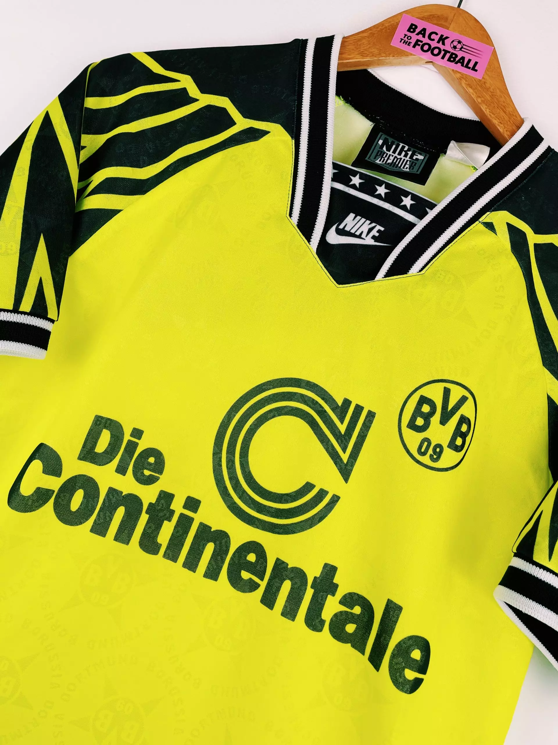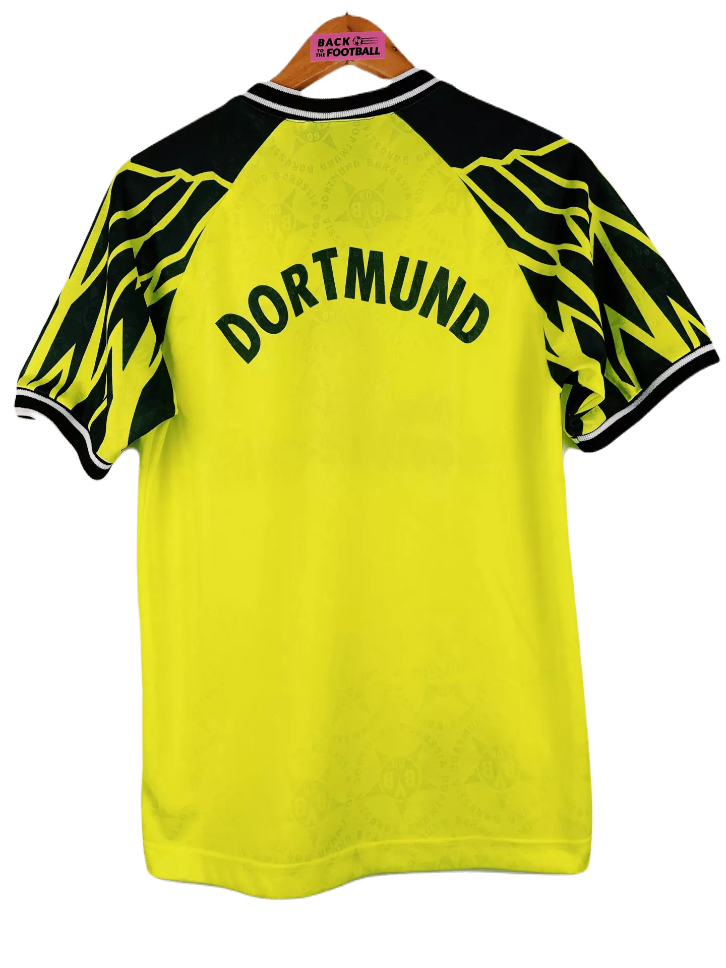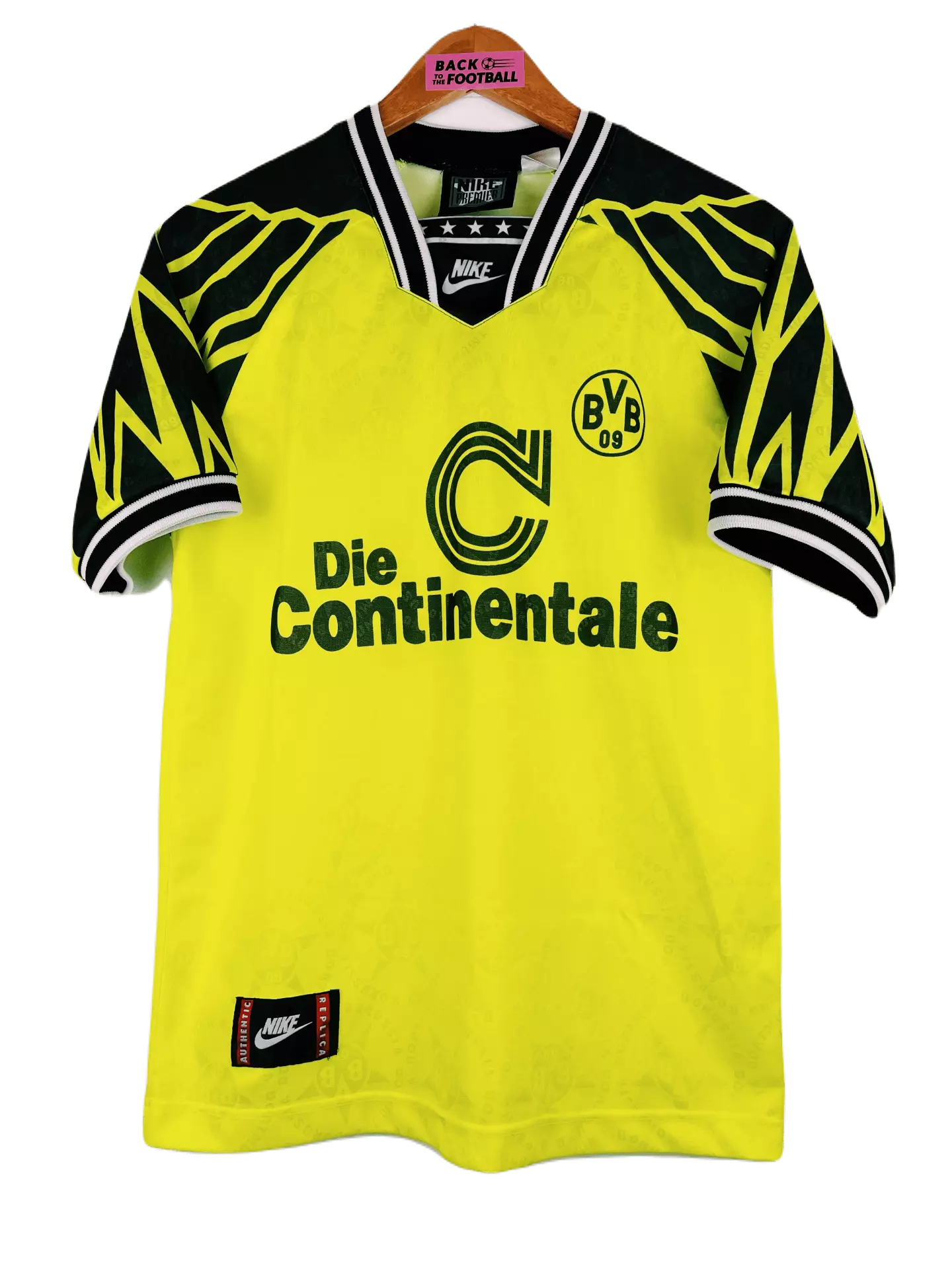 Taille : M Etat : très bon état Le maillot : maillot vintage domicile Nike de Dortmund, saison 1994/1995. L’écusson, le logo Nike et le sponsor sont incrustés. On peut voir l’écusson en tramé sur tout le maillot. Magnifique ! Histoire : 1er titre de champion de Bundesliga pour Dortmund ! Ils finissent un point devant le Werder Breme. En coupe UEFA, Dortmund sera éliminé en demi-finale face à la Juventus, 4-3 score cumulé.